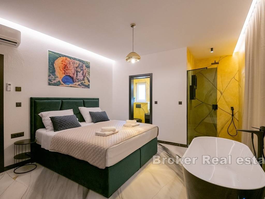On the first floor of the villa, there are four luxurious bedrooms, each with its own bathroom and bathtub, and an enchanting view of nature.
