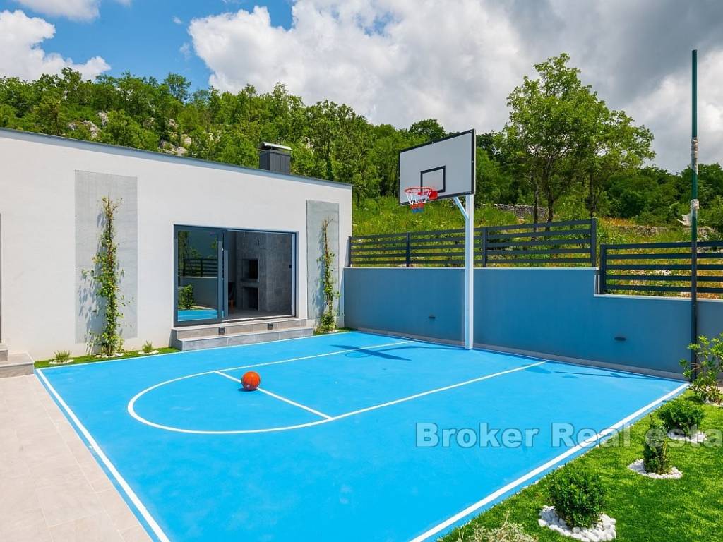 Within this luxury villa there is a childrens playground and a basketball court, providing great opportunities for outdoor play and sports.