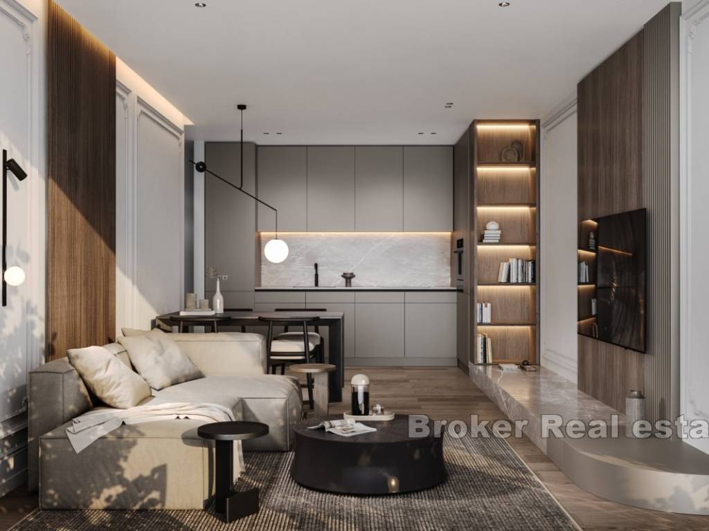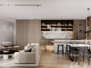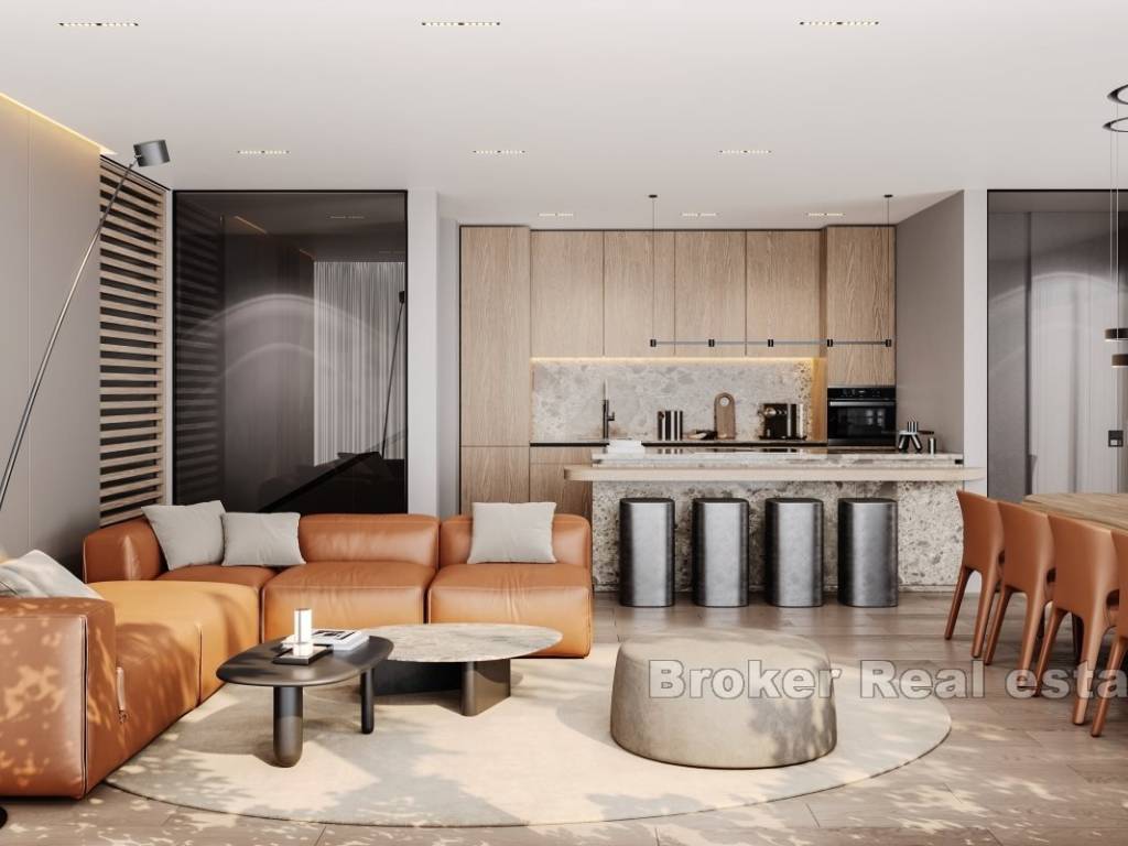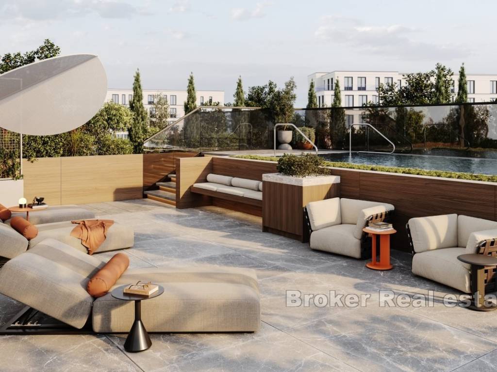 A beautiful two-bedroom apartment with a closed area of 105 m2 and 64 m2 of open area with an infinity pool of 22.5 m2 is located on the 2nd floor. It consists of an entrance staircase, a luxurious open space living room with kitchen and dining room, access to the terrace with a swimming pool, a master bedroom with a walk-in wardrobe, a bedroom, two bathrooms and a study. Each room has a separate access to the terrace.