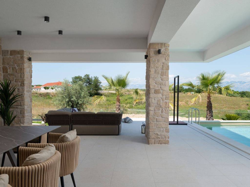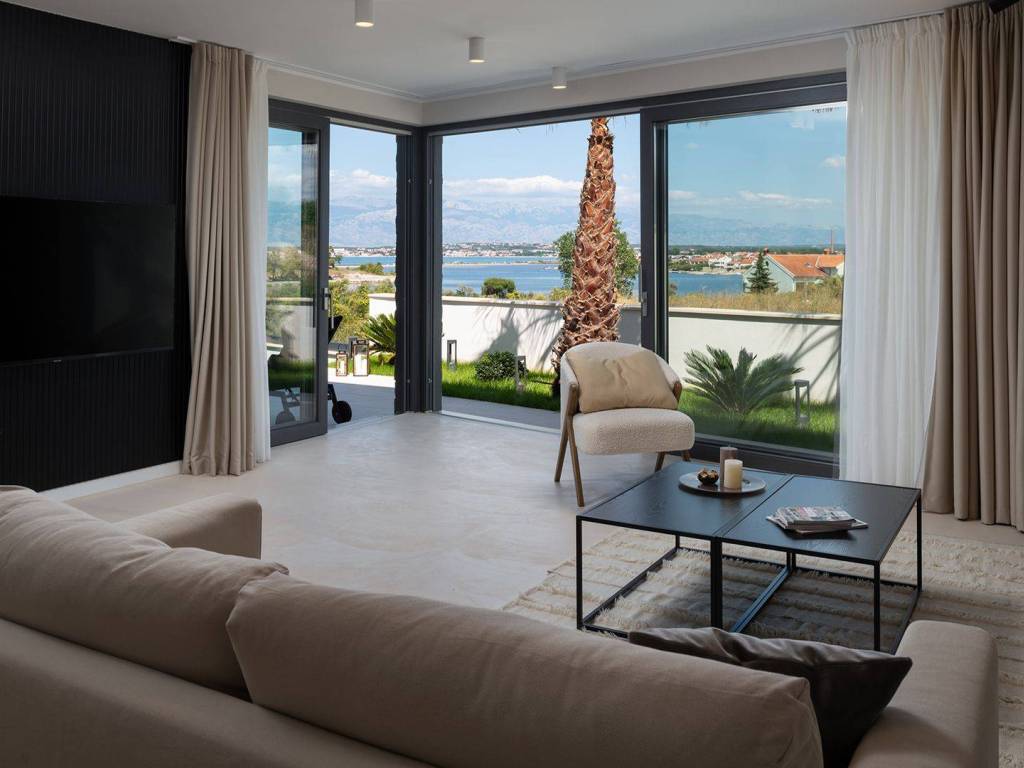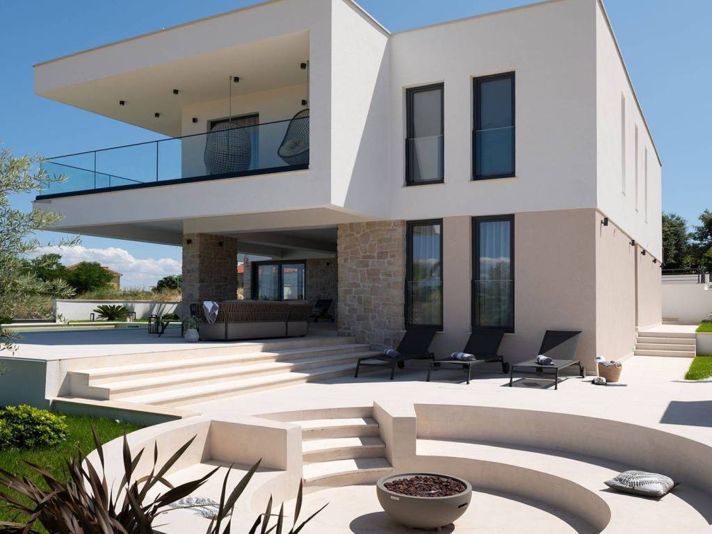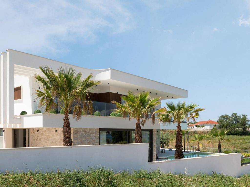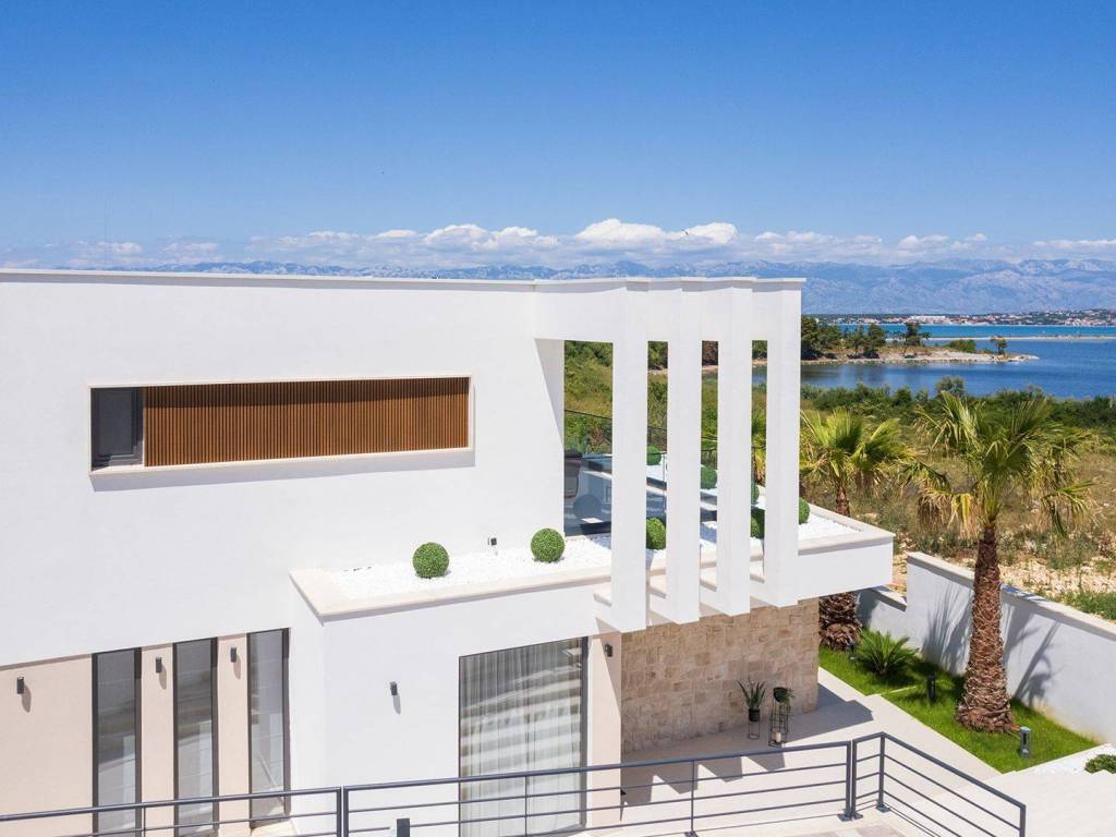 Luxury villa with pool and sea view located in a quiet location in Zadar, 130 m from the sea. The villa with a total living area of 277 m2 is located on a plot of land of 632 m2, and consists of a ground floor and the first floor. On the ground floor there is an open concept kitchen, dining room and living room, one bedroom with its own bathroom. From the living room there is access to a spacious terrace which leads to a heated pool of 38 m2 with a sun deck and outdoor furniture. The first floor consists of three bedrooms with private bathrooms, one of which has a wardrobe. All rooms have access to the terrace with sliding glass walls which offers a stunning open view of the sea. The villa is under video surveillance and fully air-conditioned, electric underfloor heating installed in the bathrooms, living room and dining room. The landscaped cultivated garden is fenced and offers private parking spaces with an electric charger. Close to the sandy beach and all necessary facilities for living.
