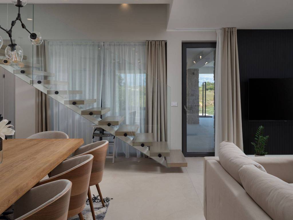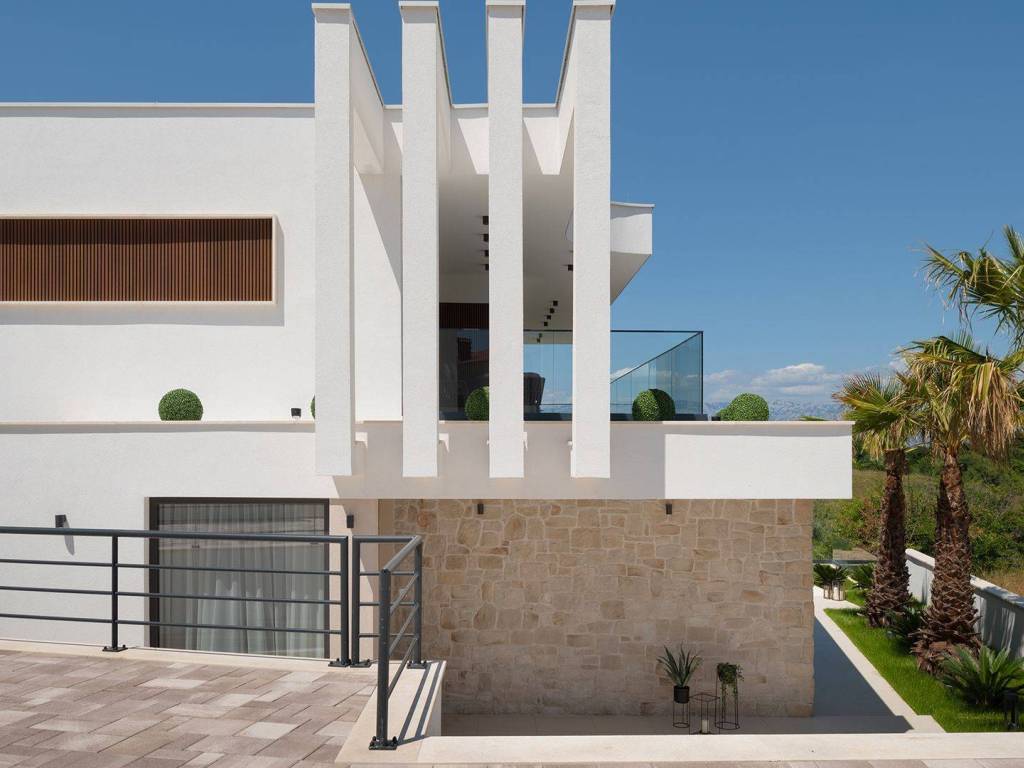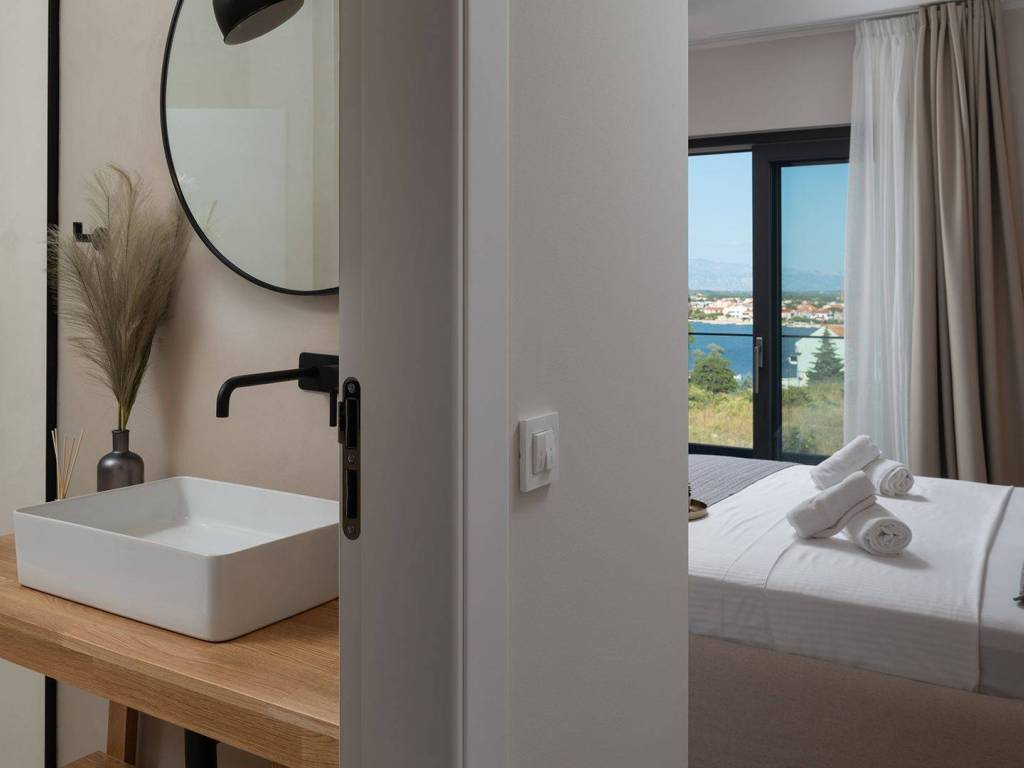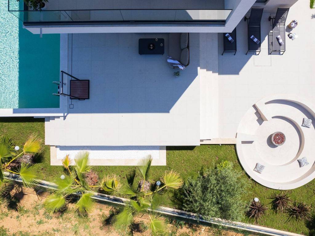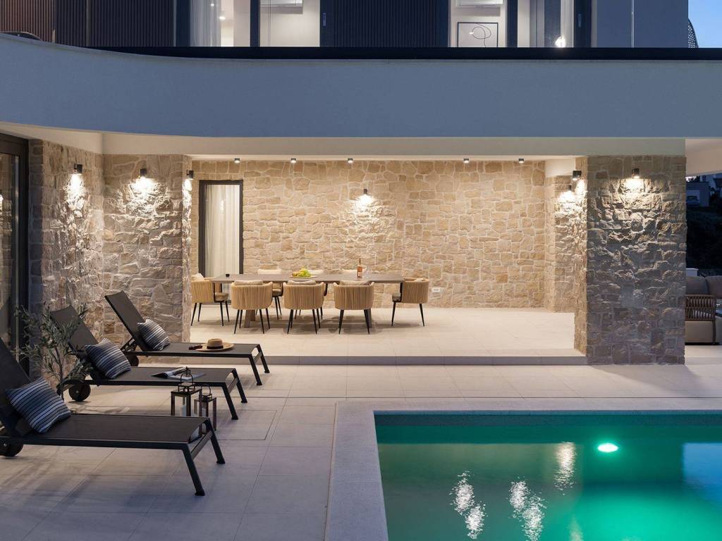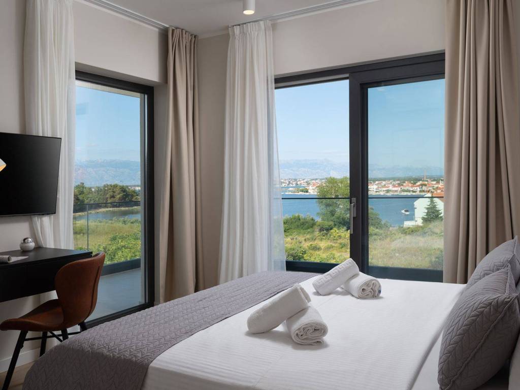 Luxury villa with pool and sea view located in a quiet location in Zadar, 130 m from the sea. The villa with a total living area of 277 m2 is located on a plot of land of 632 m2, and consists of a ground floor and the first floor. On the ground floor there is an open concept kitchen, dining room and living room, one bedroom with its own bathroom. From the living room there is access to a spacious terrace which leads to a heated pool of 38 m2 with a sun deck and outdoor furniture. The first floor consists of three bedrooms with private bathrooms, one of which has a wardrobe. All rooms have access to the terrace with sliding glass walls which offers a stunning open view of the sea. The villa is under video surveillance and fully air-conditioned, electric underfloor heating installed in the bathrooms, living room and dining room. The landscaped cultivated garden is fenced and offers private parking spaces with an electric charger. Close to the sandy beach and all necessary facilities for living.