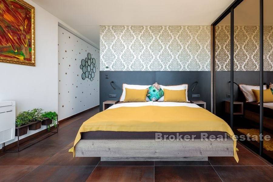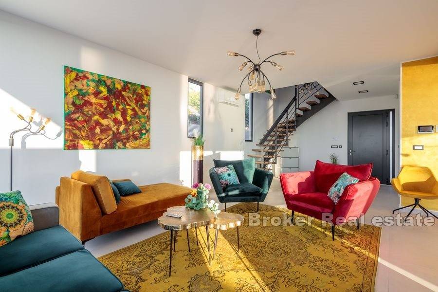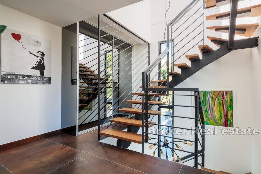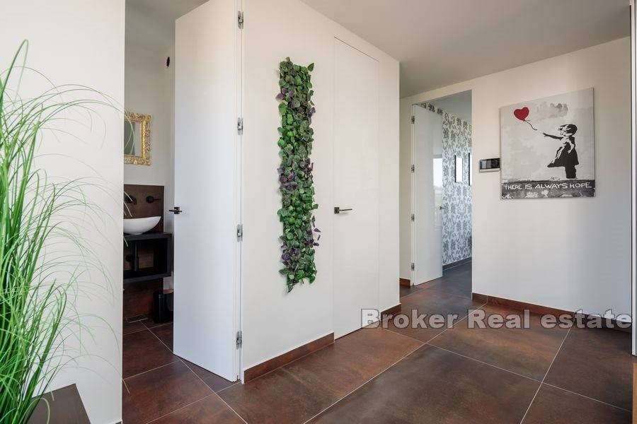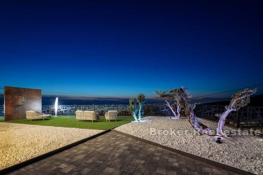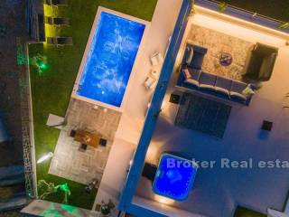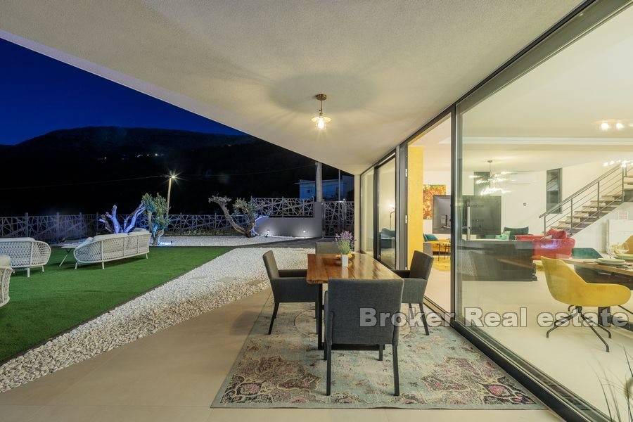 This beautiful newly built villa with pool is located near the city of Split, only 12 kilometers away. The construction work of the villa was completed in 2021, and the position of the terrain (506m2) on which the villa is located provides peace, privacy, but also a beautiful view of the sea, islands and Split, especially from the roof terrace.