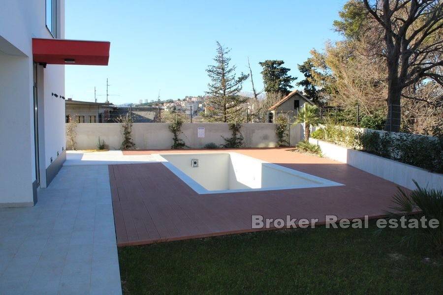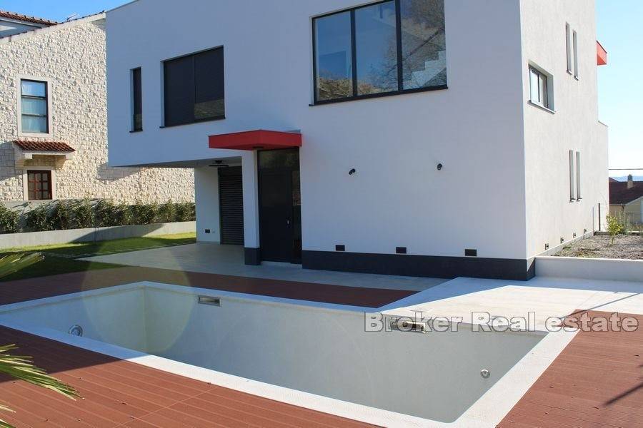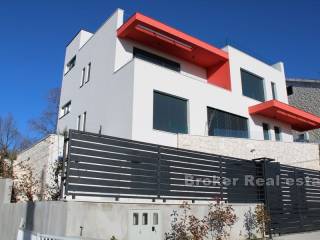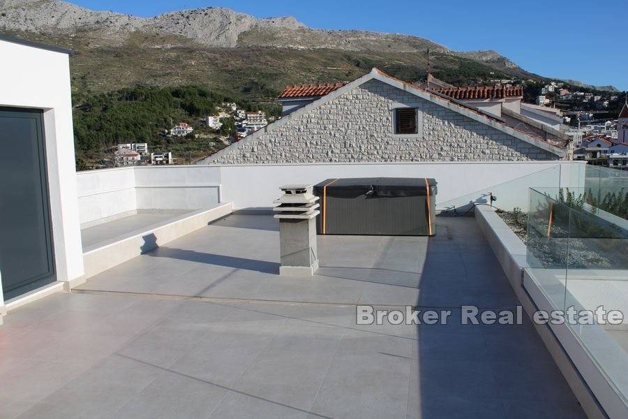 On the ground floor there is a garage from which you enter directly into the house and the apartment which is unfinished and consists of a bathroom, living room, kitchen and one bedroom. The first floor consists of a living room, 1 bedroom, a kitchen with a dining room, a bathroom, a large garden terrace and a swimming pool. On the second floor there are 3 bedrooms, bathroom, terrace with sea view. At the top of the house there is a large terrace with a jacuzzi with open sea views.