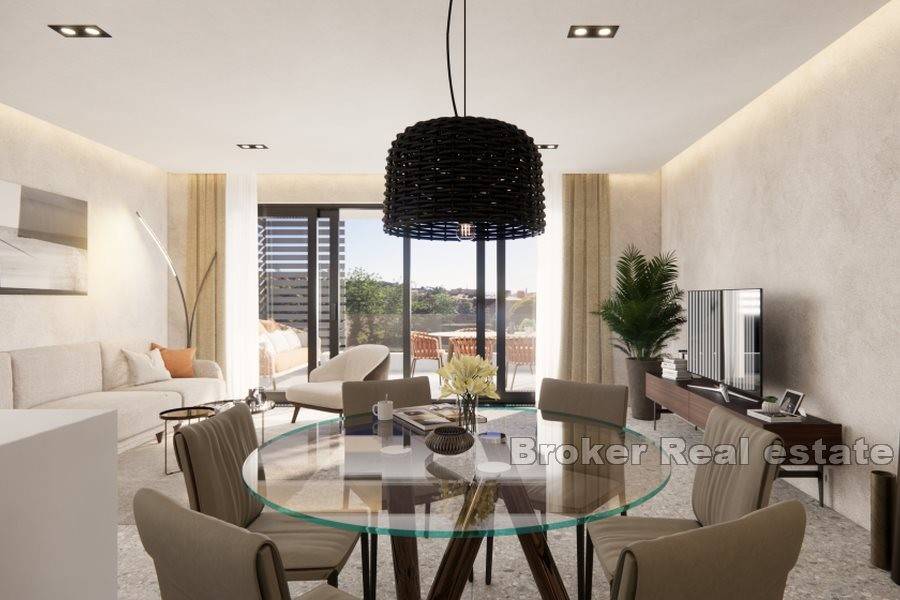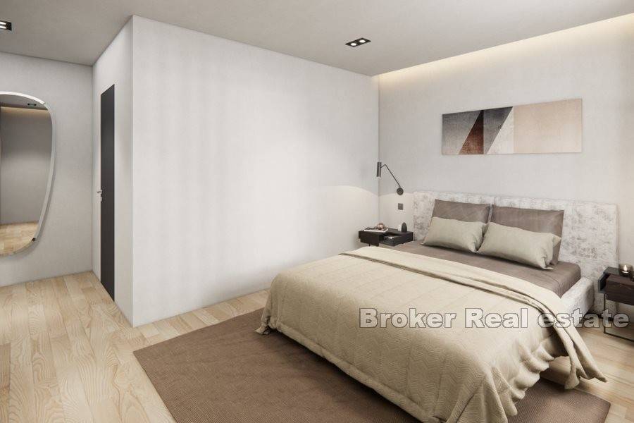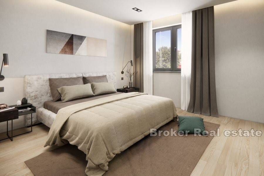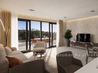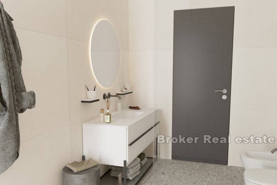 Modern penthouse with a roof terrace located on the last (third) floor of a newly built building with an elevator. It is located near the center of Rovinj and 400 m from the sea. It consists of a spacious and open living area with kitchen, dining room and living room of 39 m2 with access to a terrace of 16 m2. A storage room, a separate toilet, two bedrooms, one of which has a bathroom and a separate bathroom, are arranged in the corridor. The stairs lead to the attic, where there is a bedroom with a bathroom, a wellness room with a sauna and jacuzzi, and a 20.5 m2 terrace with a beautiful open view of the sea and the city. It has a storage room in the basement of 8.15 m2 and two parking spaces in the garage.