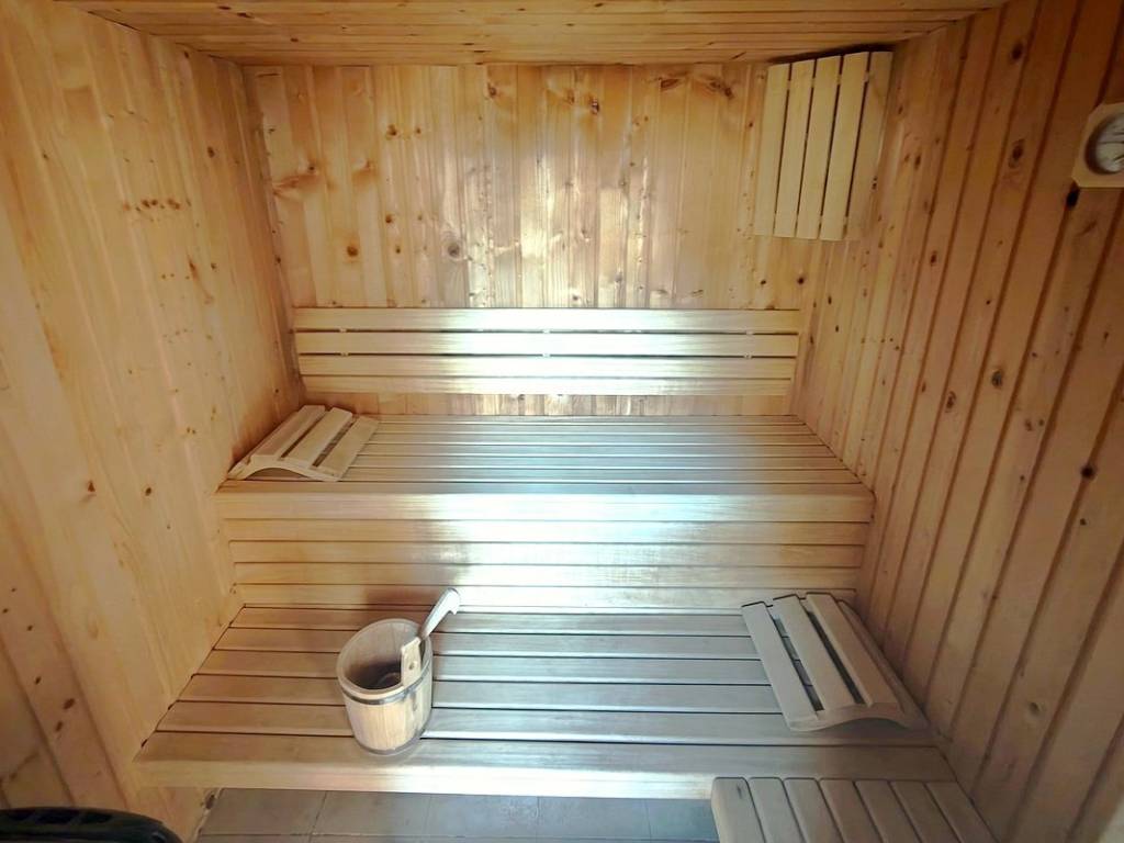 There is also a barbecue, an outdoor table with chairs, a childrens playground, a swimming pool, a sauna, and a jacuzzi in the garden, which make the outdoor space an ideal oasis for relaxation, especially in the summer months.