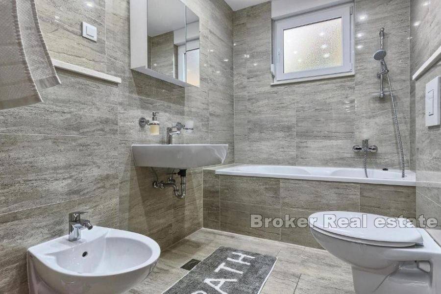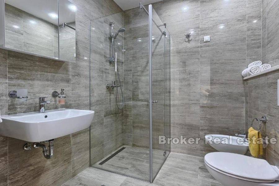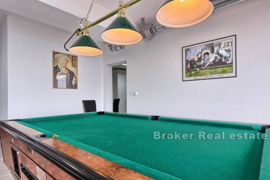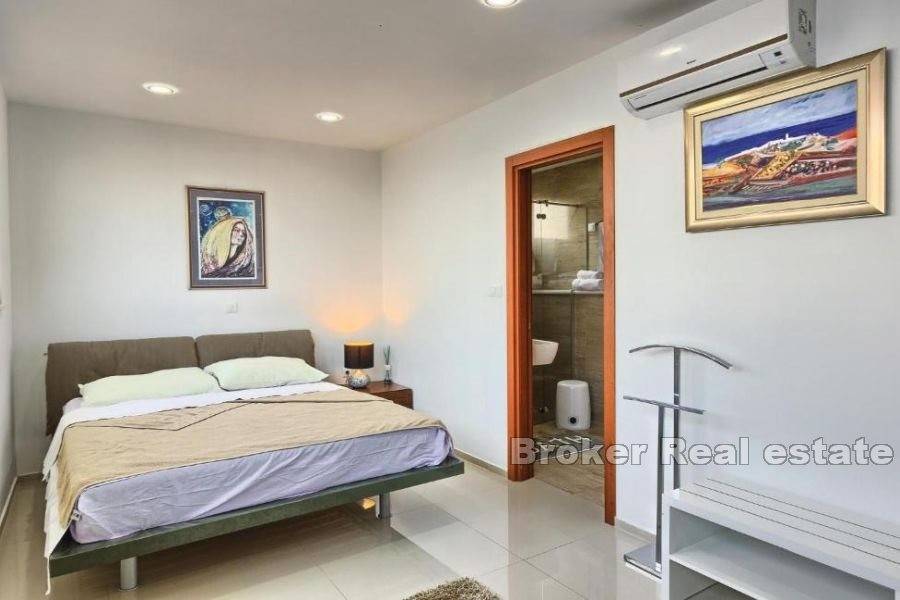 This modern villa is located on the slopes of a small hill with open and stunning sea views, a short drive from the most beautiful beach in the area. It is 7 km away from the small, Mediterranean town of Omis and the river Cetina and approx. 30 minutes drive from Split, a town under UNESCO protection, and 45 minutes from Split airport.