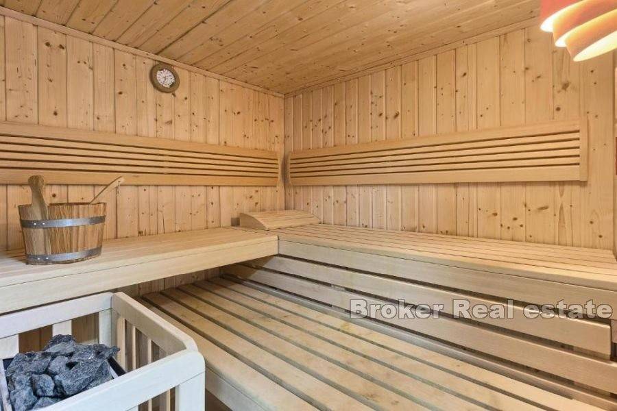 The first, basement floor consists of a garage for two cars, a wellness area with air-conditioned fitness room and Finnish sauna and a home wine cellar.