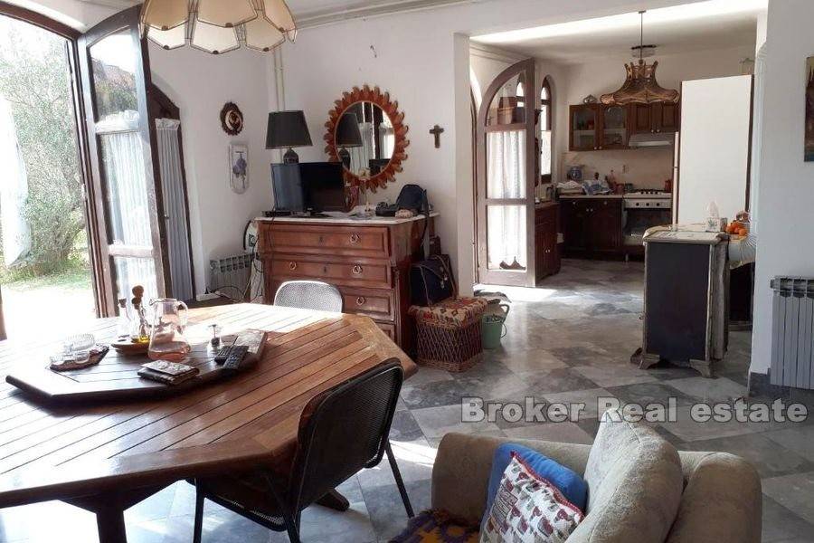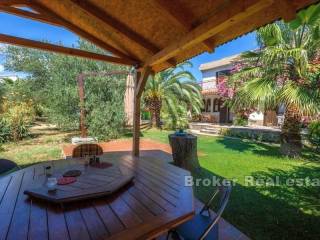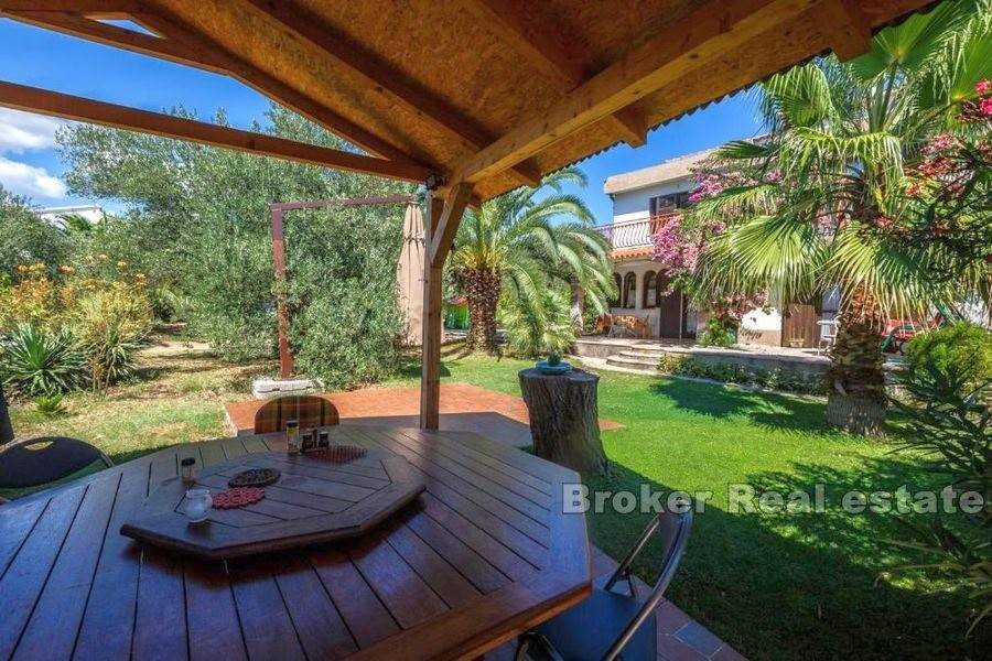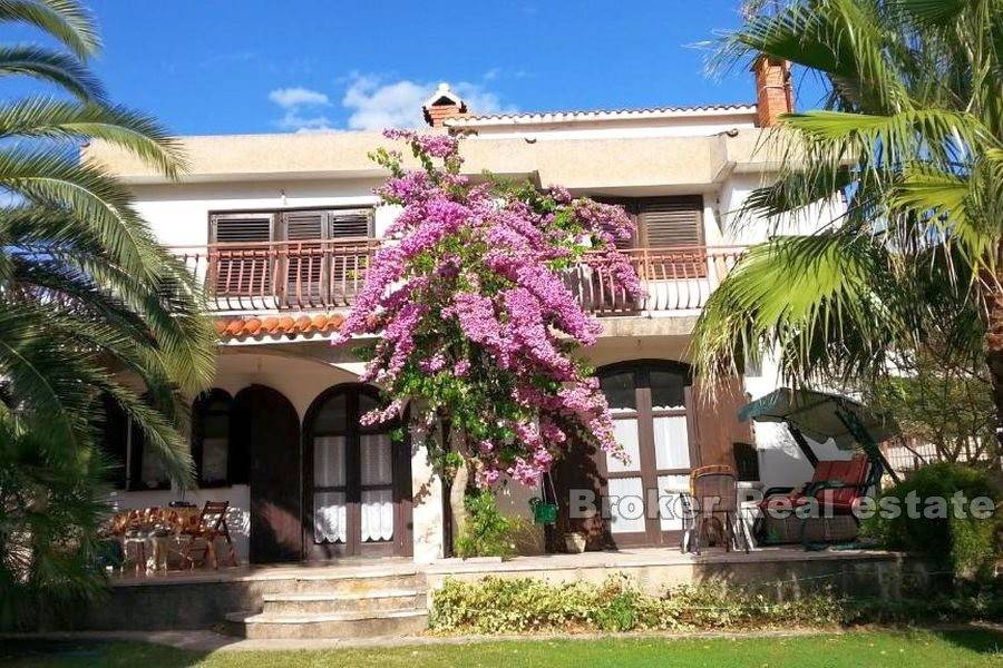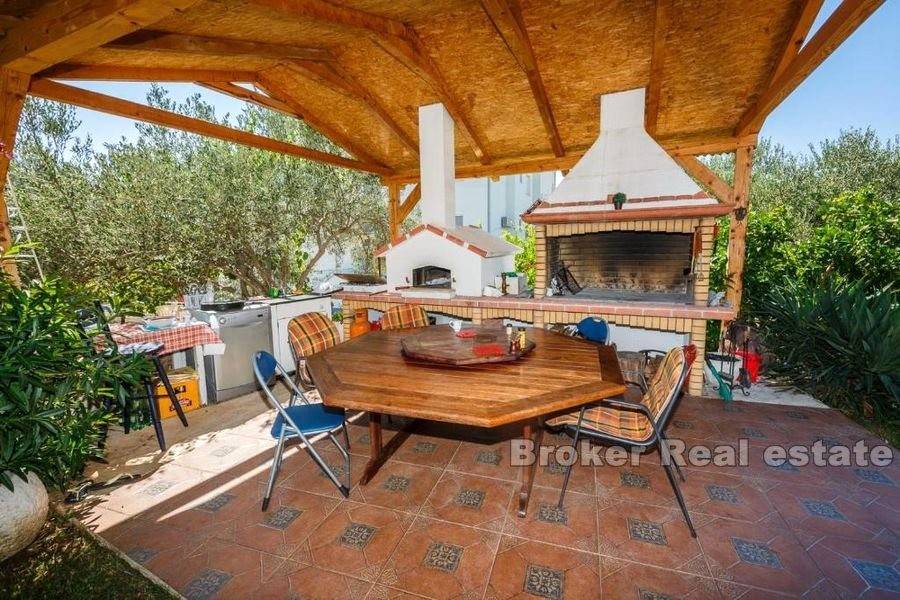 Property in great location with a spacious garden on the island of Ciovo. The house of 193 m2 is located on a plot of 1290 m2 in an excellent location. The property is spread over two floors. The ground floor has a kitchen, dining room, living room and bathroom and access to a covered terrace. Upstairs there is a bathroom and three bedrooms with access to the terrace with a partial sea view. Behind the house are two garages. In front of the house there is a large garden with olive trees in which there is a covered fireplace with a wooden table and chairs. The house is located in a quiet neighborhood, 200 meters from the sea, near beautiful beaches. Distance from Split Airport is 8 km. The excellent location and privacy offered by this property make it a perfect option for a holiday home or investment for a tourist business.