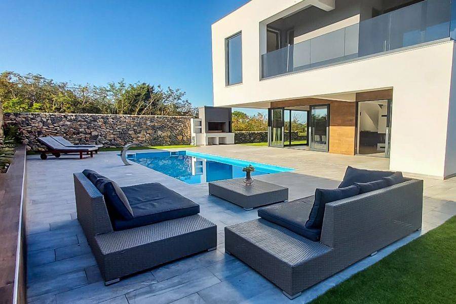 For sale is a newly built modern villa with pool, located in a quiet place near the city of Zadar. It has a total living area of 230 m2, located on a plot of 602 m2. The villa was built in 2020. It consists of two floors ground floor and first floor. The ground floor has a large living room, kitchen with dining area, toilet, storage and a large covered terrace. Upstairs are three spacious bedrooms with three bathrooms and two covered terraces. The bathrooms have underfloor heating and solar water heating, while the rooms are air conditioned. In addition to the sea view, the pool is located on a garden surrounded by a fence made of stone from the Dalmatian area. The pool contains a waterfall and a hydro-massage system with six jets. The landscaped garden, with a modern garden grill, contributes to the atmosphere of a pleasant stay. The villa has six parking spaces. The proximity of beautiful sandy beaches and crystal clear sea complete the potential of the property.