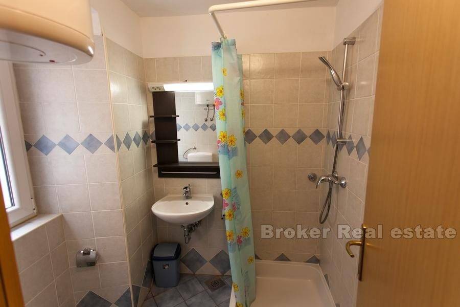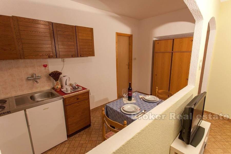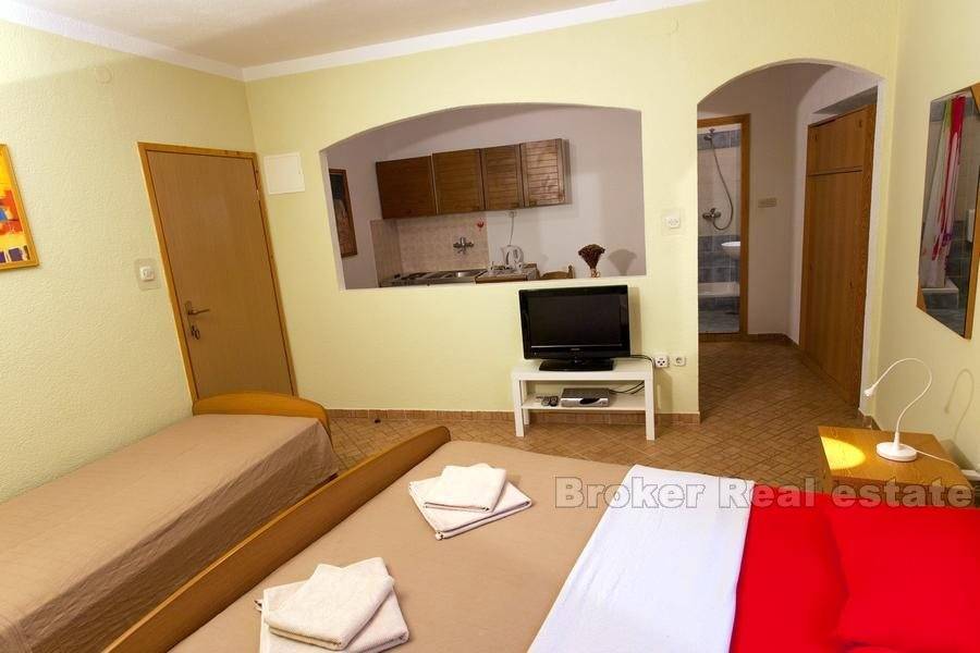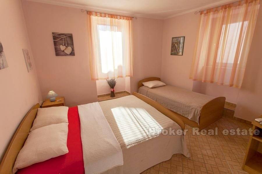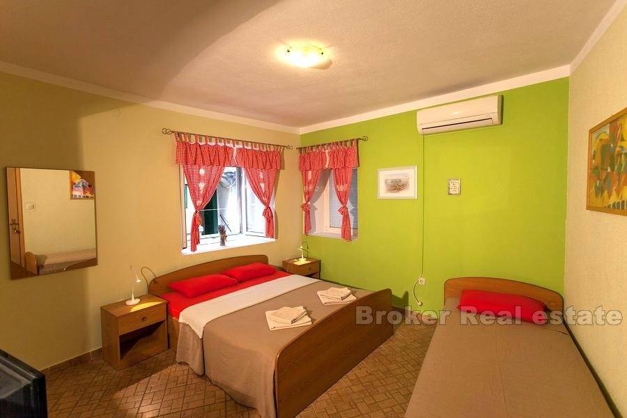 On the first floor there are three double rooms and one studio apartment. On the second floor are two studio apartments and the lower floor of a two-storey apartment. In the attic is the upper floor of a two-storey apartment. This apartment consists of living room with kitchen and dining room, storage room, laundry room and terrace, and on the ground floor there are two bedrooms, bathroom and wardrobe.
