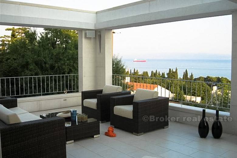 This modern luxury villa has a beautiful garden with sea view, garage, jacuzzi, heating and cooling system and is only cca 80 meters from the sea.