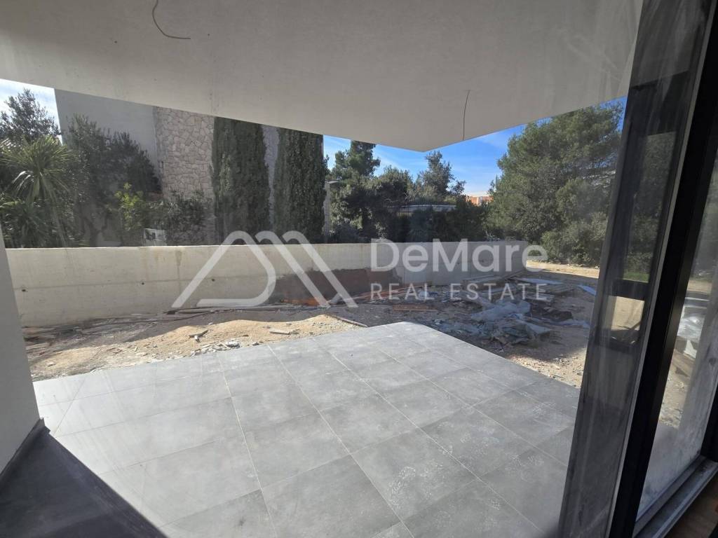 Prekrasan apartman na atraktivnoj lokaciji, u blizini mora i plaže; zauzima cijelu etažu u prizemlju zgrade. Komforni dnevni boravak s jedne strane i kuhinja s blagovaonicom s druge strane stana, samo su staklenim kliznim stijenama odvojeni od prostrane natkrivene vanjske terasa.