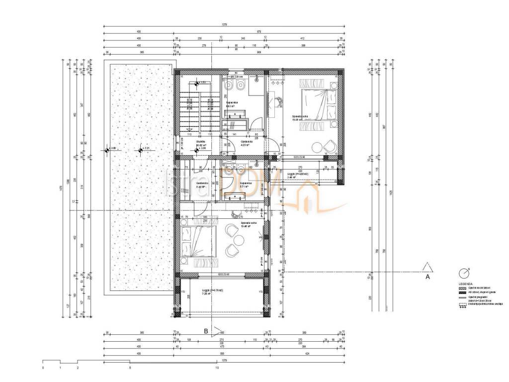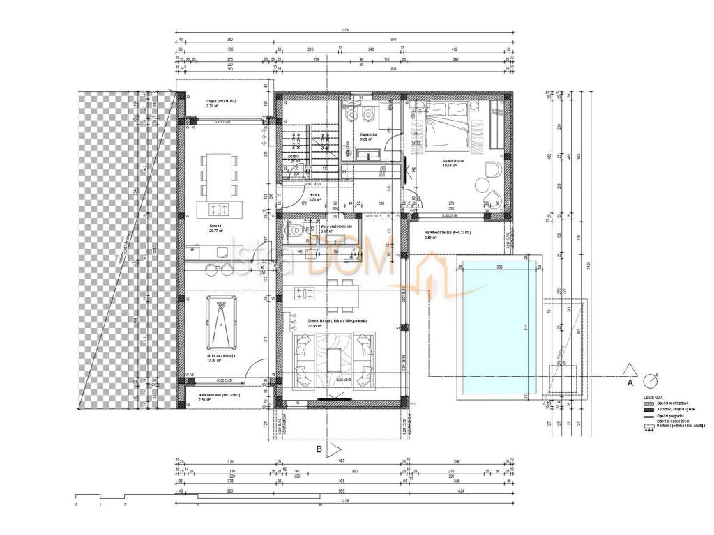Covered entrance Entertainment room Tavern Loggia Hallway Storage room under the stairs Spacious living room connected to the kitchen and dining room Covered terrace WC with anteroom Bedroom with private bathroom