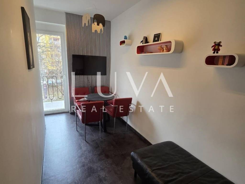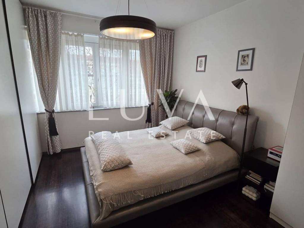 The apartment is thoughtfully designed and consists of two comfortable bedrooms, a living area with access to a balcony, and a bathroom. The north–south orientation ensures plenty of natural light and good ventilation throughout the day. All installations were completely renovated eight years ago, and the interior is furnished with high-quality designer furniture that remains in the apartment, making it ready for immediate move-in. Additional practicality is provided by a garage, a basement storage room, and extra storage space in the attic, which is a rarity in this part of the city.