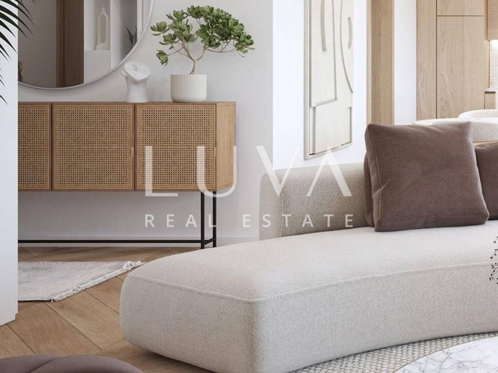 The apartment is equipped with state-of-the-art materials, a designer interior, and a jacuzzi on the terrace.