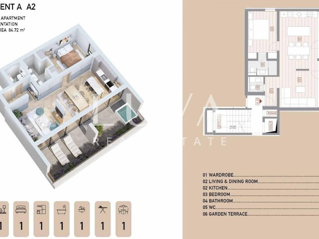 It consists of a living and dining area, kitchen, one bedroom with en-suite bathroom, a walk-in wardrobe, a large terrace, and a guest toilet.