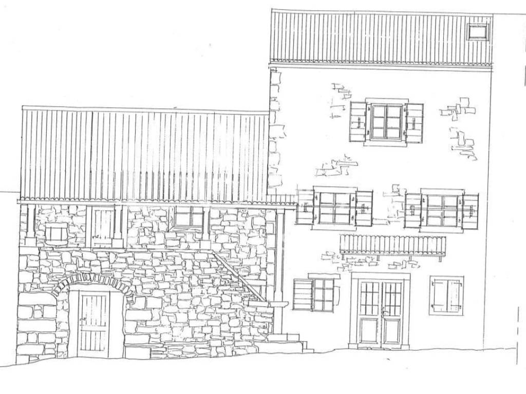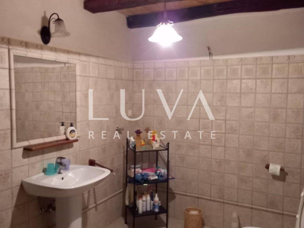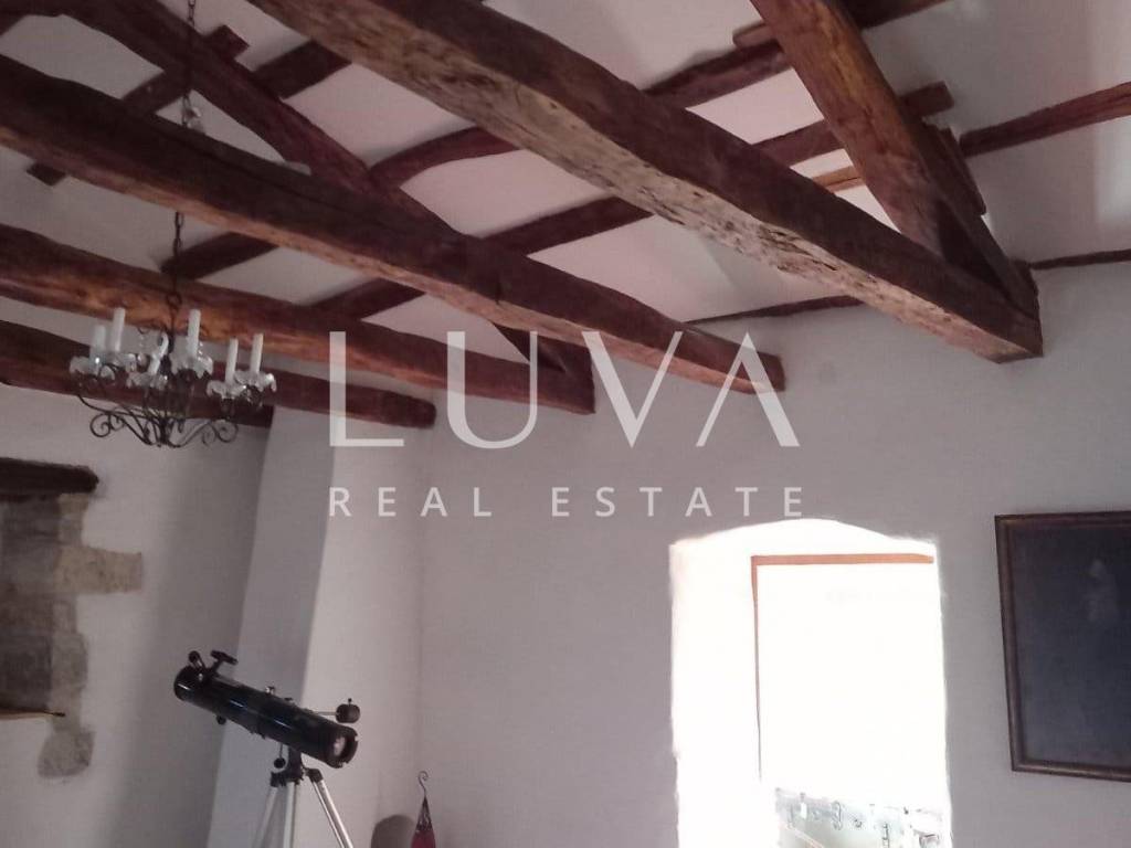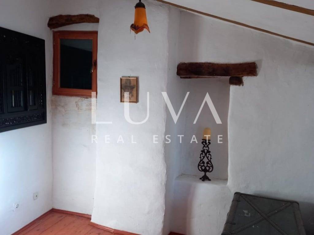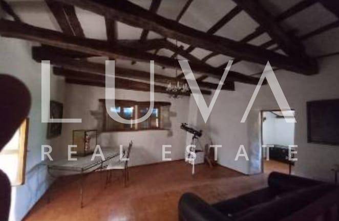 The villa is spread over three levels, with access from two directions. The eastern part of the house includes a commercial space on the ground floor, two rooms, a bathroom, and a WC. The space is filled with historical details such as the original bread oven, three large stone fireplaces, centuries-old wooden beams, and an exterior Baroque balustrade.