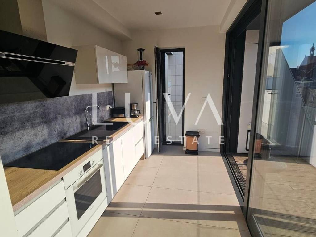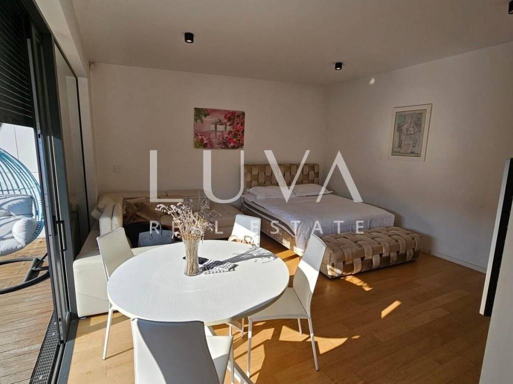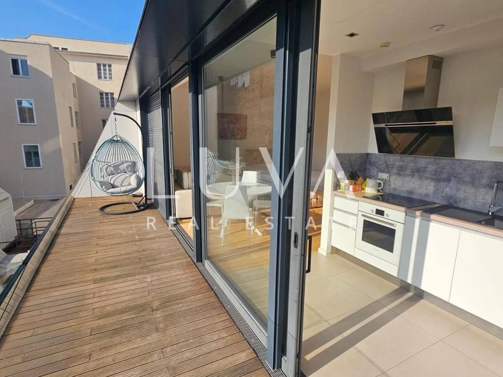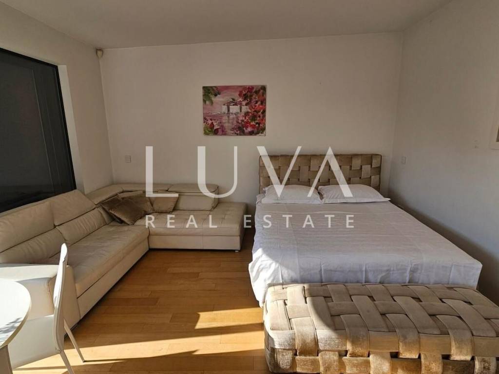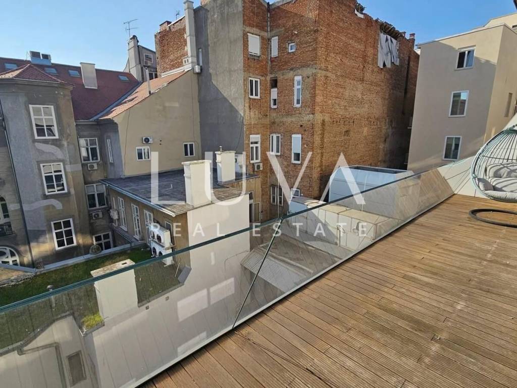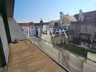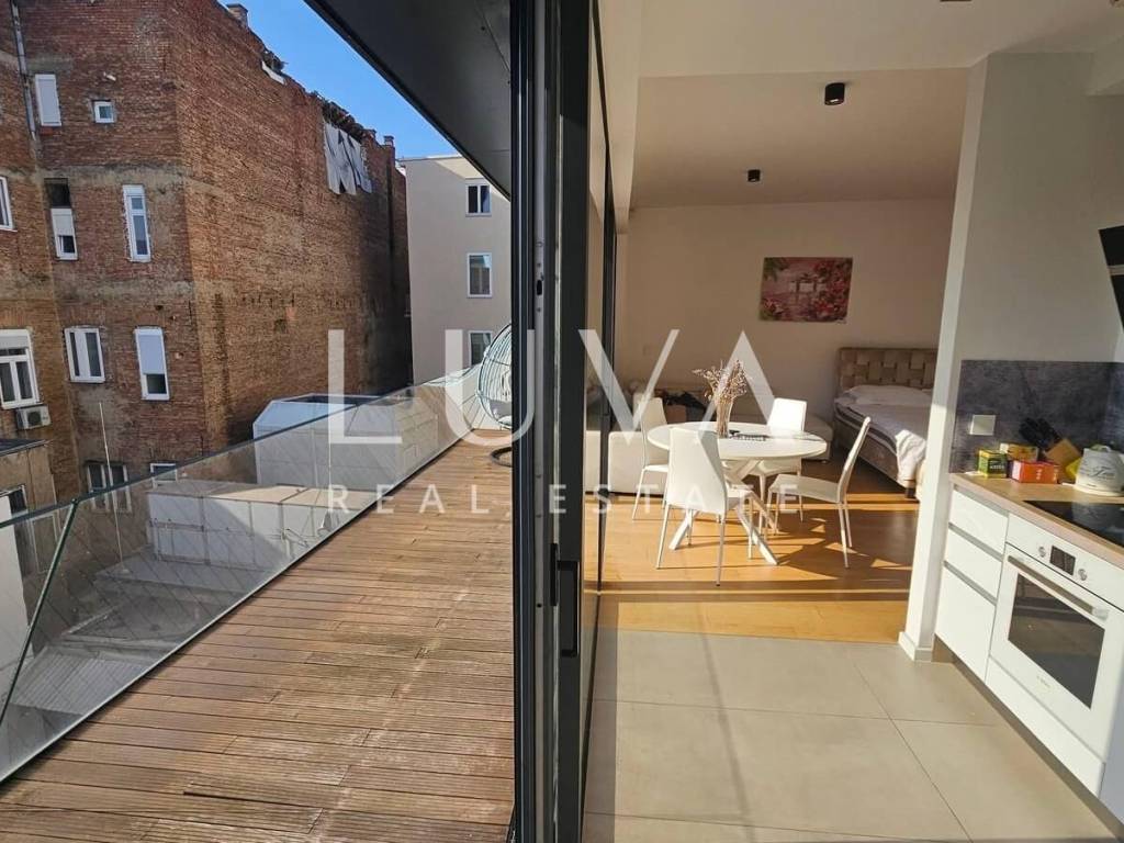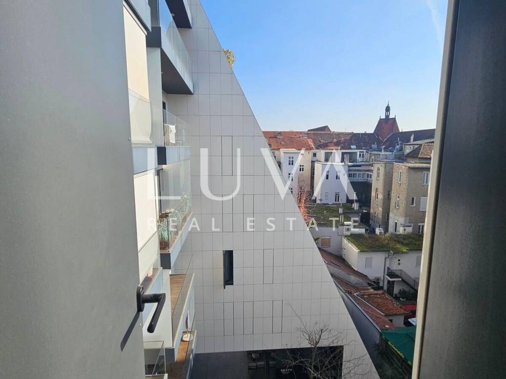 A small studio apartment of 38.23 m² is for sale in one of the most luxurious buildings in the strict center of Zagreb. The Ban Center building is a beautifully designed building with several entrances, ensuring a high quality of life in the heart of Zagreb. The apartment for sale is located on the 5th floor and consists of an entry hall with a built-in wardrobe, a bathroom, and a spacious living room that continues into the kitchen. Large glass walls extend through the entire kitchen and living room, which can be opened to access a large 16 m² terrace overlooking the courtyard. The apartment also includes a garage parking space on the -5th floor.