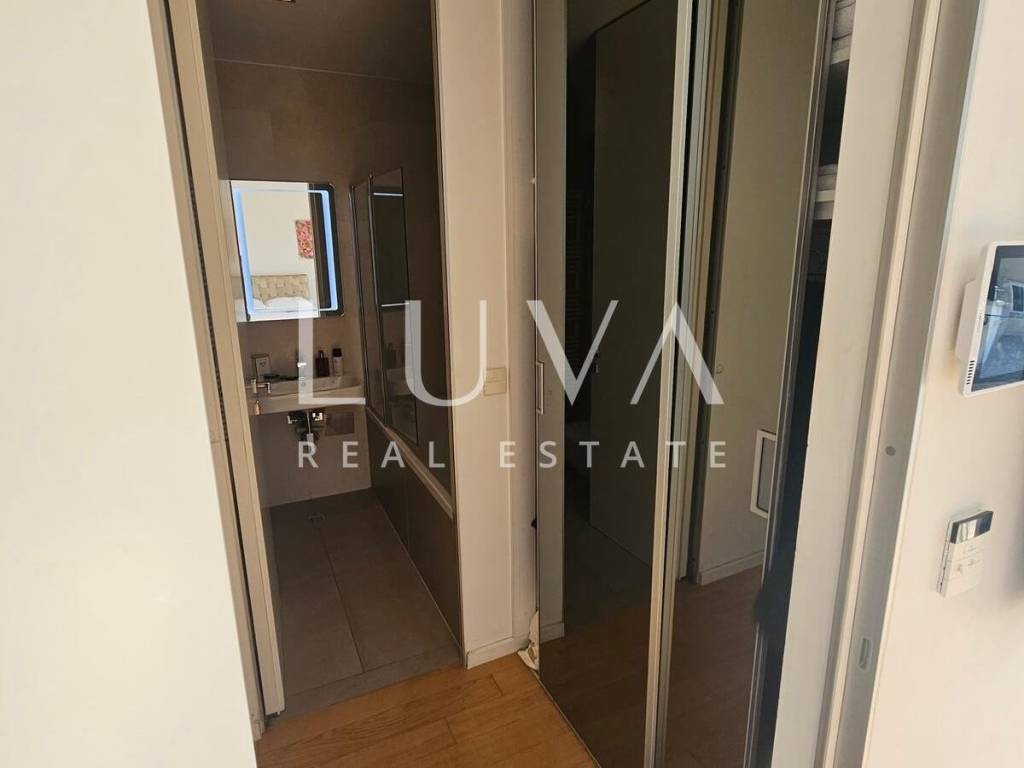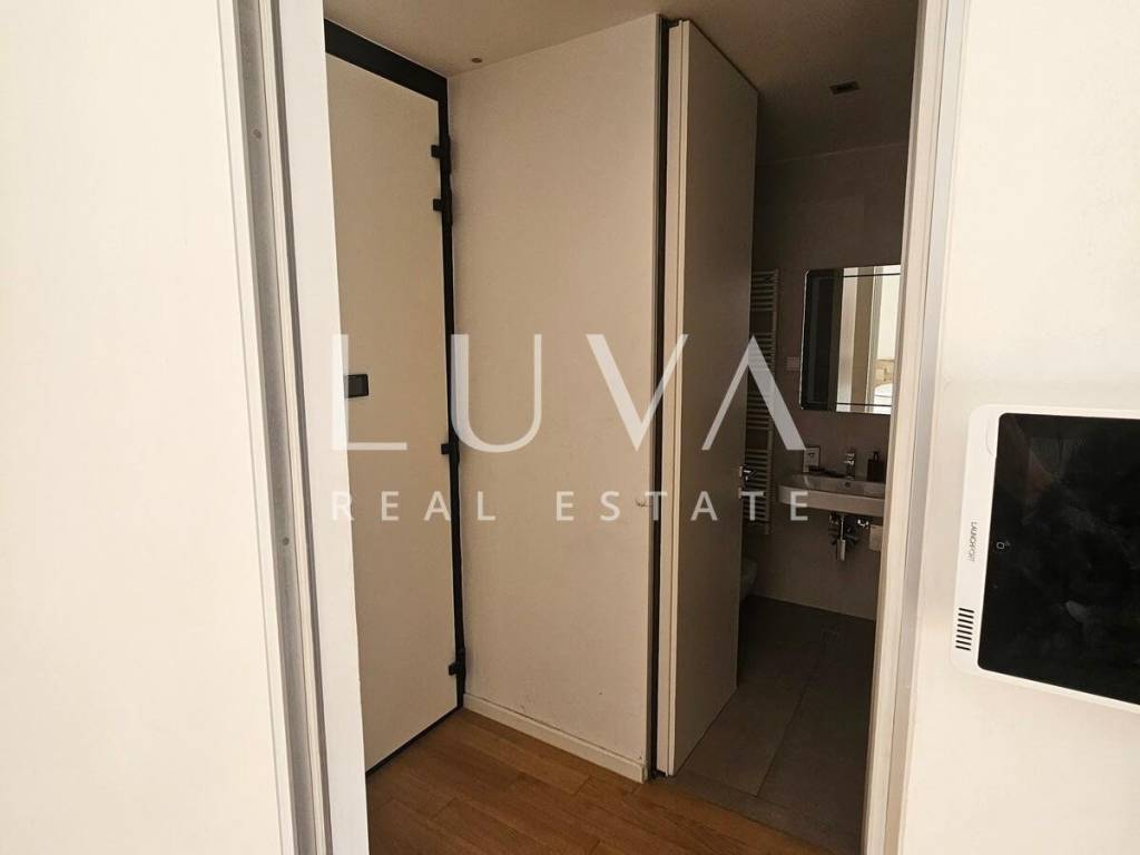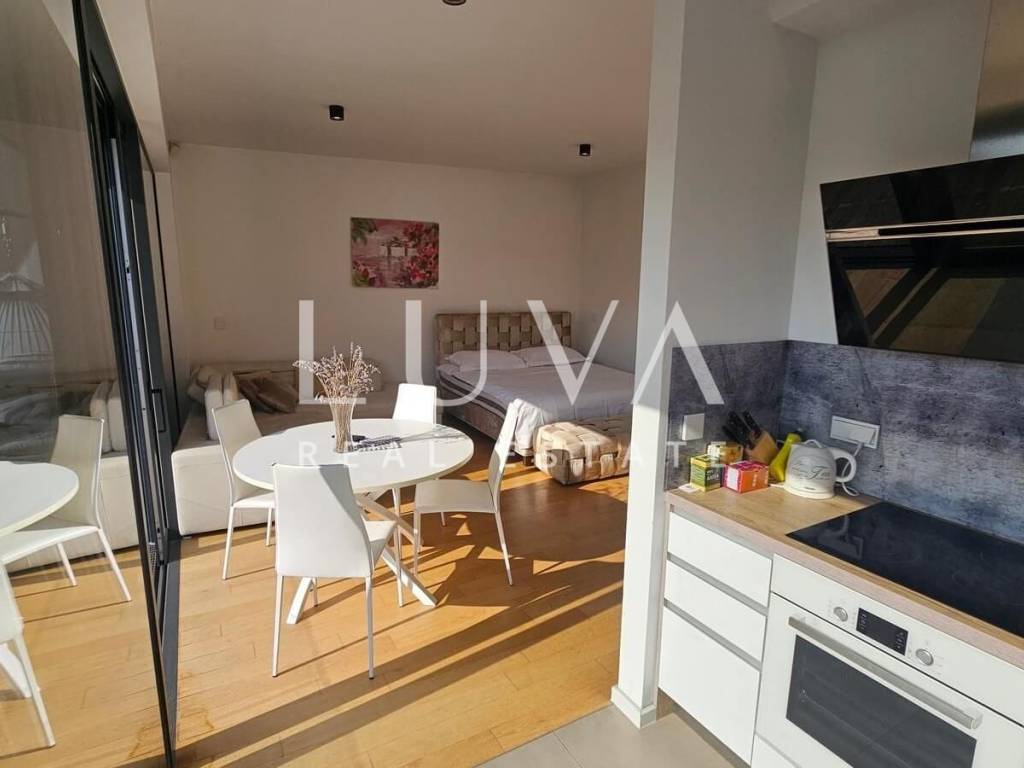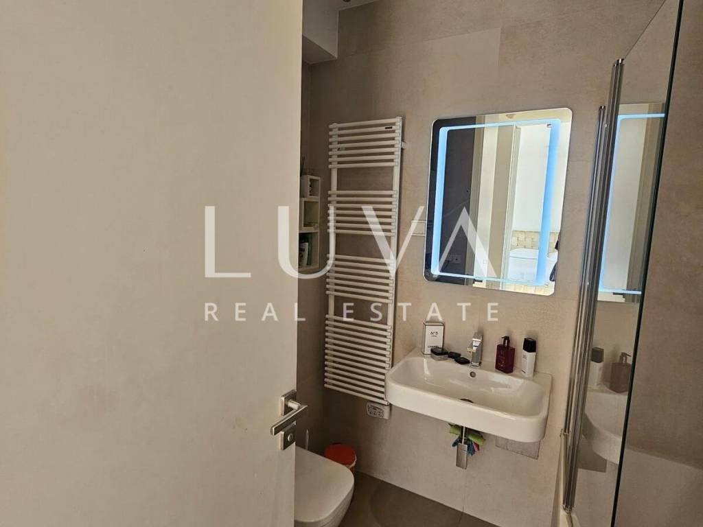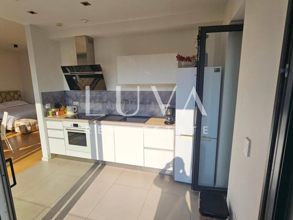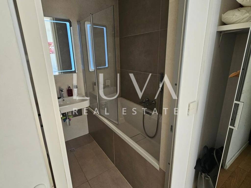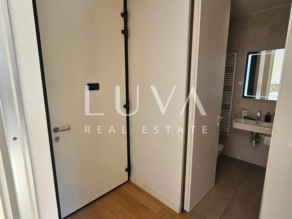 A small studio apartment of 38.23 m² is for sale in one of the most luxurious buildings in the strict center of Zagreb. The Ban Center building is a beautifully designed building with several entrances, ensuring a high quality of life in the heart of Zagreb. The apartment for sale is located on the 5th floor and consists of an entry hall with a built-in wardrobe, a bathroom, and a spacious living room that continues into the kitchen. Large glass walls extend through the entire kitchen and living room, which can be opened to access a large 16 m² terrace overlooking the courtyard. The apartment also includes a garage parking space on the -5th floor.