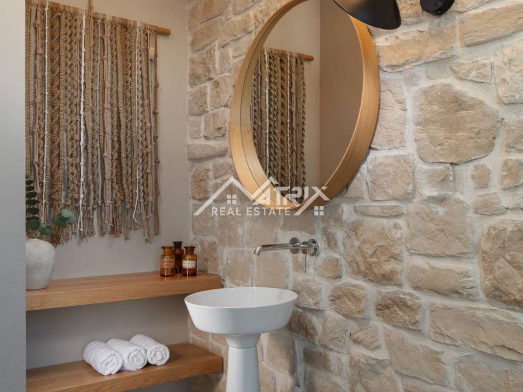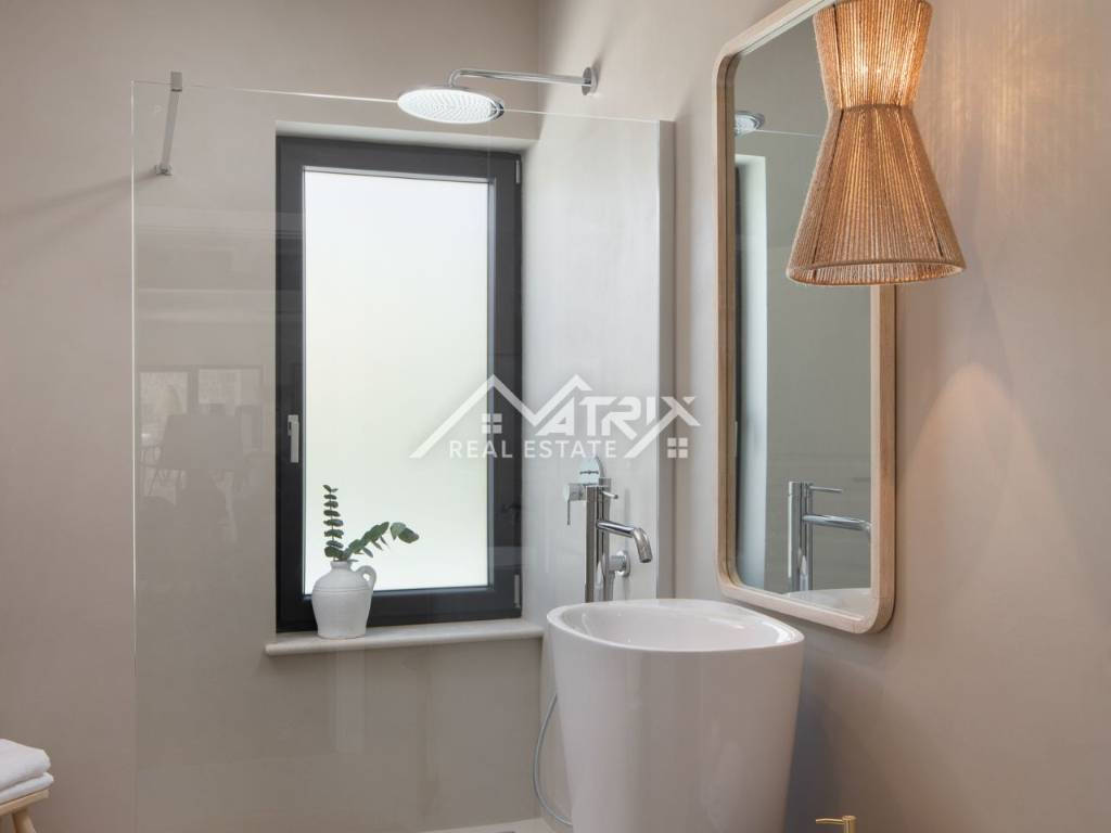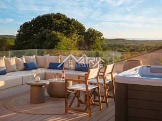 The villa extends over the ground floor and first floor, with a total living area of 270 m2. The ground floor of the house is designed as an open space that unites the living room with the dining room and the kitchen, with one bedroom with its own bathroom, and the ground floor is completed with a guest toilet and storage room. From the living room you can exit to the pool terrace through large glass walls that provide plenty of light throughout the day. Internal stairs lead to the first floor where there are as many as four bedrooms, each with its own bathroom and access to a spacious terrace with a jacuzzi and an open view of the sea and nature.