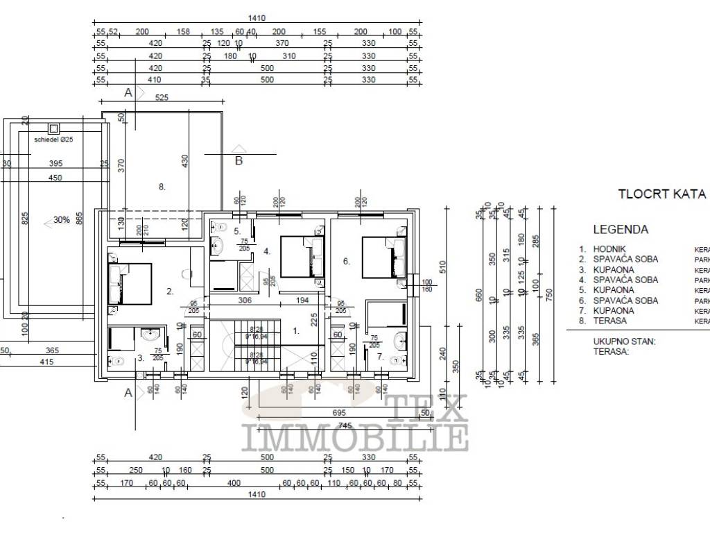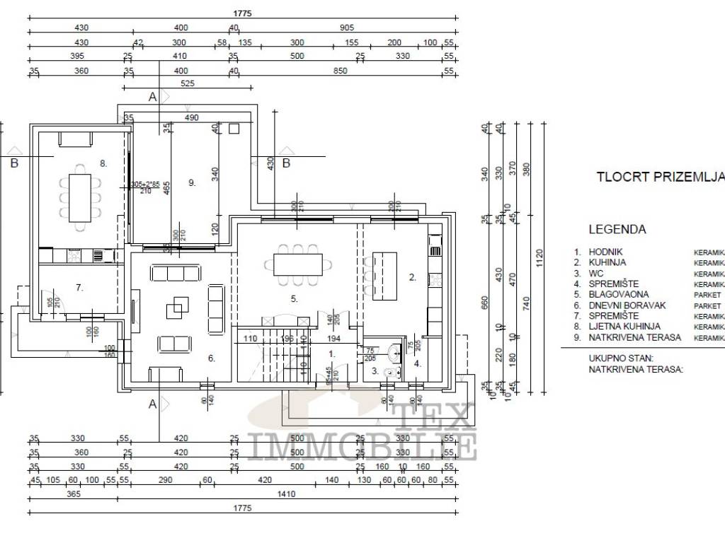 A summer kitchen with a fireplace is also located on the ground floor. All rooms on the southern side have access to a covered terrace of 21.68 m², which extends along the entire house and leads to the sunbathing area around the pool.