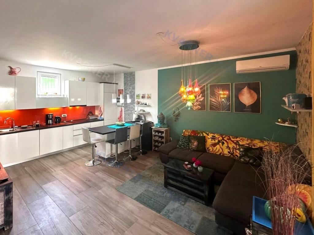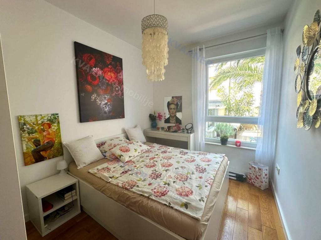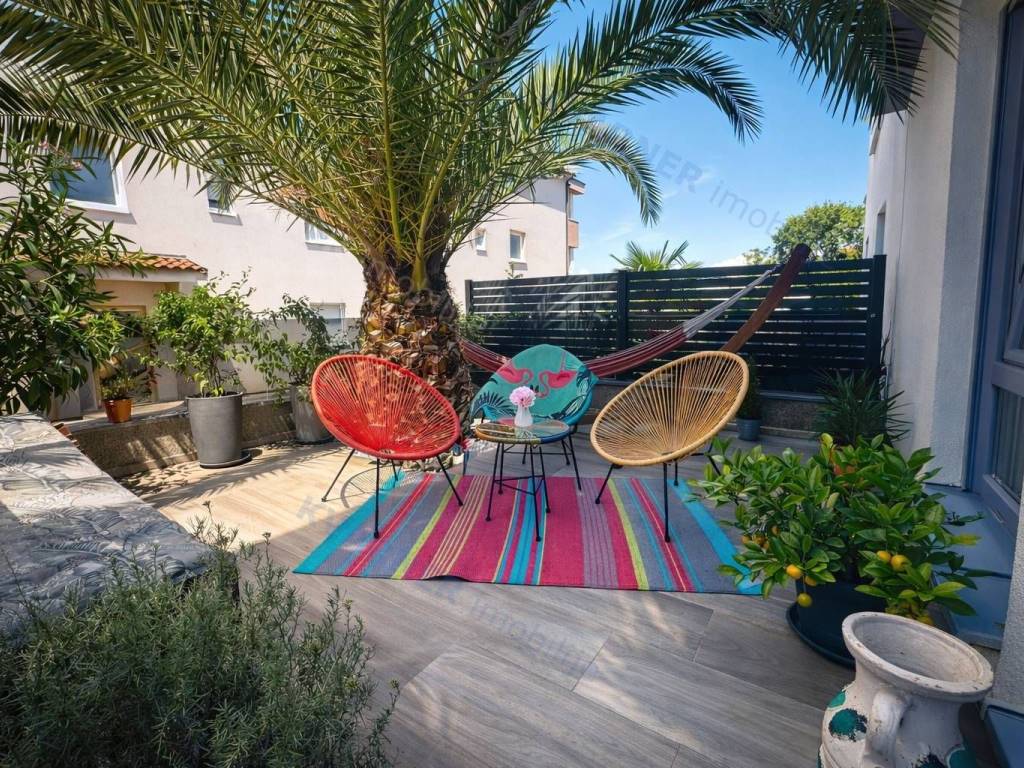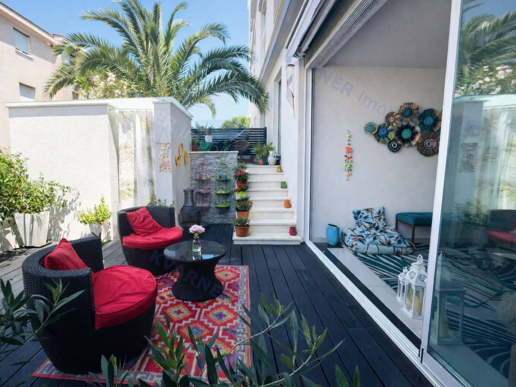The apartment, approximately 69 m² in size, consists of a hallway, storage room, two bedrooms, a bathroom, and a large open space area containing the kitchen, dining room, and living room, all leading to a covered loggia and then to a beautifully landscaped garden of approximately 47 m², which features a built-in barbecue and an outdoor shower. The apartment comes fully equipped and furnished and is being sold as such. It boasts an excellent layout, quality construction, and amenities such as air conditioning and underfloor heating. The apartment also includes a parking space within the building's grounds.