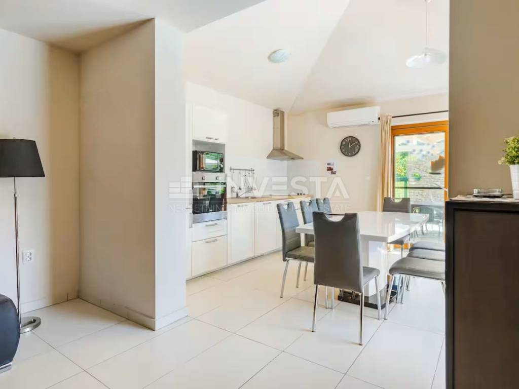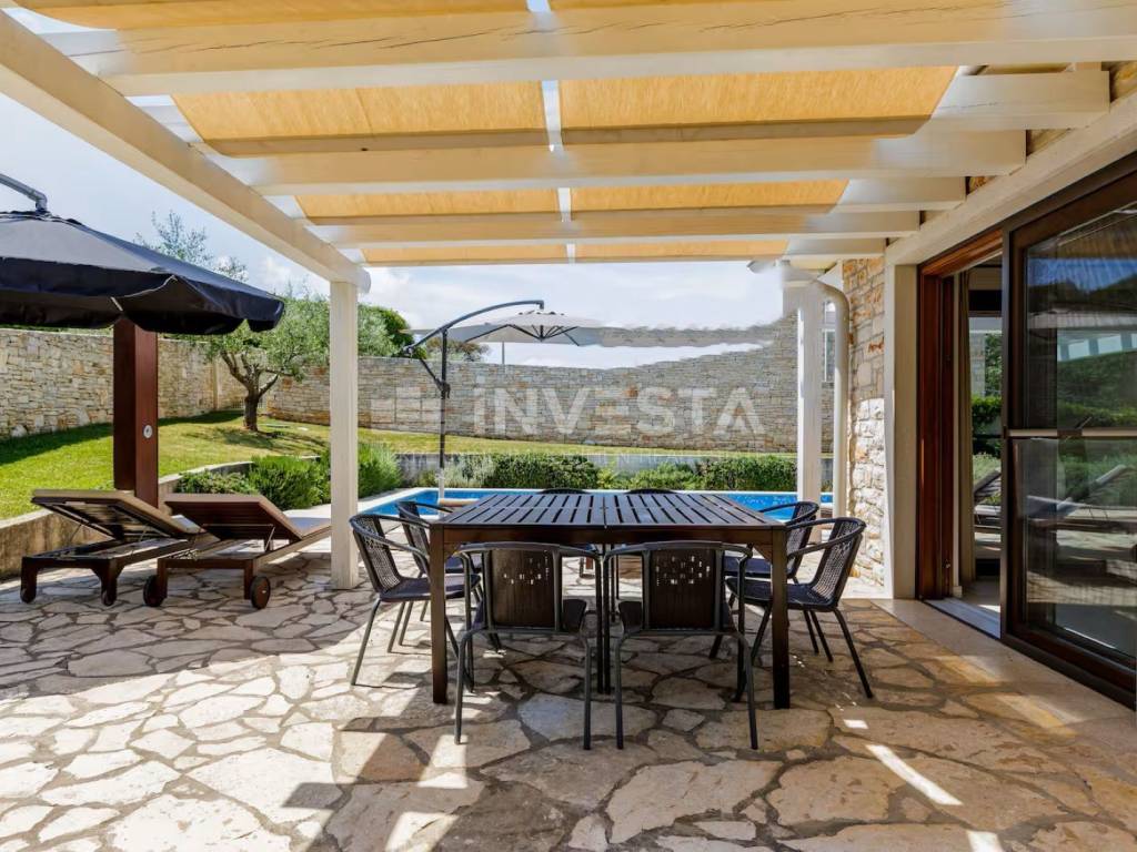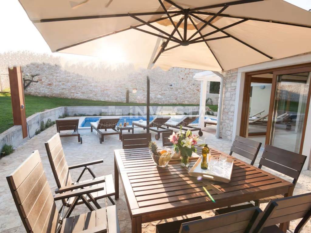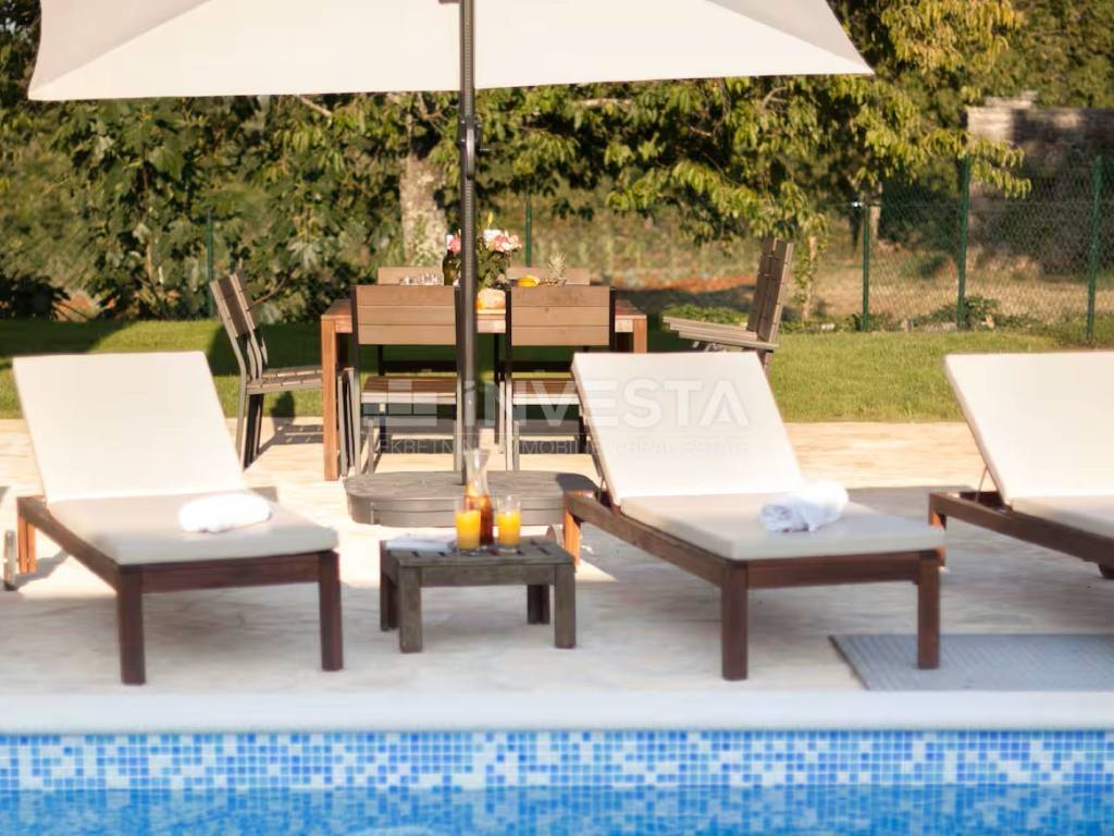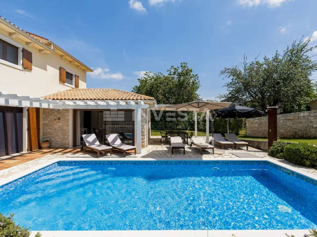 We present for sale a beautiful rustic villa located in a peaceful setting in a small village near the municipality of Barban, only 12 km from the sea and beaches. Surrounded by lush greenery, this charming villa with a total living area of 180 m² is situated on a beautifully landscaped plot of 690 m².