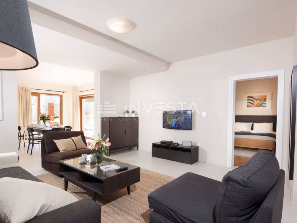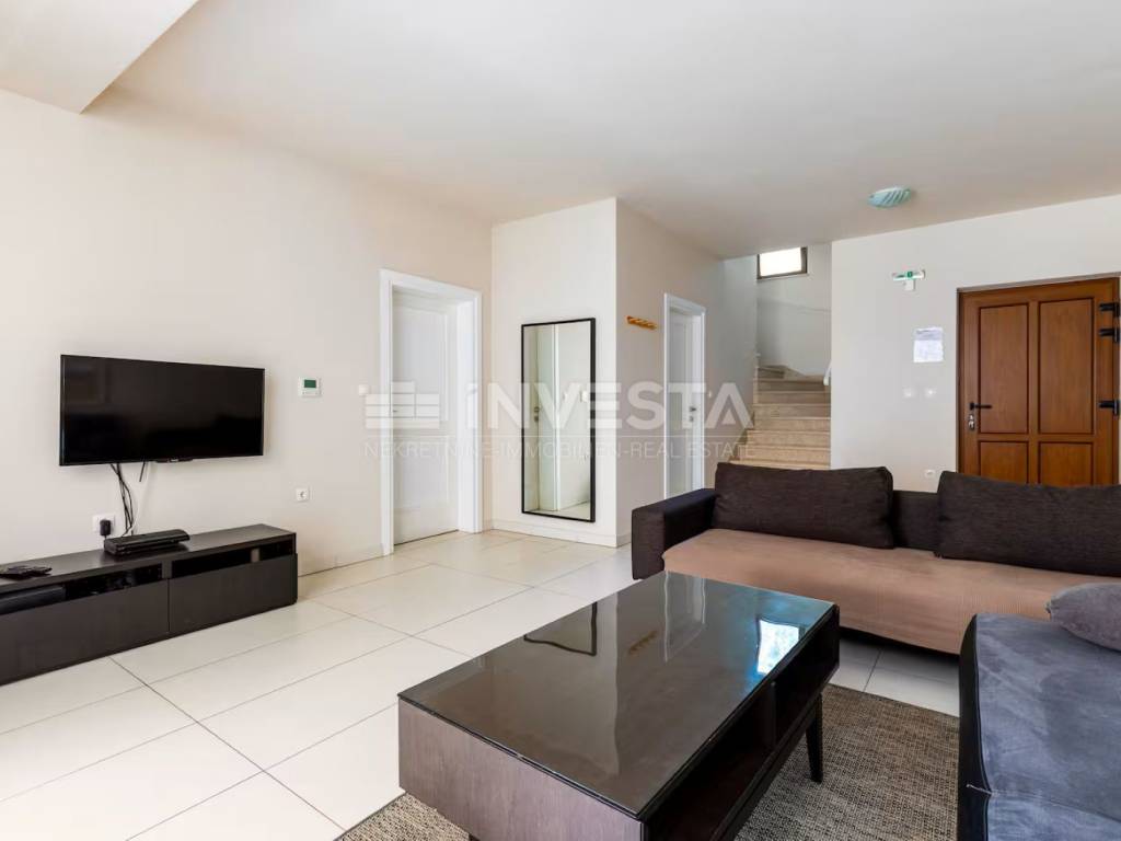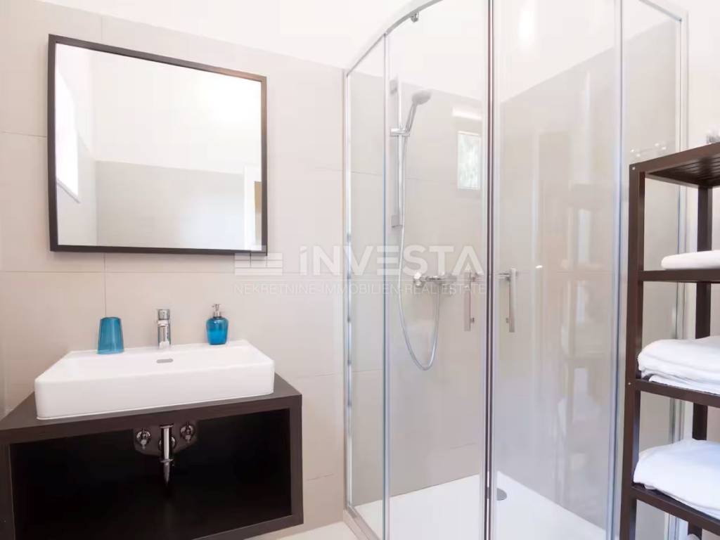 On the ground floor, there are two elegant bedrooms, each with its own modern en-suite bathroom, ensuring complete privacy and comfort. The central part of the house consists of a spacious open-plan concept – a contemporary kitchen connected to the dining area and living room, filled with natural light and designed as an ideal space for socializing and relaxation. A private sauna adds a special touch of luxury, perfect for moments of complete relaxation. An internal staircase elegantly connects the ground floor with the upper floor, completing the functional and harmonious layout.