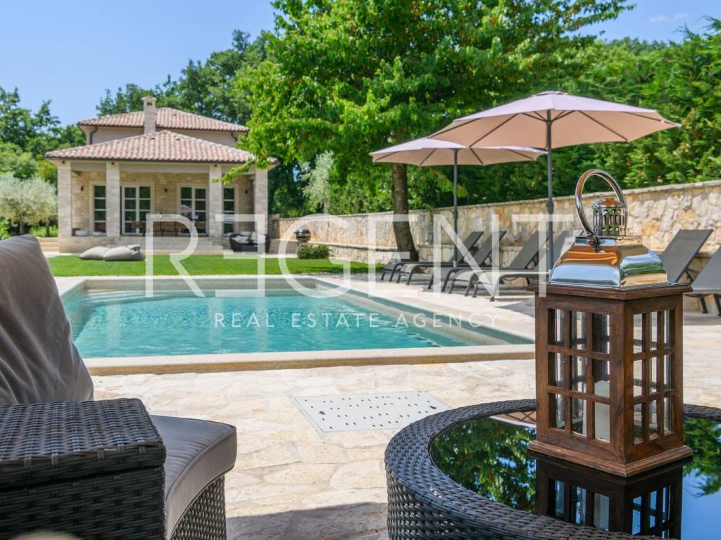 Villa Faturi is located in the rural idyll of central Istria, a new stone villa built and decorated according to all modern design standards. Villa Faturi is located on a plot of 1000 m² with a total living area of 160 m², it was built in 2020 and extends over two floors. Ground floor : Which contains a kitchen with a living room and dining room, two bedrooms, two bathrooms - one with a shower cabin and the other with a bathtub. First floor : Where there are two more bedrooms, one of which has a terrace overlooking nature, and a larger bathroom with a walk-in shower. The displayed price refers to the monthly rent, the villa is rented exclusively for one year, from 1.5.2026. The interior of this beautiful villa has been carefully planned, so you can find works of art by various artists, as well as unique pieces of furniture with historical components that give this villa a special value. The location of the villa offers numerous walking trails and opportunities for cycling activities, while the numerous beaches and the city of Poreč are only a 20-minute drive away. The garden of the villa is completely fenced and very well maintained, and the owner takes care of the garden. Within the garden there is also a swimming pool measuring 9×4 m, covered with a natural PebbleTec covering. In addition to heating with an air conditioning system, it is also possible to install additional electric Nordic radiators at the client's request. Location : The villa is located in a small village of only 5 houses, isolated from the hustle and bustle and casual passers-by, at the very end of the road. Beautiful nature, complete peace and privacy guarantee a comfortable and safe stay in the villa. In the neighborhood there is a mini goat farm with homemade goat milk products, and eco products such as vegetables, domestic eggs, and the Dujmović prosciutto shop, which has been the best in Istria for years, are offered in the area. If you want to completely escape from everyday life and relax in a rural idyll, then this unique villa is the perfect choice for you. Pets are welcome in the villa! We are at your disposal for more information!
