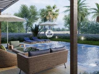 The ground floor features a kitchen with dining area and living room in an open-space concept, a guest toilet, and a practical utility room. Large glass walls provide plenty of natural light and direct access to the terrace, garden, and swimming pool, creating the perfect setting for family life and social gatherings.