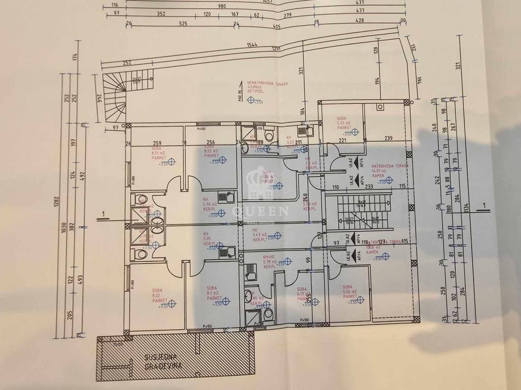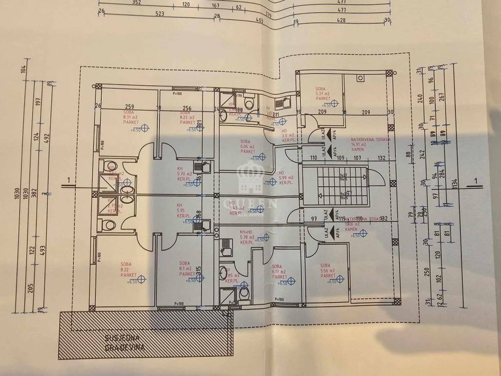 I. kat : stan 1) površine 67m2 + terasa 43,89m2, sastoji se 2 spavaće sobe, kuhinje spojene sa dnevnim boravkom, radne sobe, kupaonice i terase