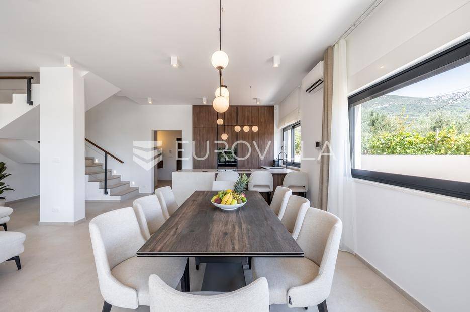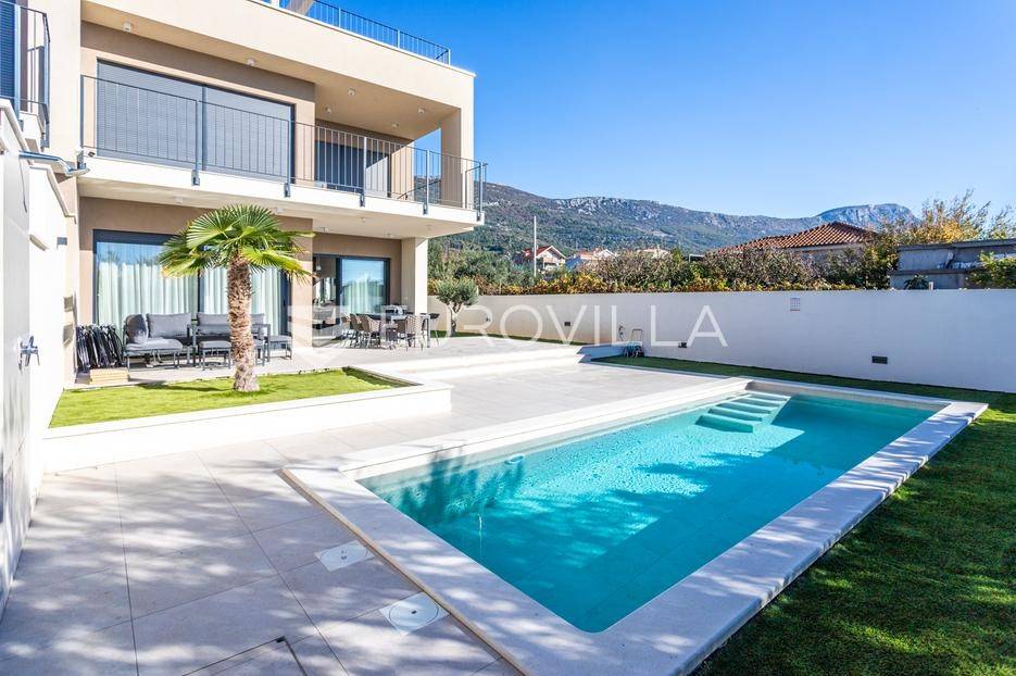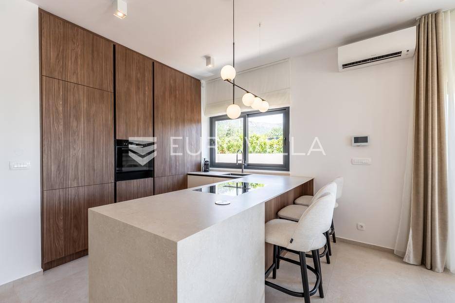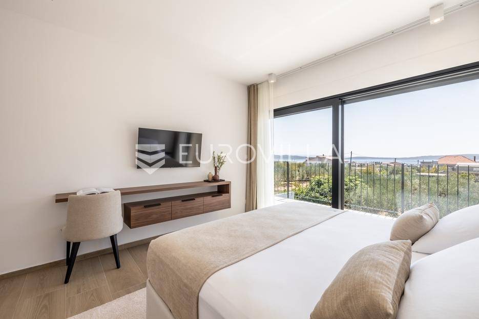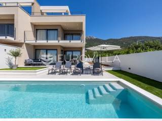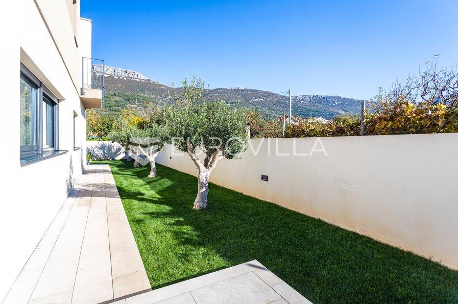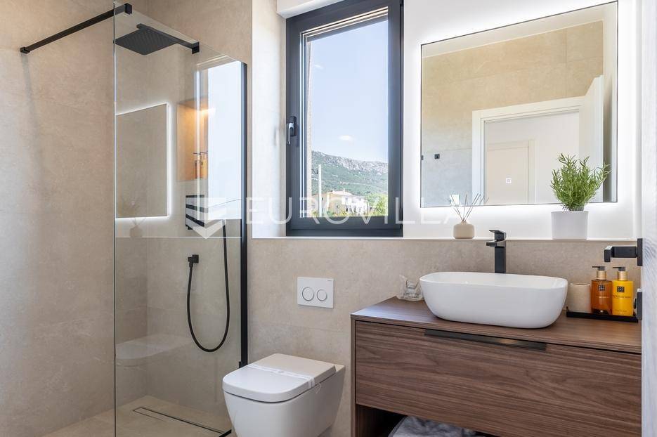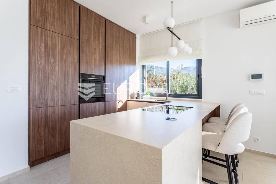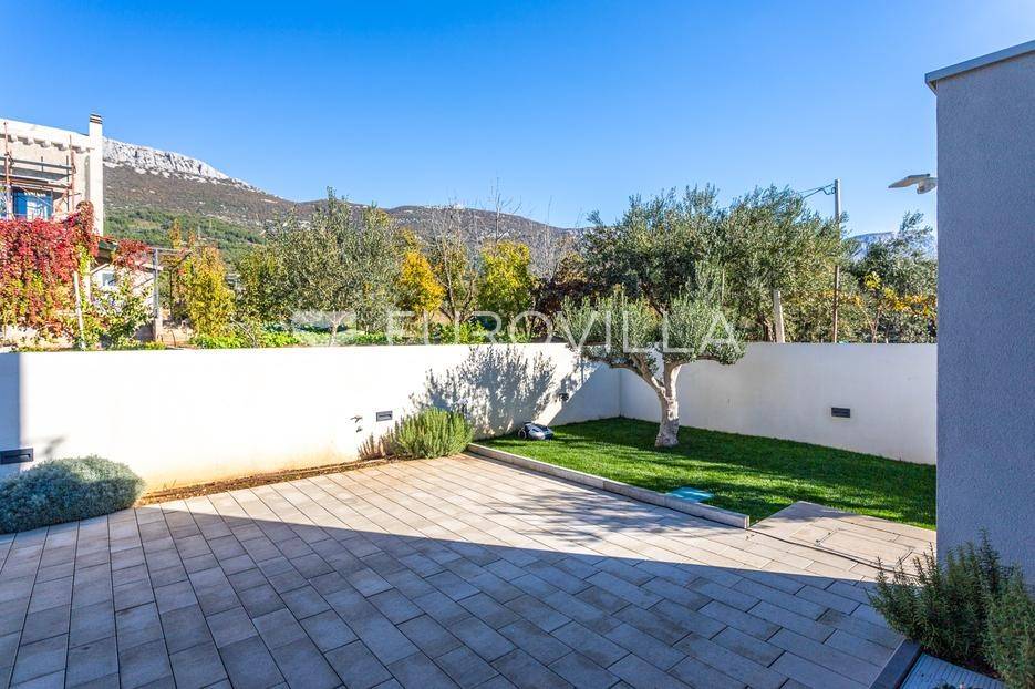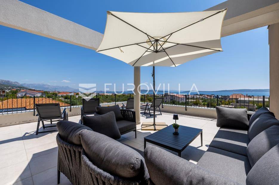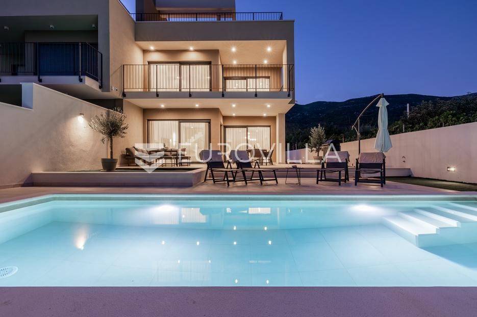 Kaštel Stari, moderna tek dovršena vila s prekrasnim pogledom na more dostupna je za dugoročan najam.Vila površine 274 m2 smještena je na mirnoj lokaciji, ali u blizini svih sadržaja potrebnih za kvalitetan život. Sastoji se od prizemlje gdje je smješten dnevni dio s izlazom na terasu i vrt s grijanim bazenom i sunčalištem. Na katu su raspoređene tri spavaće sobe, četiri kupaonice i vanjska terasa s panoramskim pogledom na more i planine.Vila je kompletno namještena i opremljena podnim grijanjem u kupaonicama, videonadzorom, televizorima u svakoj sobi…Režije nisu uključene u cijenu.Više informacija na upit.... Više na eurovilla.hr, ID: 203028