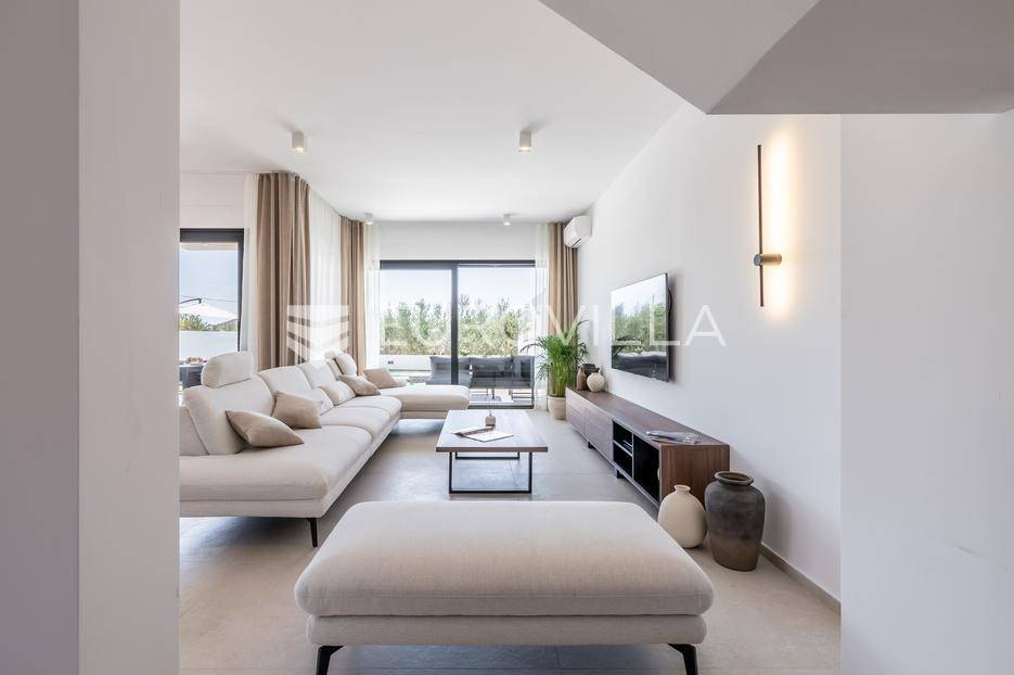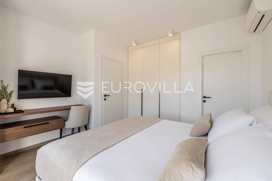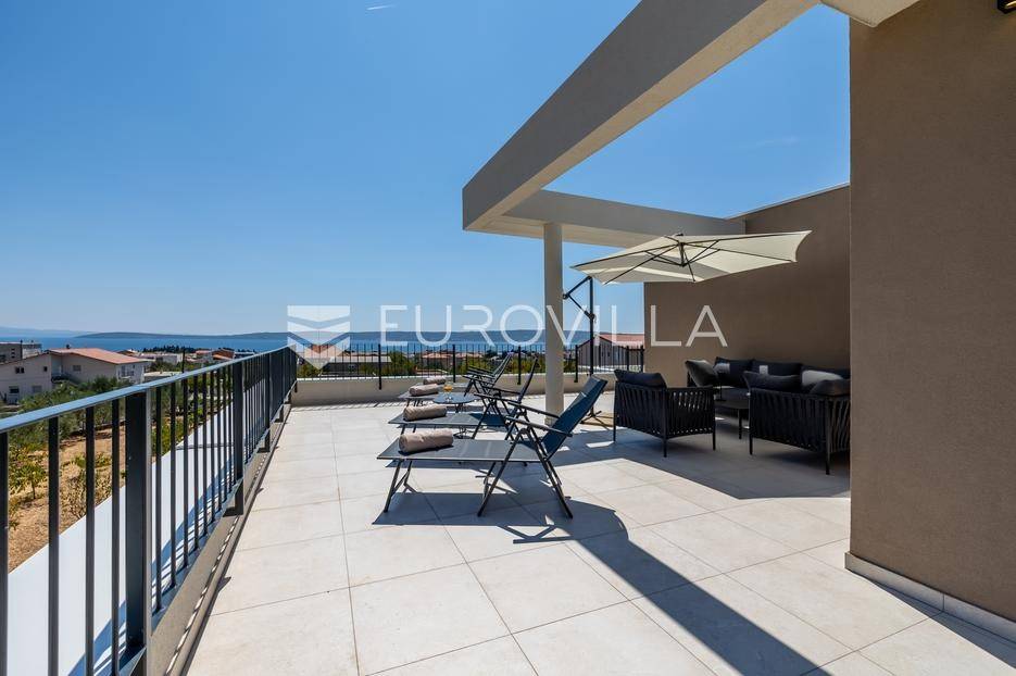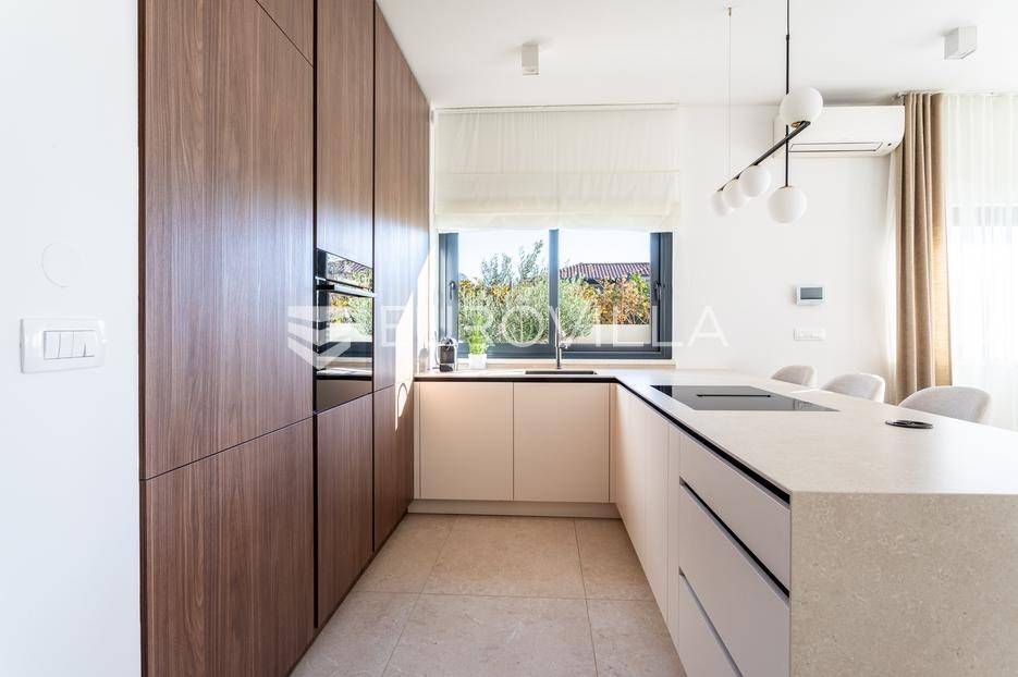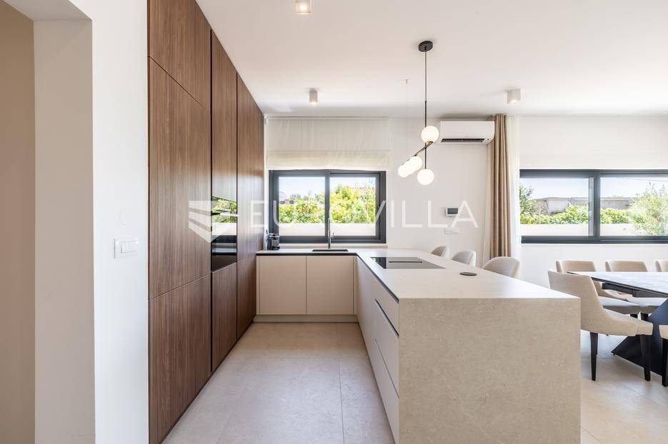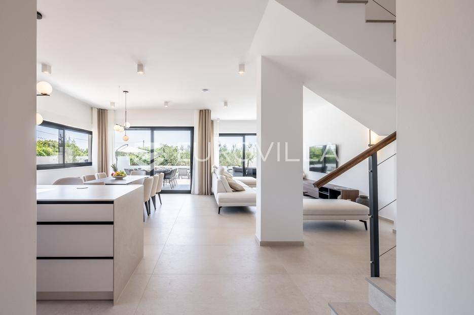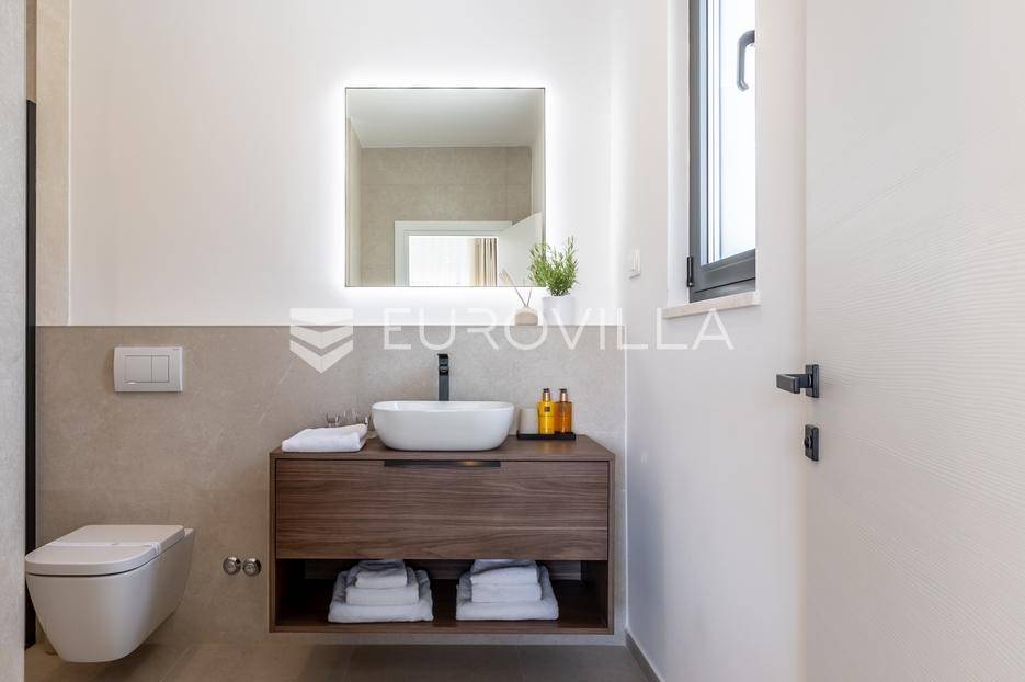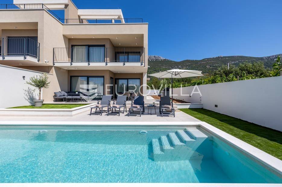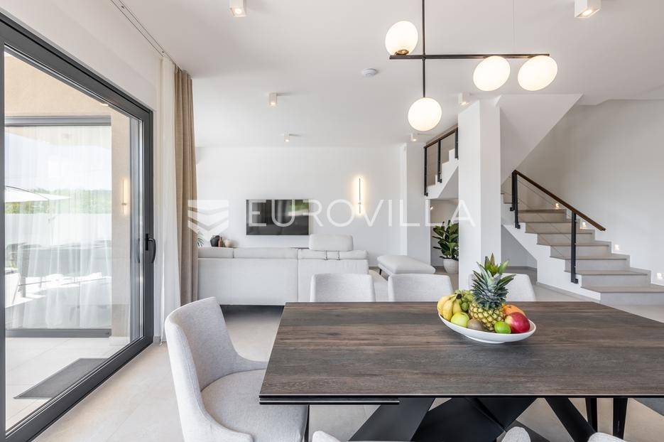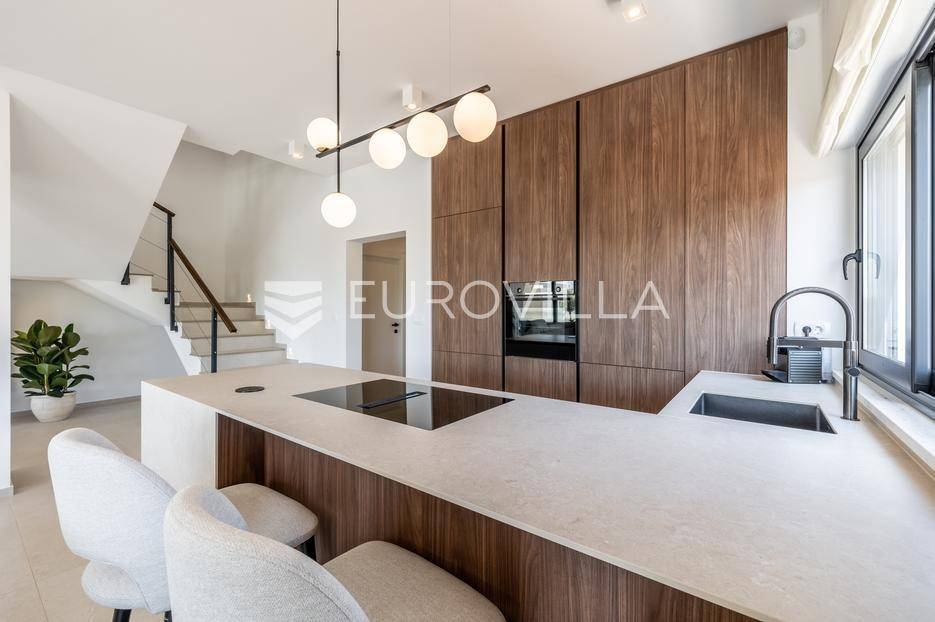Kaštel Stari, moderna tek dovršena vila s prekrasnim pogledom na more dostupna je za dugoročan najam.Vila površine 274 m2 smještena je na mirnoj lokaciji, ali u blizini svih sadržaja potrebnih za kvalitetan život. Sastoji se od prizemlje gdje je smješten dnevni dio s izlazom na terasu i vrt s grijanim bazenom i sunčalištem. Na katu su raspoređene tri spavaće sobe, četiri kupaonice i vanjska terasa s panoramskim pogledom na more i planine.Vila je kompletno namještena i opremljena podnim grijanjem u kupaonicama, videonadzorom, televizorima u svakoj sobi…Režije nisu uključene u cijenu.Više informacija na upit.... Više na eurovilla.hr, ID: 203028