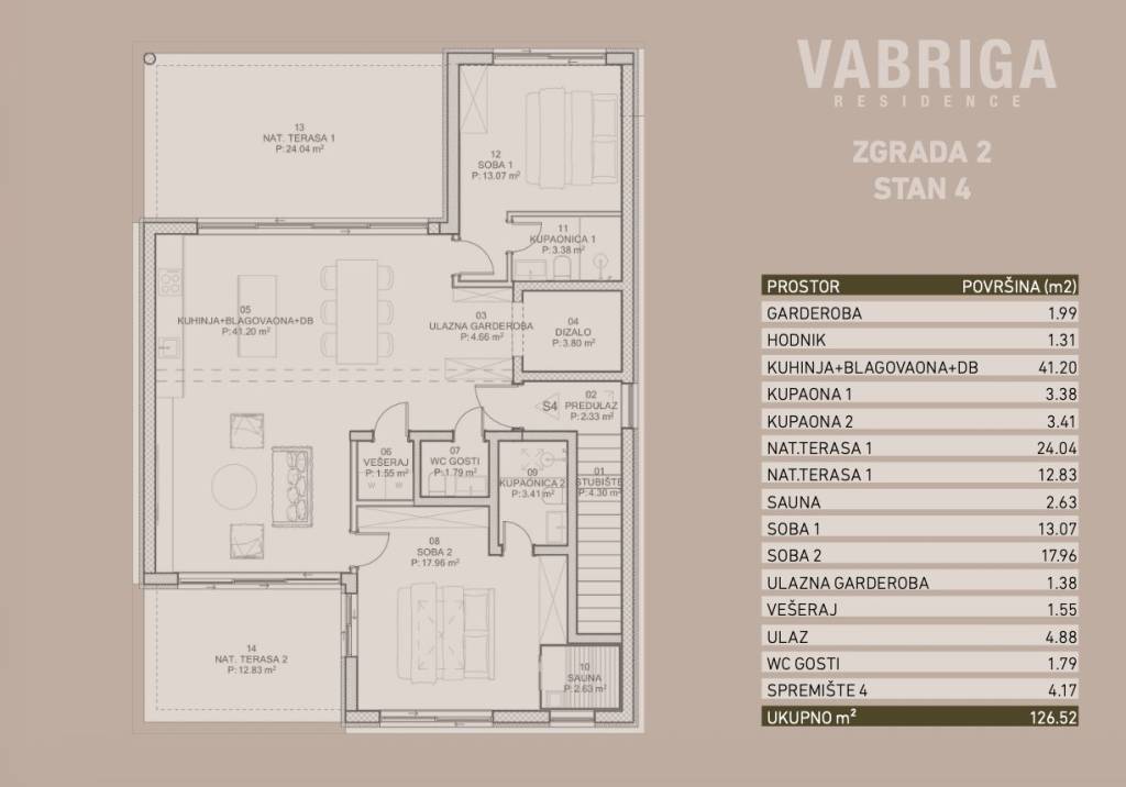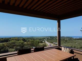 Tar-Vabriga, na prodaju je penthouse na 2. katu visokokvalitetne novogradnje, smješten u mirnom i uređenom rezidencijalnom okruženju, u blizini mora i svih važnih sadržaja.Stan ima 122 m² stambene površine te dolazi s dva privatna parkirna mjesta. Zahvaljujući svojoj poziciji na najvišoj etaži, penthouse nudi spektakularan panoramski pogled na more, koji se pruža s prostrane nenatkrivene terase, stvarajući osjećaj ekskluzivnosti i privatnosti.Unutarnji raspored osmišljen je s naglaskom na komfor i funkcionalnost te obuhvaća ulazni hodnik s garderobom, prostrani open space dnevni boravak s kuhinjom i blagovaonicom, iz kojeg se izlazi na terasu, dvije spavaće sobe, dvije kupaonice, dodatni WC, vešeraj, relax zonu te spremište.Nekretnina je projektirana prema najvišim standardima energetske učinkovitosti (A+), opremljena multi-split sustavom grijanja i hlađenja. Na parkirnim mjestima osigurani su priključci za vodu te priprema za punjenje električnih vozila, dok zgrada raspolaže dizalom renomiranog proizvođača, koje osigurava udobnost i pristupačnost u svakodnevnom korištenju.Visoku razinu kvalitete dodatno potvrđuju aluminijska stolarija s troslojnim IZO staklima, električne rolete i komarnici, troslojni hrastov parket u svim dnevnim prostorijama, kao i talijanska keramika te Hansgrohe sanitarije u kupaonicama. Zvučna i toplinska izolacija visoke učinkovitosti jamči ugodan boravak tijekom cijele godine.Stan se nalazi na svega 800 metara od mora i uređenih plaža, u jednom od najpoželjnijih dijelova Tar-Vabriga.Ova jedinstvena kombinacija estetike, suvremene tehnologije i dugotrajne kvalitete čini penthouse iznimnom ponudom na tržištu, idealnom za one koji traže dom bez kompromisa, luksuzan odmor ili sigurnu dugoročnu investiciju.... Više na eurovilla.hr, ID: 214451