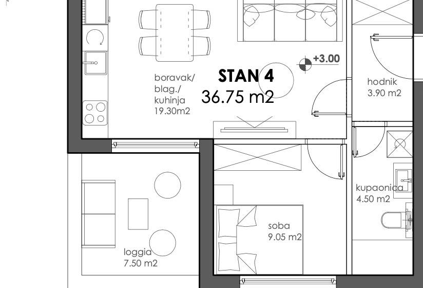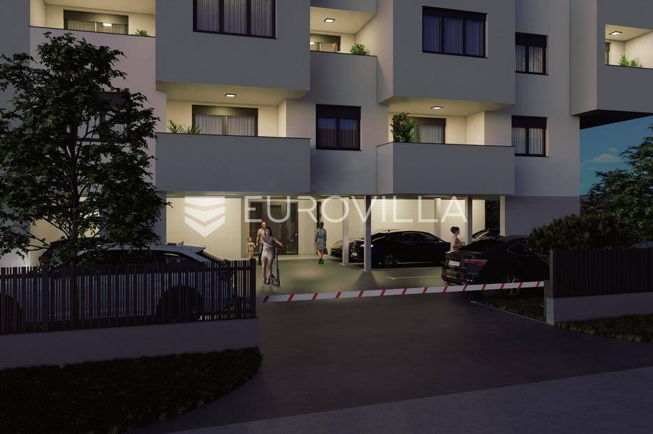 Dvosoban stan zatvorene površine 36,75 smješten na 1. katu.Sastoji se od hodnika, kupaonice, dnevnog boravka, kuhinje s blagovaonicom, spavaće sobe te lođe.Uz stan je obavezna kupnja i spremišta te parkirnog mjesta.-----Projekt suvremene stambene novogradnje s liftom izvedene u armirano-betonskoj konstrukciji s monolitnim međukatnim pločama. Pregradni zidovi izrađeni su po Knauf sustavu s ispunom od mineralne vune, a zidovi između stanova dodatno su toplinski i zvučno izolirani. Objekt je projektiran s ravnim, neprohodnim krovom u višeslojnoj izvedbi te ETICS fasadom s mineralnom vunom i stiroporom debljine 15 cm i završnim slojem silikatne žbuke.Vanjska PVC stolarija opremljena je toplinski izoliranim roletama na elektromotorni pogon, kliznim stijenama i komarnicima na svim otvorima. Unutarnja stolarija izrađena je od drva, sa zvučno izoliranim vratima, dok su ulazna vrata protuprovalna, protupožarna i zvučno izolirana.Zajednički dijelovi zgrade uključuju ulaz i stubišta obložena granitom, videonadzor, te posebno brojilo plina, vode i struje za svaki stan s mogućnošću daljinskog očitanja. U okolišu su predviđeni asfaltirani i betonski kolni prilazi, hortikulturno uređene zelene površine, dekorativna rasvjeta i odvojeni prostor za spremanje otpada.Stanovi imaju visinu prostorija od od 260 do 270 cm u dnevnim dijelovima i od 250 cm - 260 cm u kupaonicama i hodnicima. Sanitarne prostorije opremljene su kvalitetnim uređajima svjetskih proizvođača poput GROHE i TECE, s fleksibilnom hidroizolacijom, keramikom I. klase te podnim grijanjem. Predviđena je mogućnost odabira između kade ili tuš izvedbe s paravanima od kaljenog stakla. Podovi stanova obloženi su višeslojnim hrastovim parketom, dok su kuhinje, kupaonice i lođe izvedene u keramičkim pločicama.Grijanje i priprema tople vode predviđeni su putem kondenzacijskih plinskih bojlera i podnog grijanja u svim prostorijama, uz termostate u svakoj sobi. Stanovi će biti klimatizirani inverter klima uređajima (multi-split sustav). Ventilacija sanitarnih prostora riješena je niskošumnim ventilatorima, a kuhinje imaju predviđene odsisne sustave.Elektroinstalacije uključuju videoportafon u boji, LED rasvjetu, informatičku mrežu cat 6, utičnice za TV i internet u svakoj sobi te rolete na elektromotorni pogon. Sve kupaonice imaju dodatne priključke i rasvjetu prilagođenu modernom standardu.Investitor daje jamstvo na konstrukciju i hidroizolaciju od 10 godina, na ostale radove 2 godine, a na opremu i uređaje prema jamstvu proizvođača. Posebna pažnja posvećena je odabiru materijala i izvedbi, pri čemu su korišteni isključivo kvalitetni i provjereni sustavi, čime je osigurana trajnost i visoki standard stanovanja.... Više na eurovilla.hr, ID: 363905