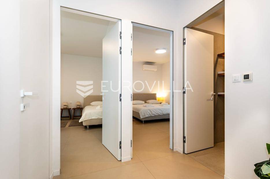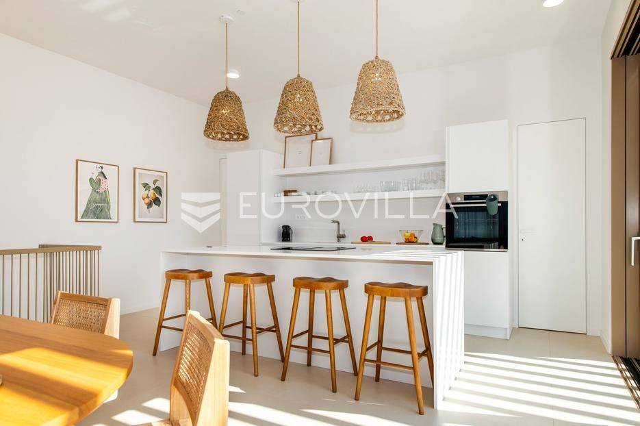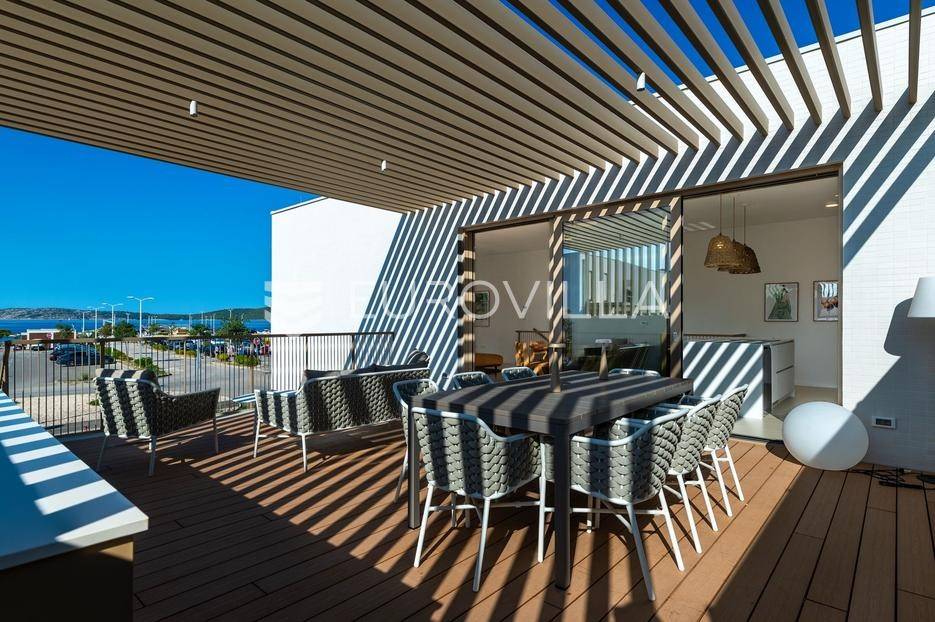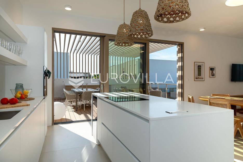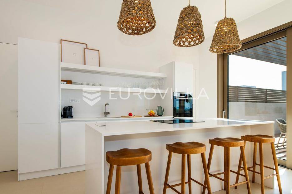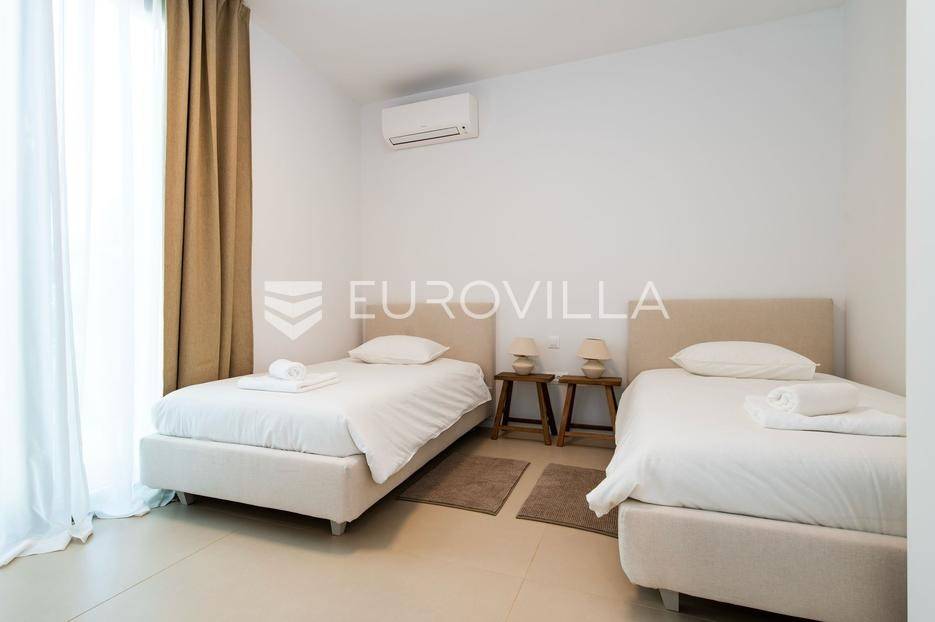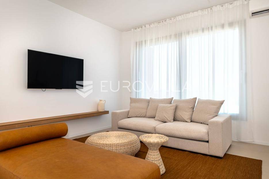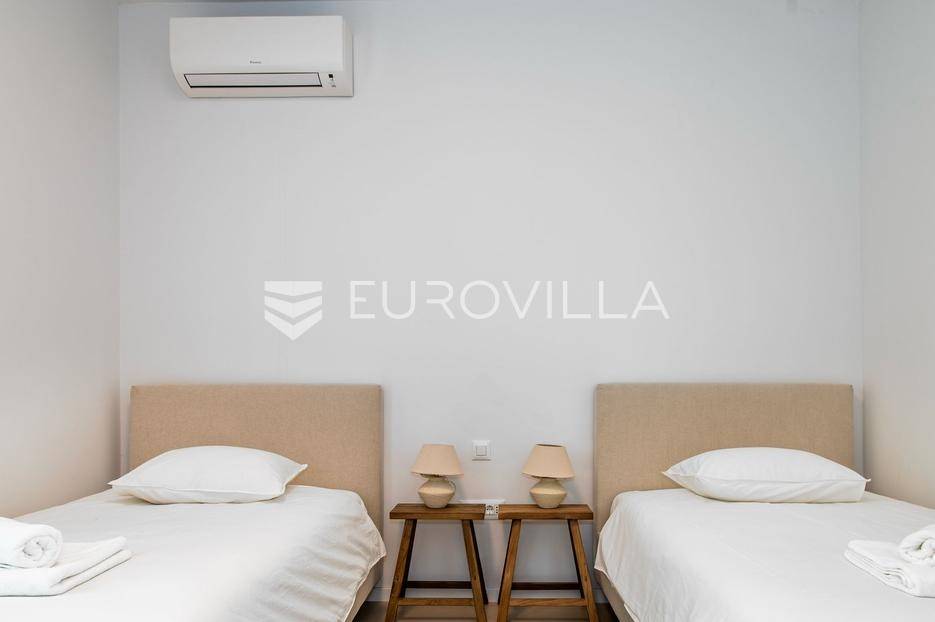 Šibenik, Brodarica, beautiful villa with a swimming pool, first row to the sea, area of 256.51 m². Available from 15.10. for a period of 6 months. Built on 2 floors on a plot of 337 m². It consists of a ground floor with 3 bedrooms, of which the master bedroom has a private bathroom, one additional bathroom, and a storage room. The bedrooms have access to the terraces and the yard with a swimming pool. On the first floor there is a spacious living room with a kitchen and dining room, a toilet and a storage room. The living room leads to a large terrace covered with a pergola. There is a summer kitchen on the terrace. There is a beautiful garden around the villa, and a sunbathing area. The villa has parking for 2 cars. The microlocation of the villa is excellent, it is located right on the beach, and only a few kilometers from Šibenik. All other information on request.... More on eurovilla.hr, ID: 587109