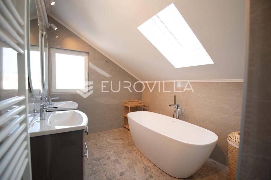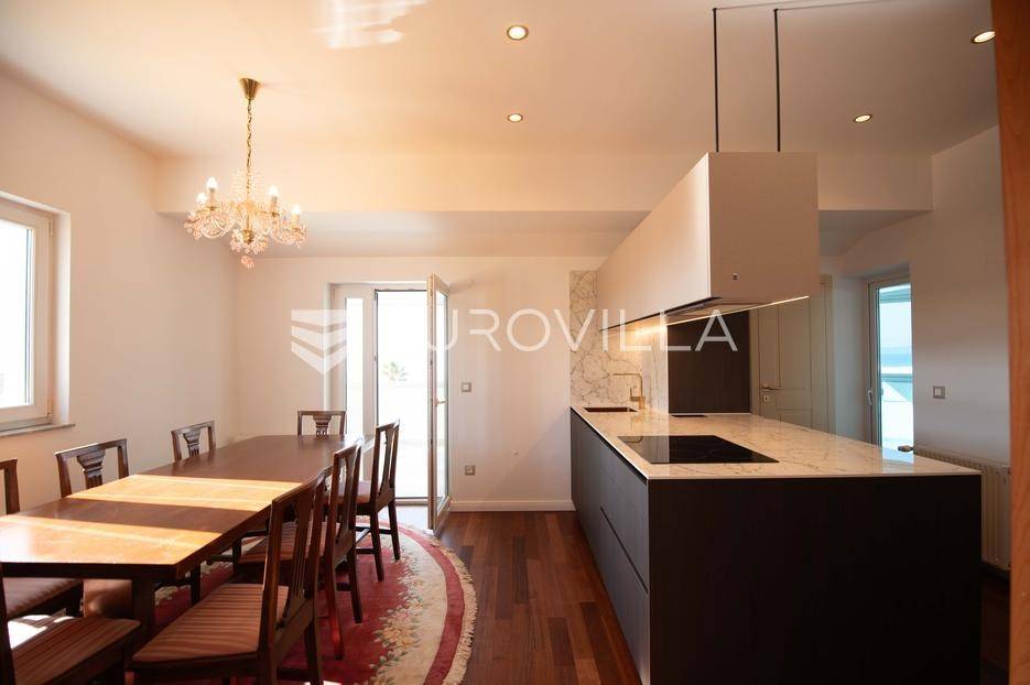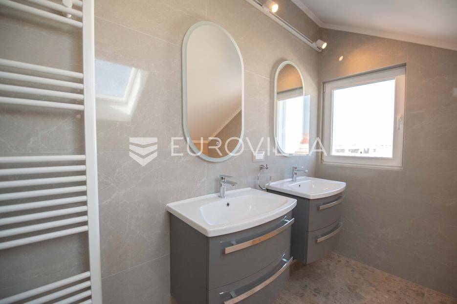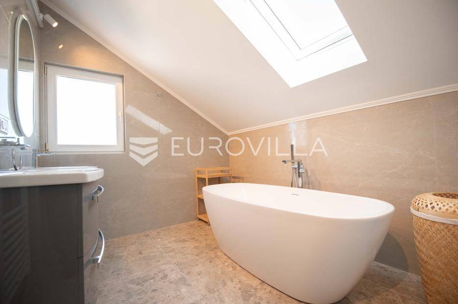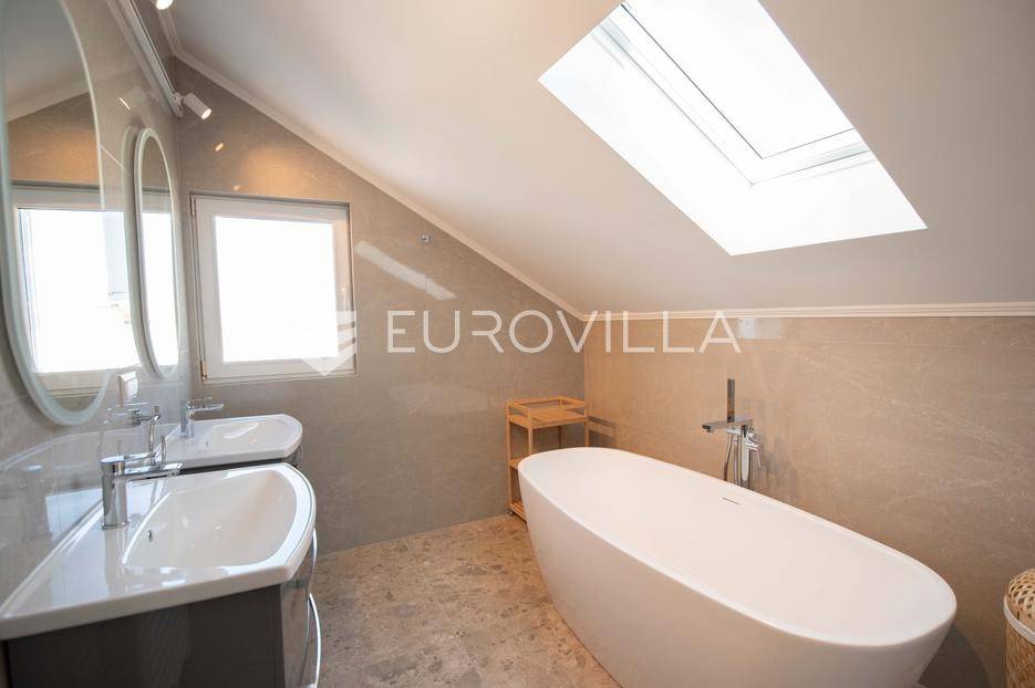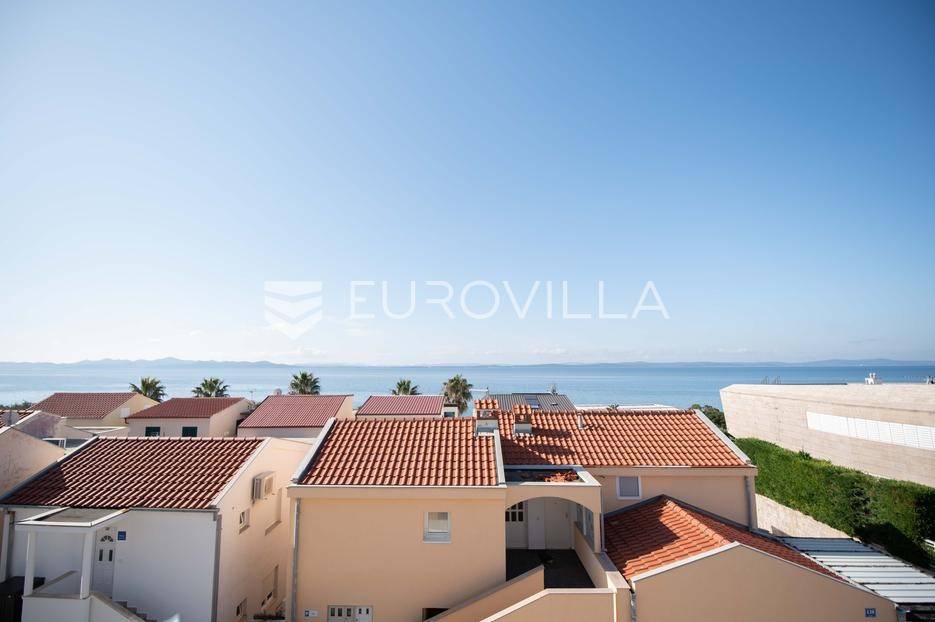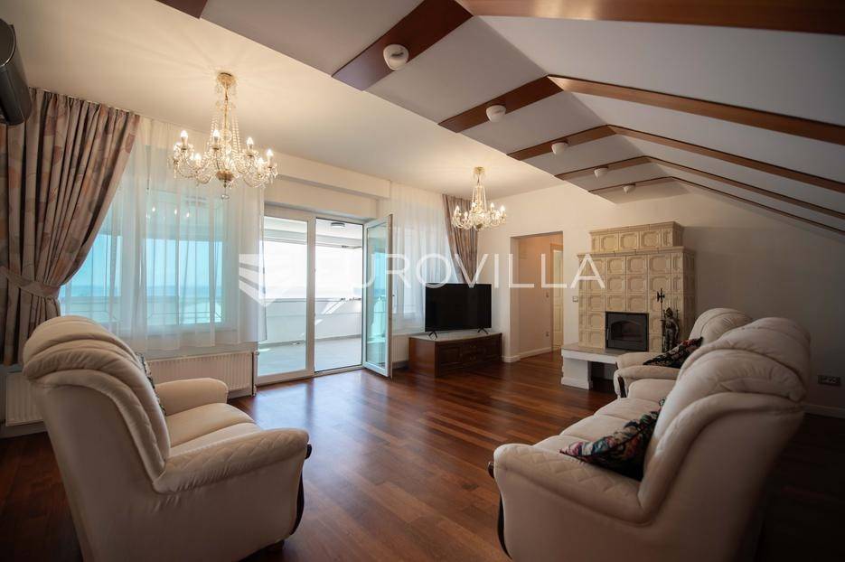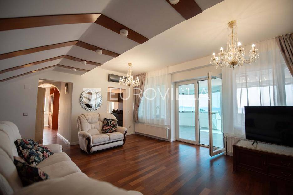 Zadar, Petrčane, luksuzno opremljen stan na atraktivnoj lokaciji, površine 168,38 m2.Nalazi se na drugom katu u visokom potkrovlju zgrade.Sastoji se od ulaznog prostora u kojem se nalazi ostava te garderoba, dvije komforne spavaće sobe, kuhinje i blagovaonice ( 18,68 m2), dnevnog boravka povšrine 29,50 m2, kupaonice, gostinjskog wc-a, vešeraja, dvije prostrane natkrivene terase s kojih se pruža prekrasan pogled na more i otoke.Stan je potpuno renoviran 2025. godine.Oprema:grijanje i hlađenje pute klima uređajacentralno grijanjekalijeva peć/kaminparket prve klasekeramičke pločice i sanitarije vrhunske klasevelux krovni prozorinova fasada i nove instalacijeStanu pripada jedno parkirno mjesto na kojem je moguće parkirati dva vozila.Udaljenost od mora i plaže je svega 80 metara.Nalazi se u mirnom dijelu apartmantskog naselja Punta Skala, u blizini svih sadržaja potrebnih za svakodnevi život.Ova nekretnina predstavlja izvrsnu priliku za one koji žele luksuzan život uz more. Izvrsna je i kao investicija za sve koji se žele baviti turizmom.Više informacija na upit.... Više na eurovilla.hr, ID: 633312
