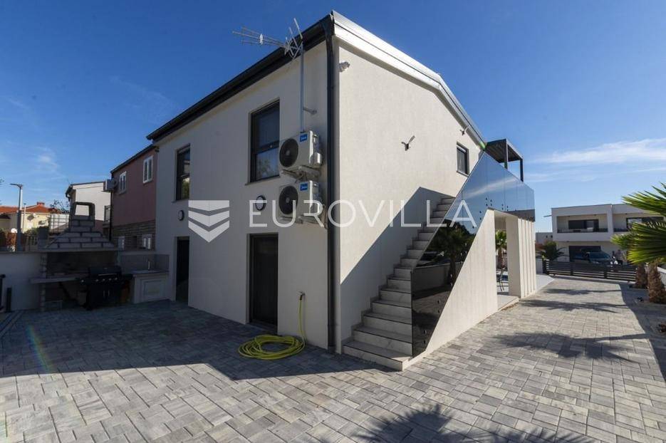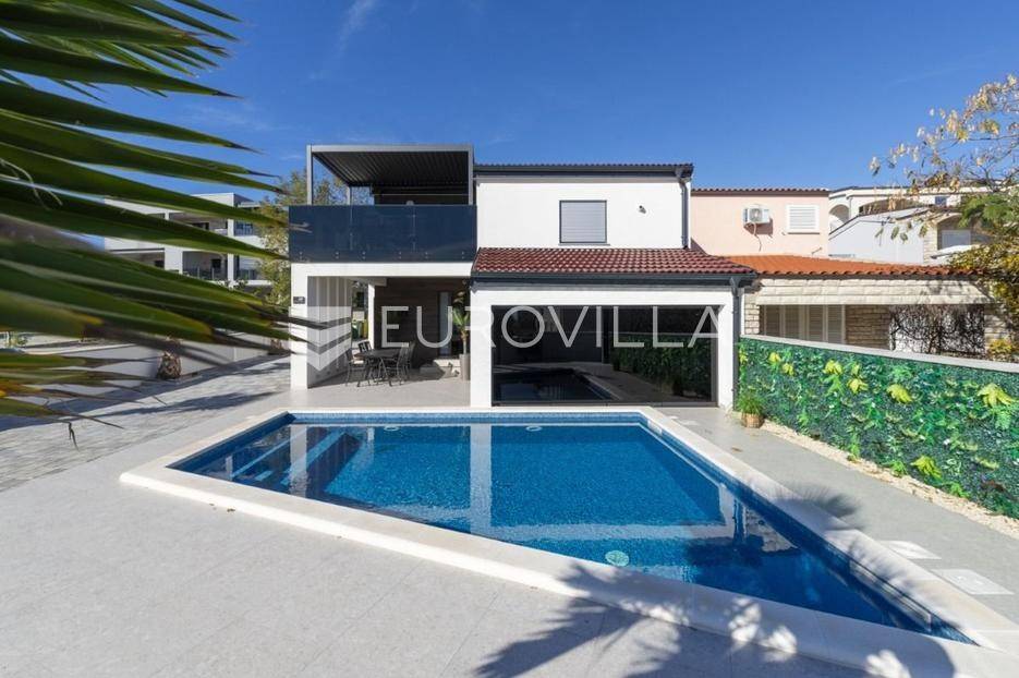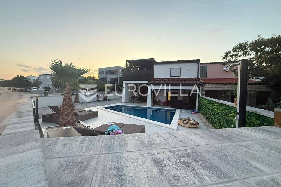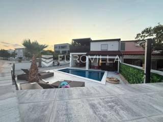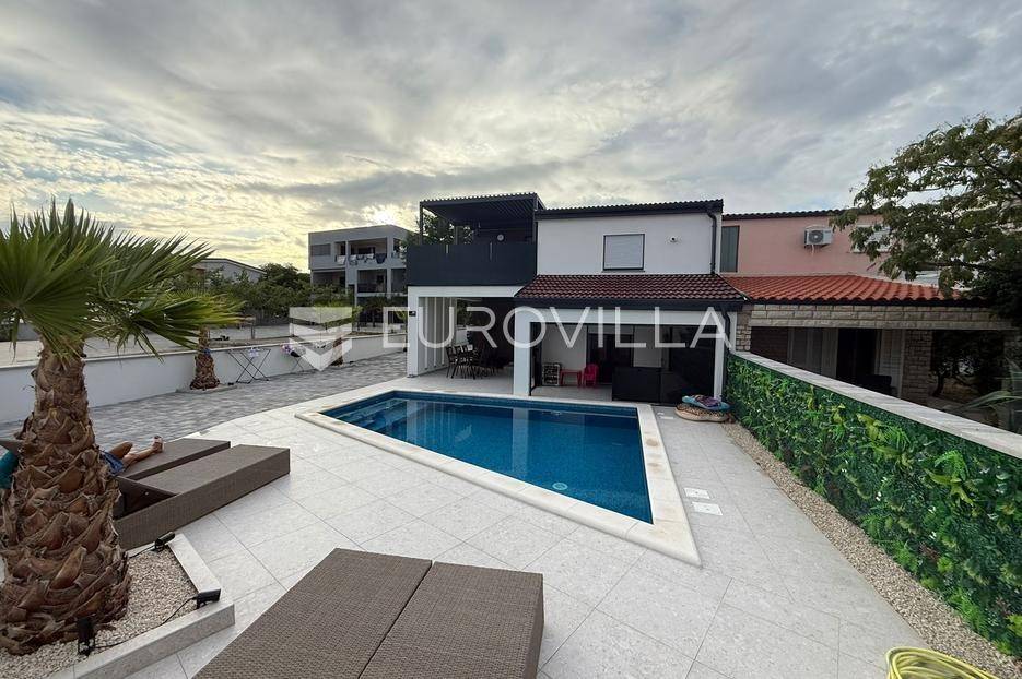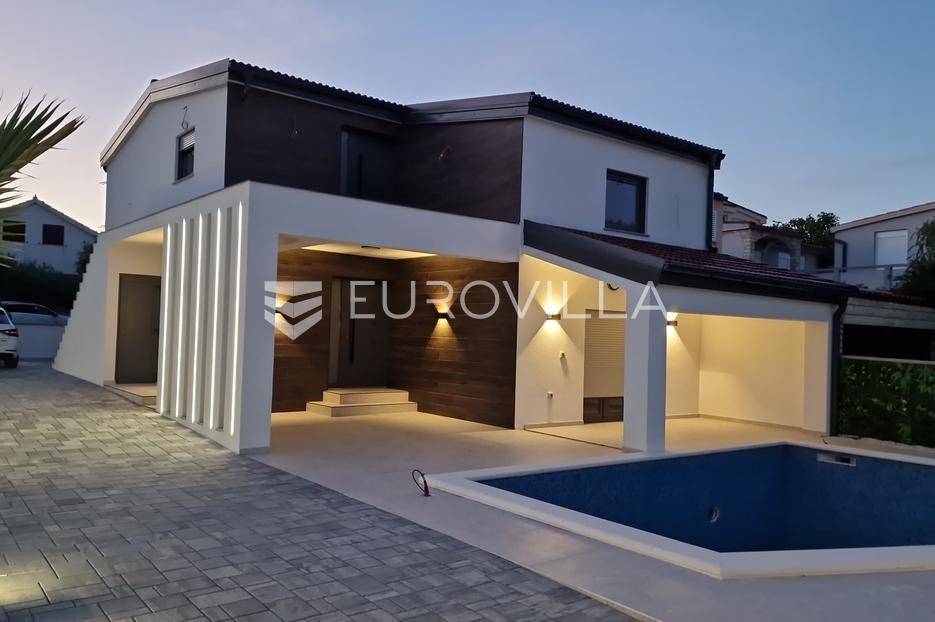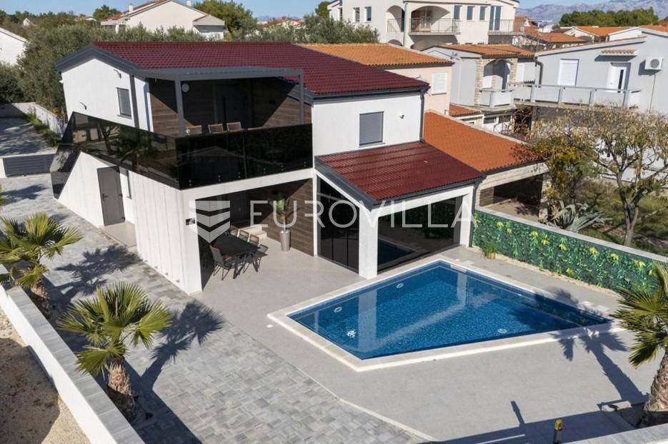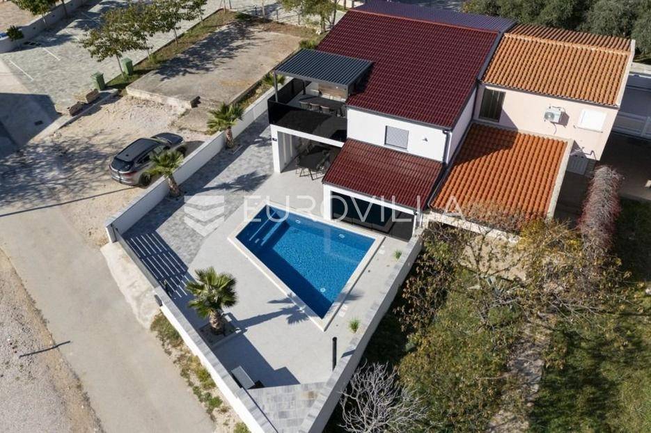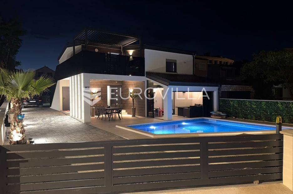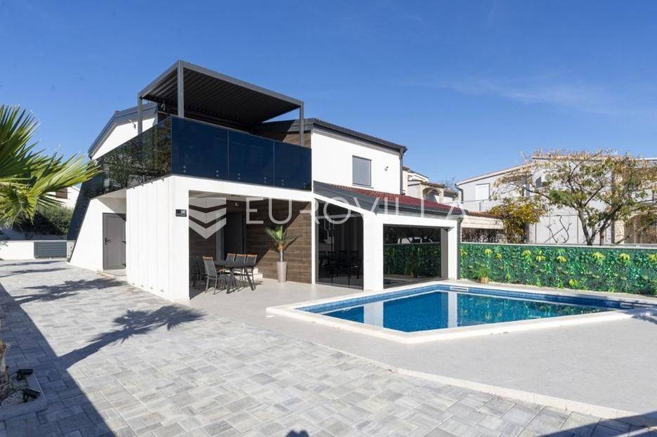 Na atraktivnoj lokaciji u blizini popularne plaže Jadro na otoku Viru smještena je ova moderna dvojna kuća s grijanim bazenom i dva potpuno odvojena stana, idealna za višegeneracijsko stanovanje ili turistički najam. Lokacija u mirnoj ulici, a opet na pješačkoj udaljenosti od centra i plaže, osigurava privatnost i udobnost.Ključne značajkePovršina zemljišta: 344 m²Grijani bazen: 28 m²Vanjski parking, uređena okućnica i palmeStan u prizemljuUnutarnja površina: 72 m²Natkrivena i zatvorena terasa: 36 m²Vanjsko spremište: 4 m²Ukupno: 112 m²Stan na katuUnutarnja površina: 72 m²Natkrivena terasa: 22 m²Ukupno: 94 m²Oba stana su moderno i luksuzno uređena, potpuno klimatizirana, s dizajnerskim namještajem i opremom visoke kvalitete. Prostrane terase i vanjski prostor s bazenom stvaraju savršeno mjesto za uživanje tijekom cijele godine.Zona Jadro poznata je po uređenim plažama, živopisnoj šetnici te brojnim restoranima i sadržajima, što je čini savršenim izborom za obiteljski odmor i turistički najam. Blizina centra, potpuna komunalna uređenost i visoka potražnja čine ovu lokaciju sigurnom i isplativom investicijom.Za dodatno više informacija stojimo na raspolaganju.... Više na eurovilla.hr, ID: 690880