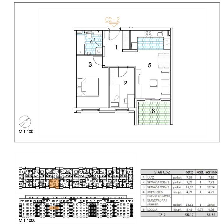 Trosoban stan površine 54,82 m2 smješten na 2. katu.Stan C2-2 sastoji se od ulaza, 2 spavaće sobe, kupaonice, dnevnog boravka, kuhinje s blagovaonicom te loggije.Velika Gorica, projekt stambene novogradnje namijenjen stalnom stanovanju, koji obuhvaća 91 stambenu jedinicu. U sklopu zgrade osigurano je ukupno 182 garažnih i parkirnih mjesta, od čega je 28 garažnih mjesta smješteno u prizemlju, 97 garažnih i parkirnih mjesta u podzemnoj etaži te dodatnih 57 parkirnih mjesta na razini terena.Uz kupnju stana obavezna je kupnja garažnog mjesta na -1 etaži po cijeni od 25.000,00 EUR ili garažnog mjesta na 0 etaži po cijeni od 30.000,00 EUR zajedno s parkirnim garažnim mjestom po cijeni od 18.000,00 EUR ili vanjskim parkirnim mjestom po cijeni od 10.000,00 EUR. Dakle, garažno mjesto na -1 etaži ili garažno mjesto na 0 etaži + garažno parkirno mjesto ili vanjsko parkirno mjesto.Građevina je projektirana kao armiranobetonska konstrukcija, međusobno povezana zidovima i gredama, s punim armiranobetonskim stropnim pločama i ravnim krovom. Vertikalni konstruktivni sustav čine armiranobetonski zidovi debljine 20 cm izvedeni kroz sve etaže, dok horizontalni sustav čine armiranobetonske ploče debljine 20 cm.Pročelje je predviđeno s toplinskom izolacijom debljine 15 cm u ETICS sustavu, izvedenom od EPS-a, a u zonama požarnih prekida, u kontaktu sa stubištem i na podgledu prizemlja od mineralne vune iste debljine. Završna obrada izvodi se armiranom mrežicom, gletanjem i završnim slojem u boji i teksturi prema projektu. Vanjska stolarija predviđena je kao PVC, u tonu definiranom projektom.Krov je projektiran kao ravni neprohodni krov, a svi slojevi izvedeni su u skladu s projektom fizike zgrade. Unutarnji pregradni zidovi izvode se kao gipskartonski, debljine 10 do 20 cm, ovisno o namjeni prostora, uz primjenu potrebne zvučne izolacije gdje je to predviđeno. Zidne površine su završno obrađene soboslikarskim radovima u boji prema projektu.Podovi u stanovima izvode se kao plivajući sustav s toplinskom izolacijom od polistirena i cementnim estrihom. Završne podne obloge predviđene su prema namjeni prostora: keramika u sanitarijama, kuhinjama i na vanjskim površinama, a troslojni hrastov parket u dnevnim boravcima, blagovaonicama, ulaznim prostorima i spavaćim sobama. U ponudi su tri varijante keramičkih pločica.Grijanje je riješeno plinskim etažnim podnim sustavom. Stanovi su opremljeni klima uređajima marke Bosch, PVC stolarijom s električnim roletama, troslojnim hrastovim parketom te sobnim vratima proizvođača RV Križevci. Ulazna vrata u stanove su protuprovalna, proizvođača Kolnoa sa sustavom zaključavanja Multilock.Useljenje 05/27Za sva pitanja Vam stojimo na raspolaganju.... Više na eurovilla.hr, ID: 871584