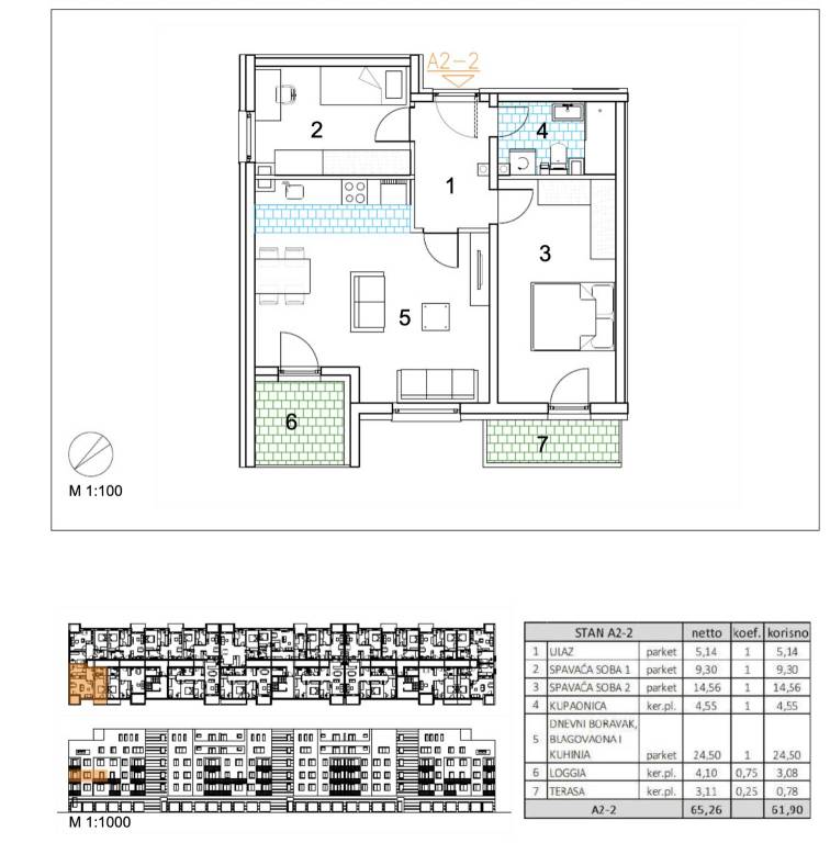 Trosoban stan površine 61,90 m2 smješten na 2. katu.Stan A2-2 sastoji se od ulaza, 2 spavaće sobe, kupaonice, dnevnog boravka, kuhinje s blagovaonicom, terase te loggije.Velika Gorica, projekt stambene novogradnje namijenjen stalnom stanovanju, koji obuhvaća 91 stambenu jedinicu. U sklopu zgrade osigurano je ukupno 182 garažnih i parkirnih mjesta, od čega je 28 garažnih mjesta smješteno u prizemlju, 97 garažnih i parkirnih mjesta u podzemnoj etaži te dodatnih 57 parkirnih mjesta na razini terena.Uz kupnju stana obavezna je kupnja garažnog mjesta na -1 etaži po cijeni od 25.000,00 EUR ili garažnog mjesta na 0 etaži po cijeni od 30.000,00 EUR zajedno s parkirnim garažnim mjestom po cijeni od 18.000,00 EUR ili vanjskim parkirnim mjestom po cijeni od 10.000,00 EUR. Dakle, garažno mjesto na -1 etaži ili garažno mjesto na 0 etaži + garažno parkirno mjesto ili vanjsko parkirno mjesto.Građevina je projektirana kao armiranobetonska konstrukcija, međusobno povezana zidovima i gredama, s punim armiranobetonskim stropnim pločama i ravnim krovom. Vertikalni konstruktivni sustav čine armiranobetonski zidovi debljine 20 cm izvedeni kroz sve etaže, dok horizontalni sustav čine armiranobetonske ploče debljine 20 cm.Pročelje je predviđeno s toplinskom izolacijom debljine 15 cm u ETICS sustavu, izvedenom od EPS-a, a u zonama požarnih prekida, u kontaktu sa stubištem i na podgledu prizemlja od mineralne vune iste debljine. Završna obrada izvodi se armiranom mrežicom, gletanjem i završnim slojem u boji i teksturi prema projektu. Vanjska stolarija predviđena je kao PVC, u tonu definiranom projektom.Krov je projektiran kao ravni neprohodni krov, a svi slojevi izvedeni su u skladu s projektom fizike zgrade. Unutarnji pregradni zidovi izvode se kao gipskartonski, debljine 10 do 20 cm, ovisno o namjeni prostora, uz primjenu potrebne zvučne izolacije gdje je to predviđeno. Zidne površine su završno obrađene soboslikarskim radovima u boji prema projektu.Podovi u stanovima izvode se kao plivajući sustav s toplinskom izolacijom od polistirena i cementnim estrihom. Završne podne obloge predviđene su prema namjeni prostora: keramika u sanitarijama, kuhinjama i na vanjskim površinama, a troslojni hrastov parket u dnevnim boravcima, blagovaonicama, ulaznim prostorima i spavaćim sobama. U ponudi su tri varijante keramičkih pločica.Grijanje je riješeno plinskim etažnim podnim sustavom. Stanovi su opremljeni klima uređajima marke Bosch, PVC stolarijom s električnim roletama, troslojnim hrastovim parketom te sobnim vratima proizvođača RV Križevci. Ulazna vrata u stanove su protuprovalna, proizvođača Kolnoa sa sustavom zaključavanja Multilock.Useljenje 05/27Za sva pitanja Vam stojimo na raspolaganju.... Više na eurovilla.hr, ID: 969903