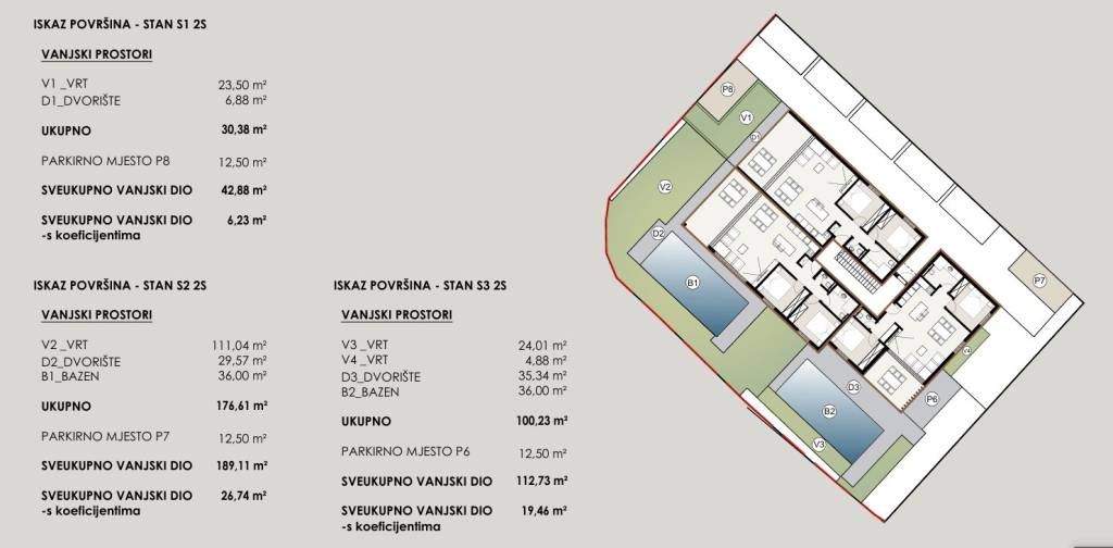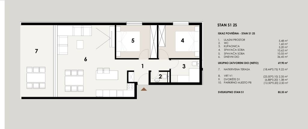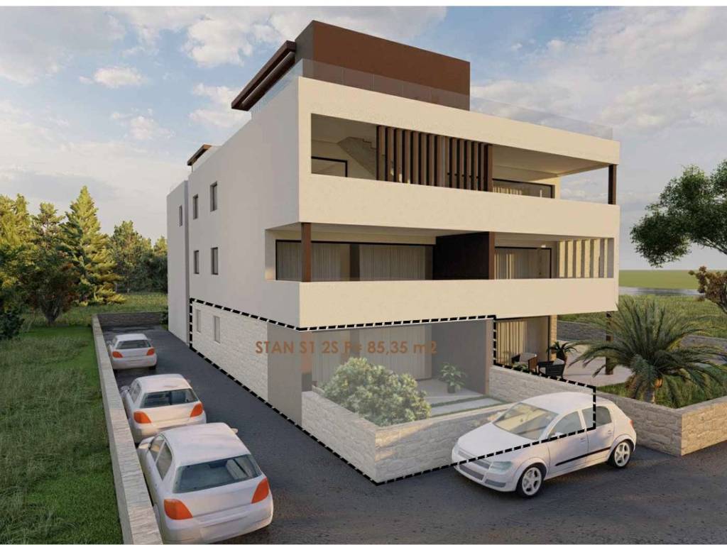 NOVOGRADNJA – Stan S1 u prizemlju zgrade s vrtom, samo 60 m od pješčane plaže . Prodaje se stan u prizemlju novogradnje sa 8 stanova, smještenoj u mirnom dijelu Privlake. Zgrada je u gradnji, a useljenje se planira u svibnju 2026. Stan oznake S1se sastoji od ulaznog prostora, kuhinje s blagavaonom i dnevnim boravkom, dvije spavaće sobe, kupaone i wc-a, ukupno 69,90 m2 stambeno, plus natkrivena terasa 18,44 m2 po koef 0,75 9,22 m2), vrt od 23,50 m2, dvorište 6,88 m2 i jedno parkirno mjesto. Ukupno stan oznake S1 sa pripatcima ima 85,35 m2. • Vrhunska unutarnja stolarija • PVC stolarija s ALU roletama na elektro pogon, troslojno staklo s Low-e premazom, komarnici • Podovi: parket i keramika I. klase Dodatne pogodnosti: • Visok energetski standard (A razred) • Kupac ne plaća porez na promet nekretnina • Cijena: 345.000 EUR . U zgradi su na prodaju sljedeći stanovi: S1 - prizemlje, dvosoban stan sa vrtom 85,35 m² – 345.000,00 € S2 - prizemlje, dvosoban stan sa vrtom i bazenom 108,55 m² , kompletno namješten 545 000 eura. S3 – prizemlje, dvosoban stan sa vrtom i bazenom 97,87 m² - kompletno namješten 490.000 € . S4 - 1. kat, dvosoban stan 80,75 m² – 325.000,00 € S5 - 1. kat, dvosoban stan 80,70 m² – 365.000,00 € S6 – 1. kat, dvosoban stan 80,72 m² – 340.000,00 € S7 – 2. kat trosoban stan sa krovnom terasom 158,33 m² – 760.000,00 € (namješten). S8 - 2. kat, trosoban stan sa krovnom terasom 157,69 m² – 720.000,00 € (namješten). Četiri stana će biti kompletno namještena stanovi S2 i S3 u prizemlju i stanovi S7 i S8 na 2 katu . U cijenu je uključen namještaj, ostali se prodaju nenamješteni. Zgrada je u gradnji te se planira završetak do sezone 2026. godine.