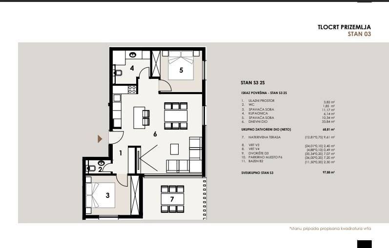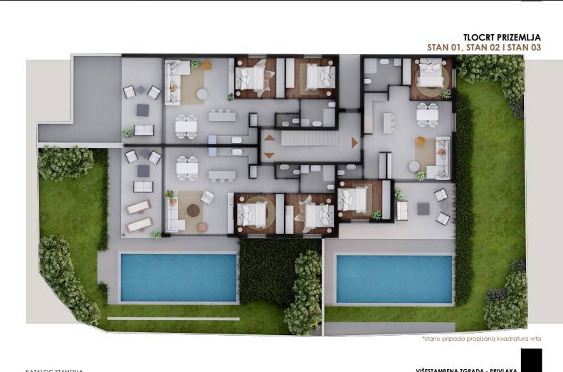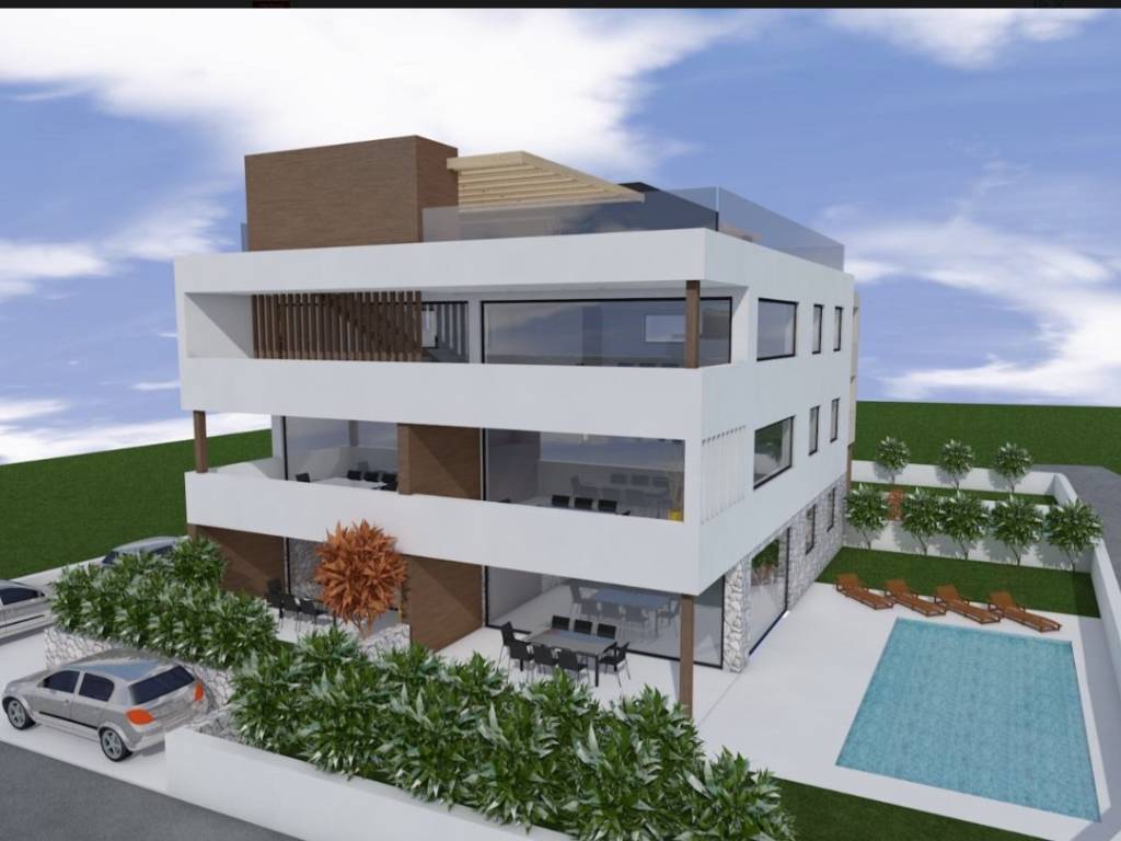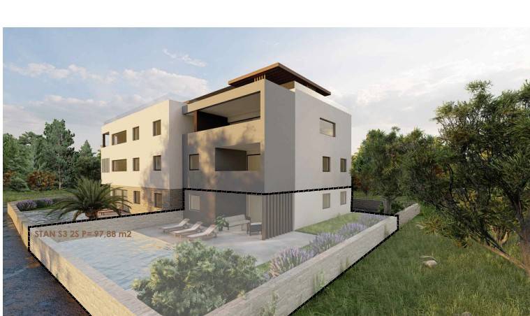 NOVOGRADNJA – Stan S3 u prizemlju zgrade s vrtom i bazenom, samo 60 m od pješčane plaže . Prodaje se stan u prizemlju novogradnje sa 8 stanova, smještenoj u mirnom dijelu Privlake. Zgrada je u gradnji, a useljenje se planira u svibnju 2026. Stan oznake S3 se sastoji od ulaznog prostora, kuhinje s blagavaonom i dnevnim boravkom, dvije spavaće sobe, kupaone i wc-a, ukupno 68,81 m2 stambeno, plus natkrivena terasa 12,8 m2 po koef 0,75 9,61 m2), vrt od 30 m2, dvorište 35,34 m2, bazen površine 11,5 m2 i jedno parkirno mjesto. Ukupno stan oznake S3 sa pripatcima ima 97,88 m2. • Vrhunska unutarnja stolarija • PVC stolarija s ALU roletama na elektro pogon, troslojno staklo s Low-e premazom, komarnici • Podovi: parket i keramika I. klase Dodatne pogodnosti: • Visok energetski standard (A razred) • Kupac ne plaća porez na promet nekretnina • Cijena: 490 000 EUR . U cijenu je uključen namještaj. U zgradi su na prodaju sljedeći stanovi: S1 - prizemlje, dvosoban stan sa vrtom 85,35 m² – 345.000,00 € S2 - prizemlje, dvosoban stan sa vrtom i bazenom 108,55 m² , kompletno namješten 545 000 eura. S3 – prizemlje, dvosoban stan sa vrtom i bazenom 97,87 m² - kompletno namješten 490.000 € . S4 - 1. kat, dvosoban stan 80,75 m² – 325.000,00 € S5 - 1. kat, dvosoban stan 80,70 m² – 365.000,00 € S6 – 1. kat, dvosoban stan 80,72 m² – 340.000,00 € S7 – 2. kat trosoban stan sa krovnom terasom 158,33 m² – 760.000,00 € (namješten). S8 - 2. kat, trosoban stan sa krovnom terasom 157,69 m² – 720.000,00 € (namješten). Četiri stana će biti kompletno namještena stanovi S2 i S3 u prizemlju i stanovi S7 i S8 na 2 katu . U cijenu je uključen namještaj, ostali se prodaju nenamješteni. Zgrada je u gradnji te se planira završetak do sezone 2026. godine.