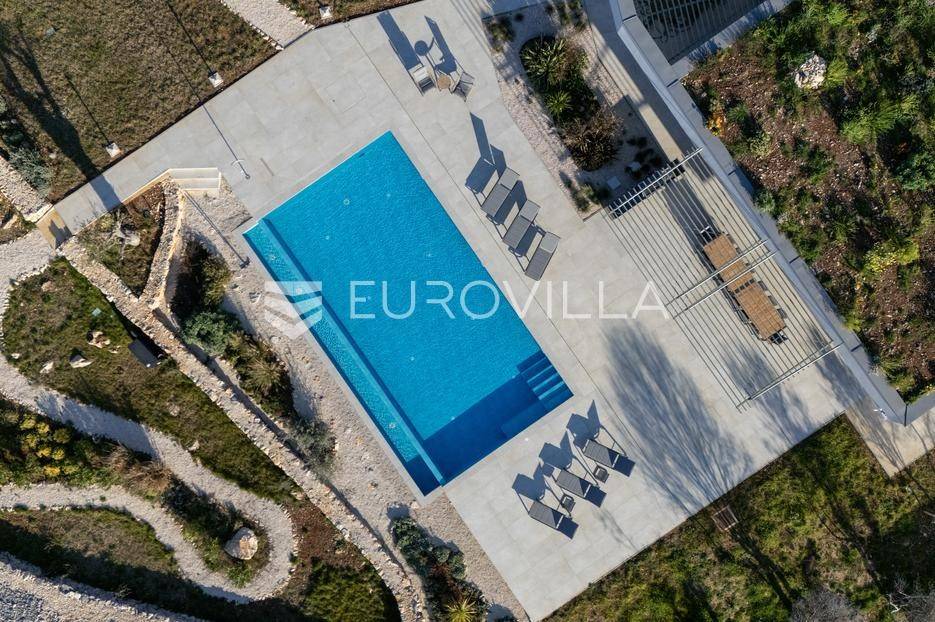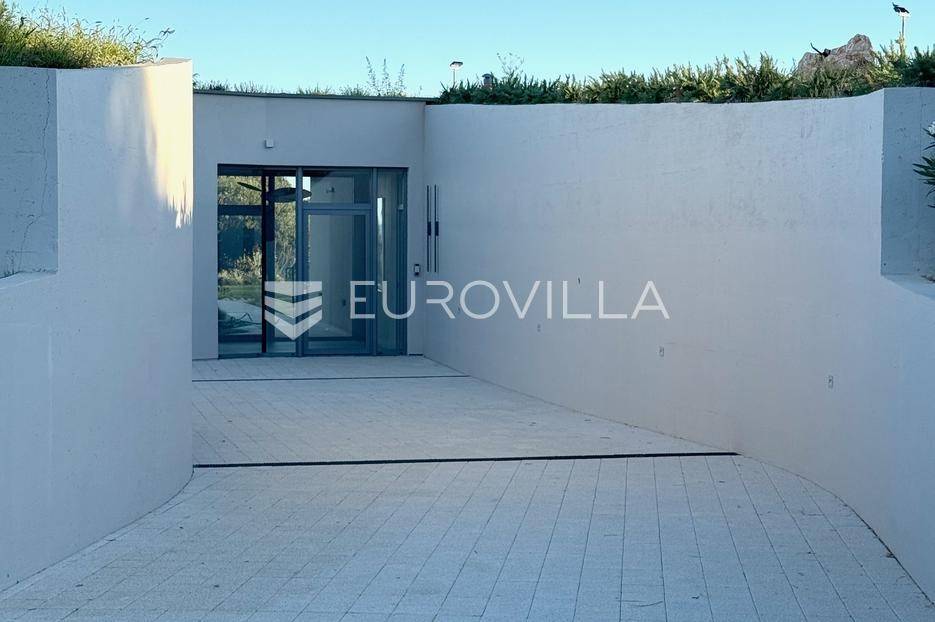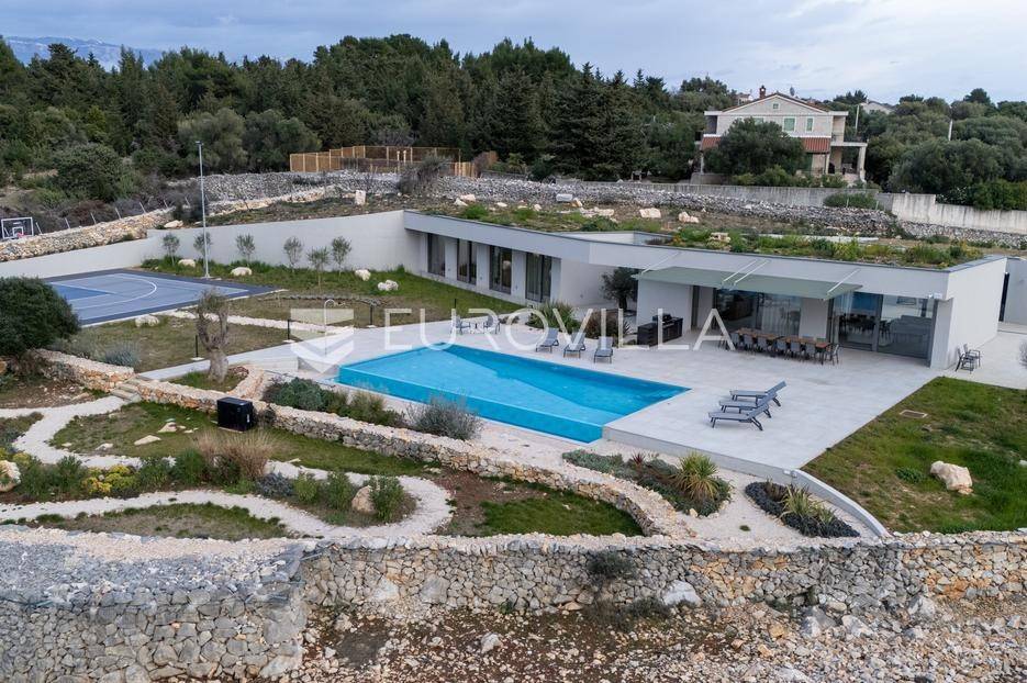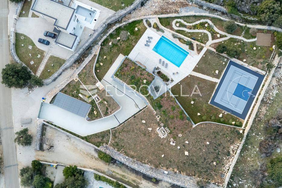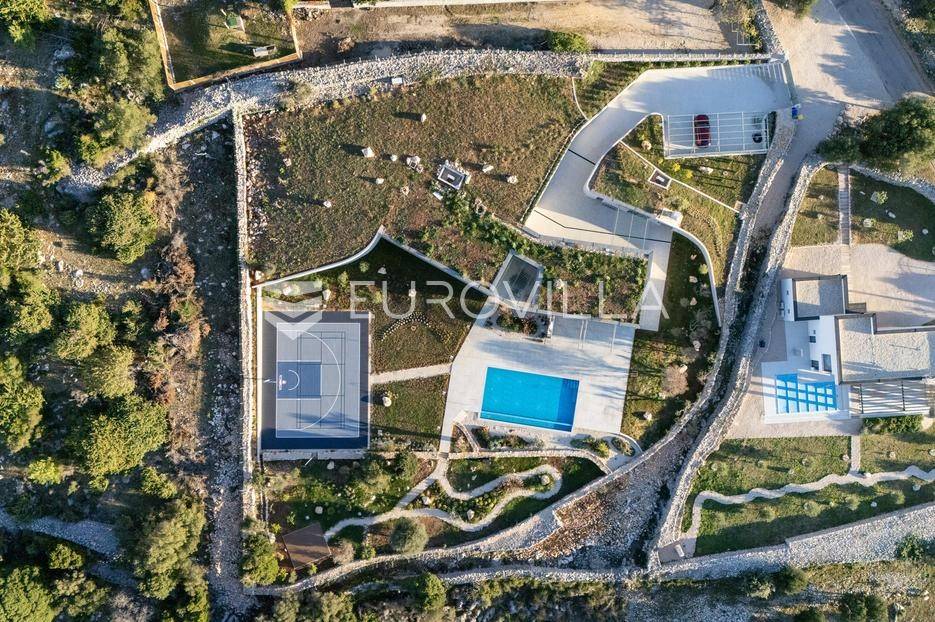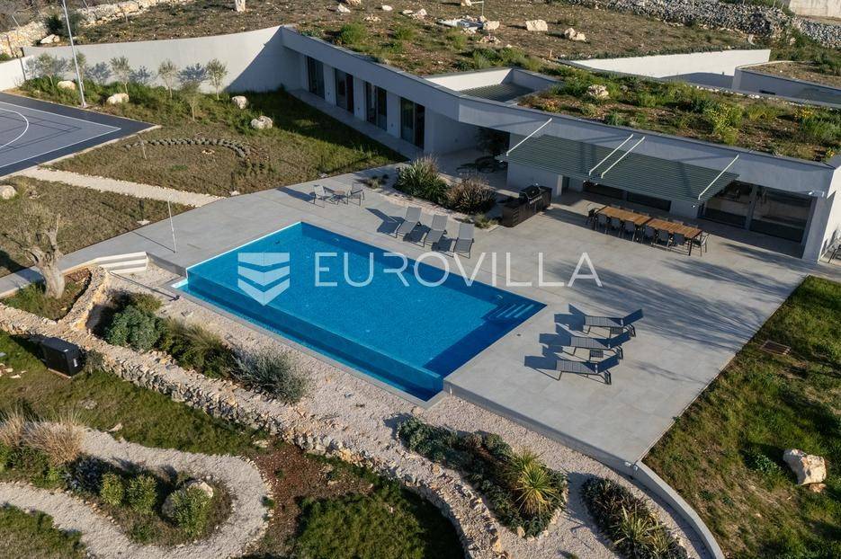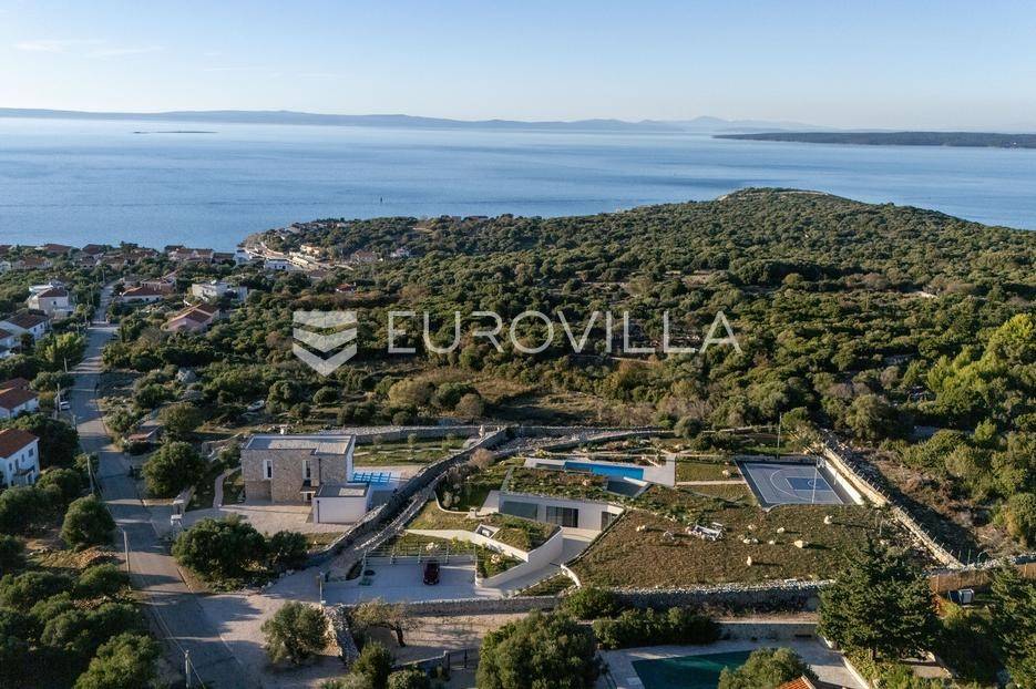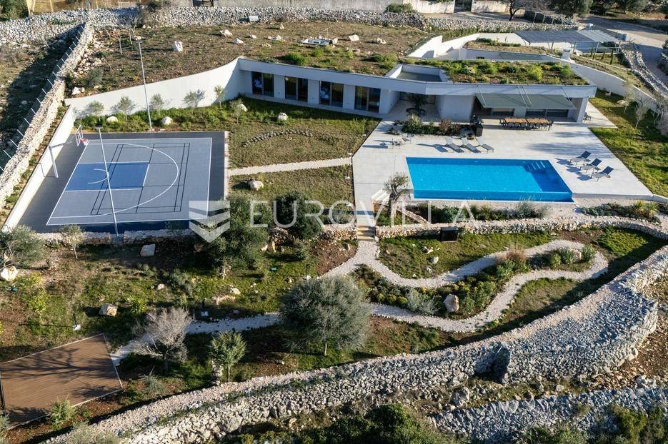 Vila jedinstvene arhitekture u masliniku, Lun – otok Pag | 300 m² | parcela 4.025 m² | pogled na more u 3 stranePredstavljamo vilu posebne i jedinstvene arhitekture na spektakularnoj, intimnoj lokaciji u blizini mjesta Lun na otoku Pagu. Smještena usred drevnog maslinika, vila je ukopana u teren i prekrivena zelenim krovom, čime se prirodno stapa s okolišem i ostavlja dojam potpune privatnosti.Nalazi se na parceli površine 4.025 m², s koje se pruža neometan panoramski pogled na more u čak tri strane svijeta.Arhitektura i interijerVila raspolaže s ukupno 300 m² stambenog prostora, osmišljena za obitelji i veće skupine. Ulaz vodi u privatno dvorište, a sama se vila potom potpuno otvara prema moru.Unutrašnjost karakteriziraju 3 metra visoki stropovi, osjećaj prostranosti i jednostavan, suvremen dizajn. Sirovi betonski zidovi stvaraju snažan kontrast mediteranskom krajoliku izvana, dok toplinu unose detalji u hrastu i namještaj vrhunskih europskih dizajnera (Prostoria, Hay, Bolia).RasporedDnevni boravak 75 m² – svijetao, prostran i miran, centralni dio kućeModerna kuhinja dizajnirana za zajedničko kuhanje i “život na terasi”4 spavaće sobe (svaka cca 18 m²)Svaka spavaća soba ima vlastitu prostranu kupaonicuEksterijer i sadržajiGrijani bazen i terasa stvoreni su za opuštanje danju i promatranje zvijezda noću. S terase se vide Rab, Cres i Mali Lošinj, a za vedrih dana pogled se proteže sve do istarskih planina.Na posjedu se dodatno nalazi:privatni teren za košarku i badmintonteretana, sauna i vanjska kuhinja s roštiljem i kominom4 natkrivena parkirna mjesta2 EV punjačaDodatna oprema (izdvajamo)Starlink Wi-Fi (high speed)videonadzor cijelog objekta + detektori dimasustav filtriranja vodebazen s hlađenjem, grijanjem i hidromasažompotpuno ograđeno dvorište za maksimalnu privatnostsauna s tušem + potpuno opremljena teretanai još mnogo togaLokacija koja se ne ponavljaVila se nalazi unutar zaštićenog rezervata divljih maslina, među nekima od najstarijih na svijetu. Ovo je područje botanički rezervat od 1963. godine. Pag je otok kamena, soli i širokih horizonta, a pravi luksuz ovdje znači jedno: mir, prostor i privatnost.Obratite nam se za više informacija i dogovor termina razgledavanja ove jedinstvene vile.... Više na eurovilla.hr, ID: 752404