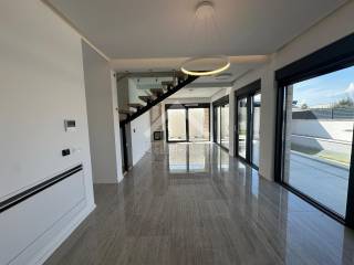 The house consists of a ground floor and an upper floor. Each room in the house has access to a terrace. On the ground floor there is a kitchen with dining room, living room, hallway, toilet and a room (bedroom/mini gym or study with attached bathroom and sauna). Internal stairs lead to the first floor where there are 4 bedrooms, each with its own bathroom and wardrobe.