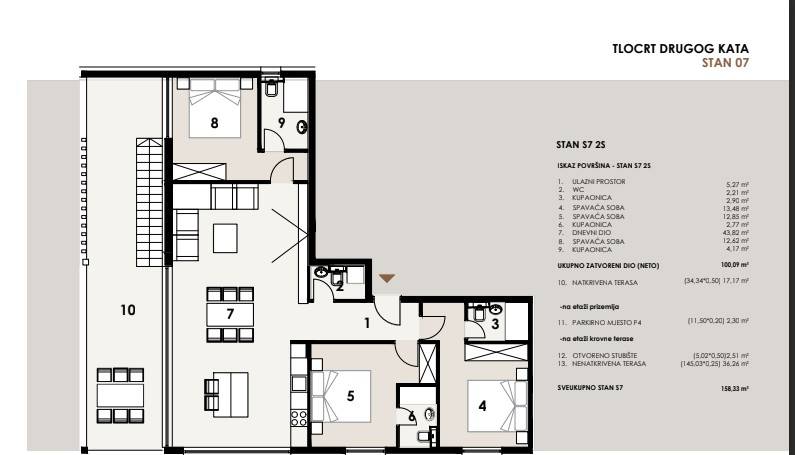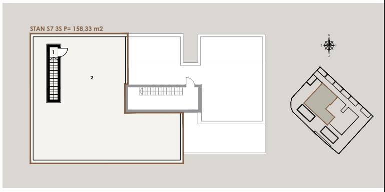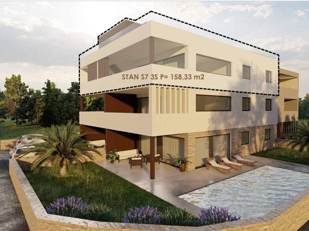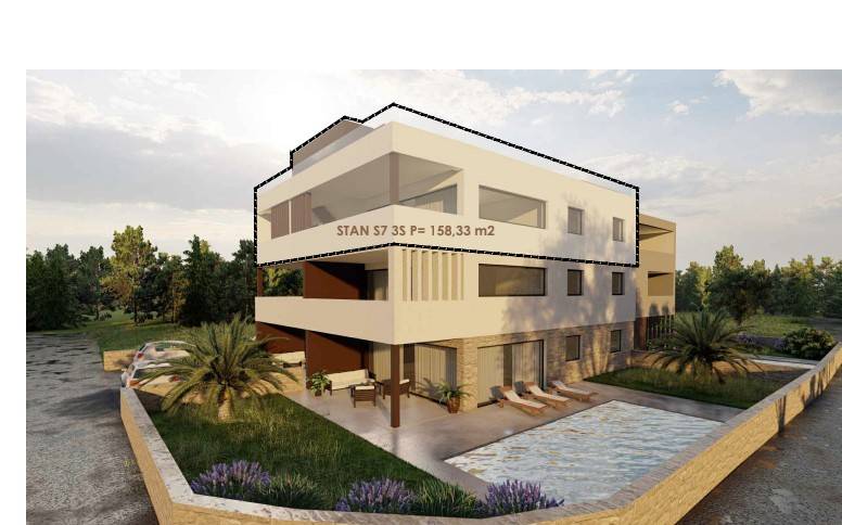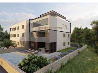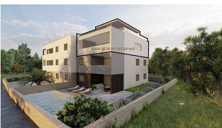 NOVOGRADNJA – prodaju se dva penthousa na 2. katu novogradnje ,samo 60 m od pješčane plaže, 2. red od mora. Sa terasa se pruža predivan pogled na more i otoke. Novogradnja sa 8 stambenih jedinica, smještenoj u mirnom dijelu Privlake. Zgrada je u gradnji, a useljenje se planira u svibnju 2026. Na 2. katu su na prodaju penthouse oznake S7 koji se sastoji od ulaznog prostora, kuhinje s blagavaonom i dnevnim boravkom,tri spavaće sobe, tri kupaone i wc-a, ukupno100,09 m2 stambeno, plus natkrivena terasa od 34 m2 po koef 0,5 17,17 m2) i jedno parkirno mjesto., te stubište i pripadajuća krovna terasa od 145 m2.Ukupno stan oznake S7 sa pripatcima ima 158,33 m2. Stan će biti kompletno namješten i namještaj je uključen u cijenu. Tražena cijena je 760 000 eura. Stan S8, penthouse, također smješten na 2. katu zgrade, sastoji se od ulaznog prostora, tri spavaće sobe, tri kupaone, kuhinje s blagavaonom i dnevnog boravka, ukupno stambeno 100,41 m2, plus terasa od 19,61 m2, jedno parkirno mjesto, te stubište i krovna terasa od 88,97 m2. Ukupno stan S8 sa pripatcima će imati 157,69 m2. Stan će biti kompletno namješten i takav se prodaje. Tražena cijena; 720 000 eura. • Vrhunska unutarnja stolarija • PVC stolarija s ALU roletama na elektro pogon, troslojno staklo s Low-e premazom, komarnici • Podovi: parket i keramika I. klase Dodatne pogodnosti: • Visok energetski standard (A razred) • Kupac ne plaća porez na promet nekretnina • U zgradi su na prodaju sljedeći stanovi: S1 - prizemlje, dvosoban stan sa vrtom 85,35 m² – 345.000,00 € S2 - prizemlje, dvosoban stan sa vrtom i bazenom 108,55 m² , kompletno namješten 545 000 eura. S3 – prizemlje, dvosoban stan sa vrtom i bazenom 97,87 m² - kompletno namješten 490.000 € . S4 - 1. kat, dvosoban stan 80,75 m² – 325.000,00 € S5 - 1. kat, dvosoban stan 80,70 m² – 365.000,00 € S6 – 1. kat, dvosoban stan 80,72 m² – 340.000,00 € S7 – 2. kat trosoban stan sa krovnom terasom 158,33 m² – 760.000,00 € (namješten). S8 - 2. kat, trosoban stan sa krovnom terasom 157,69 m² – 720.000,00 € (namješten). Četiri stana će biti kompletno namještena stanovi S2 i S3 u prizemlju i stanovi S7 i S8 na 2 katu . U cijenu je uključen namještaj, ostali se prodaju nenamješteni. Zgrada je u gradnji te se planira završetak do sezone 2026. godine.