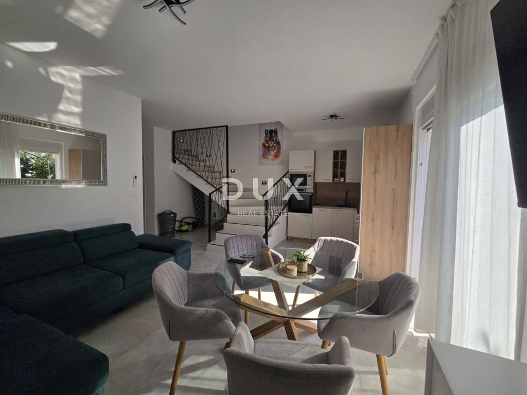 This modern villa is located just 3km from the first beaches and 3km from the city center. It extends over the ground floor and first floor and the total living area, together with the reduced area of the appurtenances, two parking lots and a garden, is 93.25m2. It consists of an entrance hall, living room with kitchen and dining room, one bedroom and a bathroom on the ground floor. An internal staircase leads to the first floor where there are two bedrooms and one bathroom. The villa was built with quality and quality and modern materials were used in the interior decoration. The property is fully furnished and is being sold as such. All rooms are air-conditioned and the bathrooms have underfloor heating.