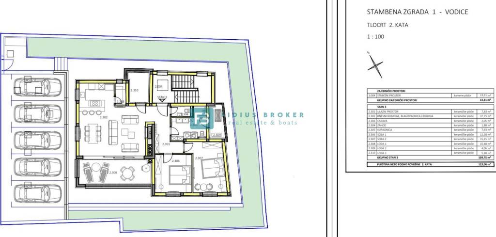 Apartment S3 is located on the 2nd floor of the building with a total net usable area of ​​109.59 m² (with 2 parking spaces). It consists of an entrance hall, kitchen with pantry, dining room, spacious living room (37.75 m²) with access to a covered loggia of 15.40 m² with a panoramic sea view, two bedrooms, bathroom, separate toilet, two covered loggias. The apartment has two parking spaces.