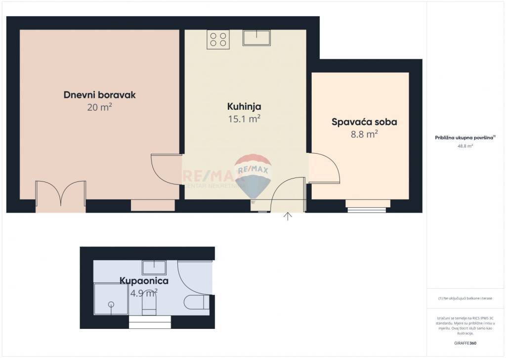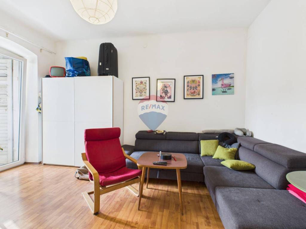 RE/MAX Centar nekretnina presents a one-bedroom apartment of 50 m², located in an excellent area near the wider city center of Pula. The apartment is situated on the first floor of a building with four units. It has a well-designed layout and consists of a kitchen with dining area, a spacious living room with access to the balcony, one bedroom, a bathroom, and an entrance hall. The apartment is being sold partially furnished. Heating and cooling are provided by an air conditioning unit. The location is extremely convenient – all necessary amenities (schools, universities, shops, kindergartens, cafés, bakeries) are within walking distance. The historic city center is only a 5-minute walk away.
