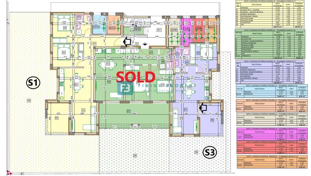 Apartment S4 is located on the 1st floor with a total usable area of 88.35 m2 (living area 76.28 m2 + terrace 10.88 m2 + storage room 4.13 m2 + parking 12.50 m2). It consists of an entrance area and hallway, three bedrooms, toilet, bathroom, kitchen with dining room and living room with access to a beautiful covered terrace of 10.88 m2 with a view of the sea. The apartment has a storage room of 4.13 m2 and a parking space. The price is €282,500 (VAT included - the buyer is exempt from paying 3% real estate tax).