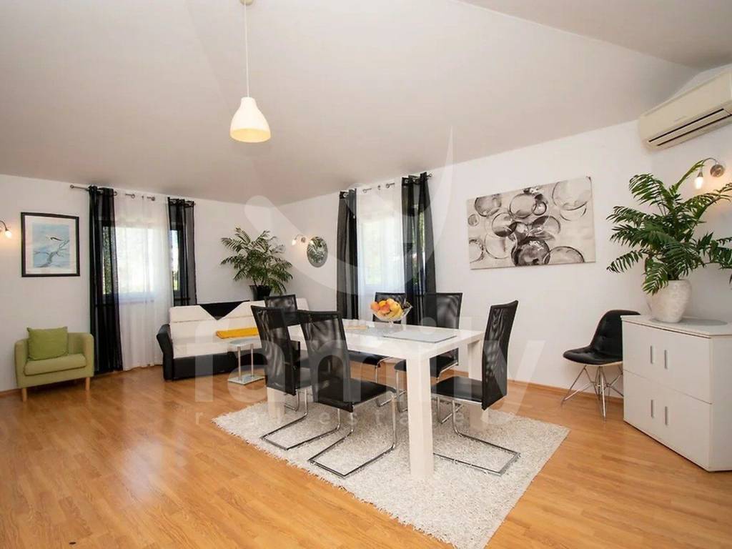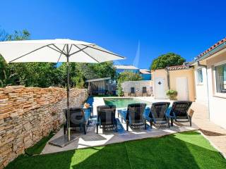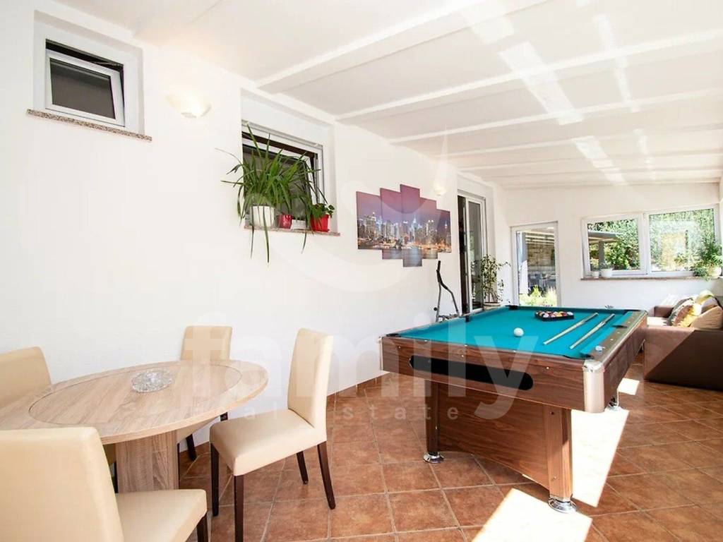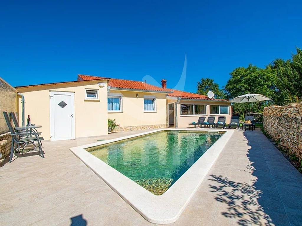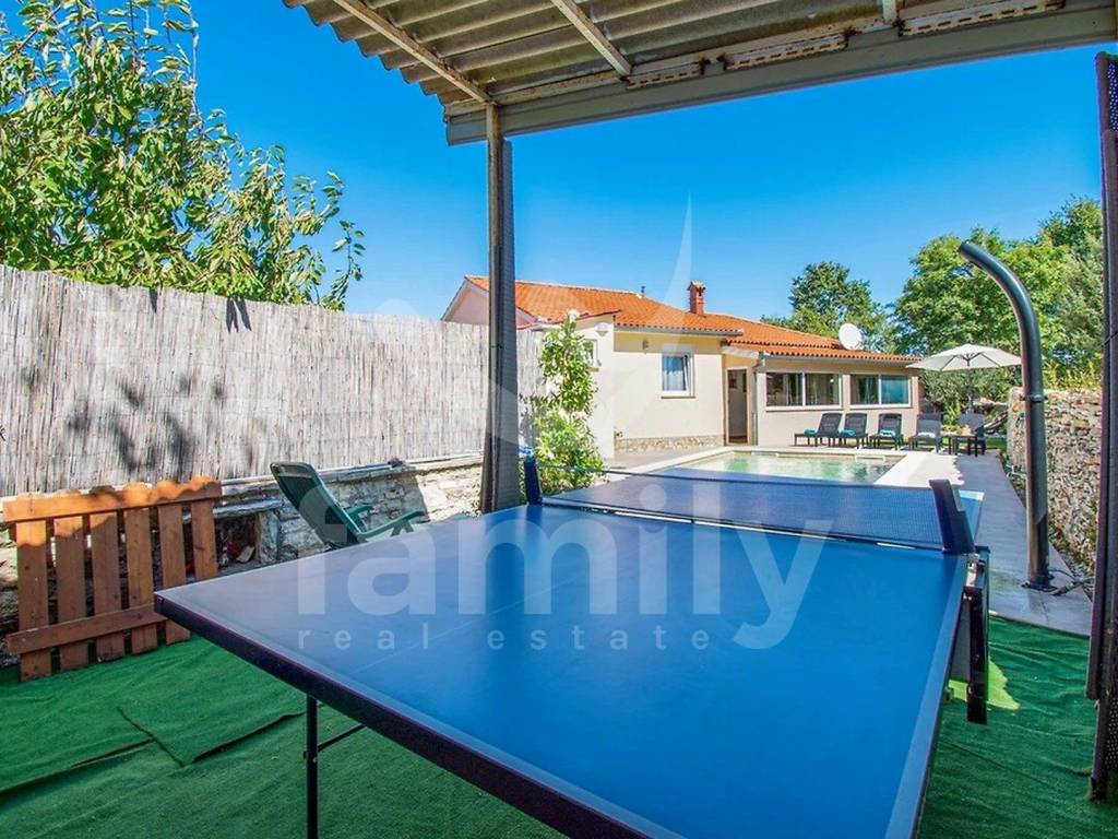 The house is located in a quiet Istrian village just 15 km from Pula, and represents an ideal opportunity for buyers looking for privacy, nature and a pleasant Mediterranean lifestyle. Surrounded by greenery and set on a fully fenced plot of 580 m², this charming single-storey house offers the perfect balance between comfort, relaxation and entertainment. The house has 162 m² of living space and can comfortably accommodate up to 6 people. The interior is functionally organized and includes a spacious living room connected to the dining room and a fully equipped kitchen, creating a pleasant space for socializing and family moments. The floors are covered with ceramic and laminate flooring, PVC joinery has been installed, and heating and cooling are regulated by air conditioning. There are three bedrooms – two with double beds and one with two single beds – which makes this property ideal for a family or guests. A special atmosphere is provided by the outdoor area, where there is a private swimming pool surrounded by a well-kept garden, perfect for relaxing during warm summer days. In the immediate vicinity of the pool there is a covered terrace with an outdoor dining area and an outdoor kitchen with a barbecue, ideal for enjoying long dinners outdoors. For additional entertainment and relaxation, the house also offers billiards in the lobby, as well as table tennis and darts, which makes the stay pleasant at any time of the year. The property also has private parking spaces within the property, and thanks to its quiet location and proximity to Pula and the beautiful Istrian beaches, it represents an excellent opportunity for both personal use and as an investment for tourist rental.